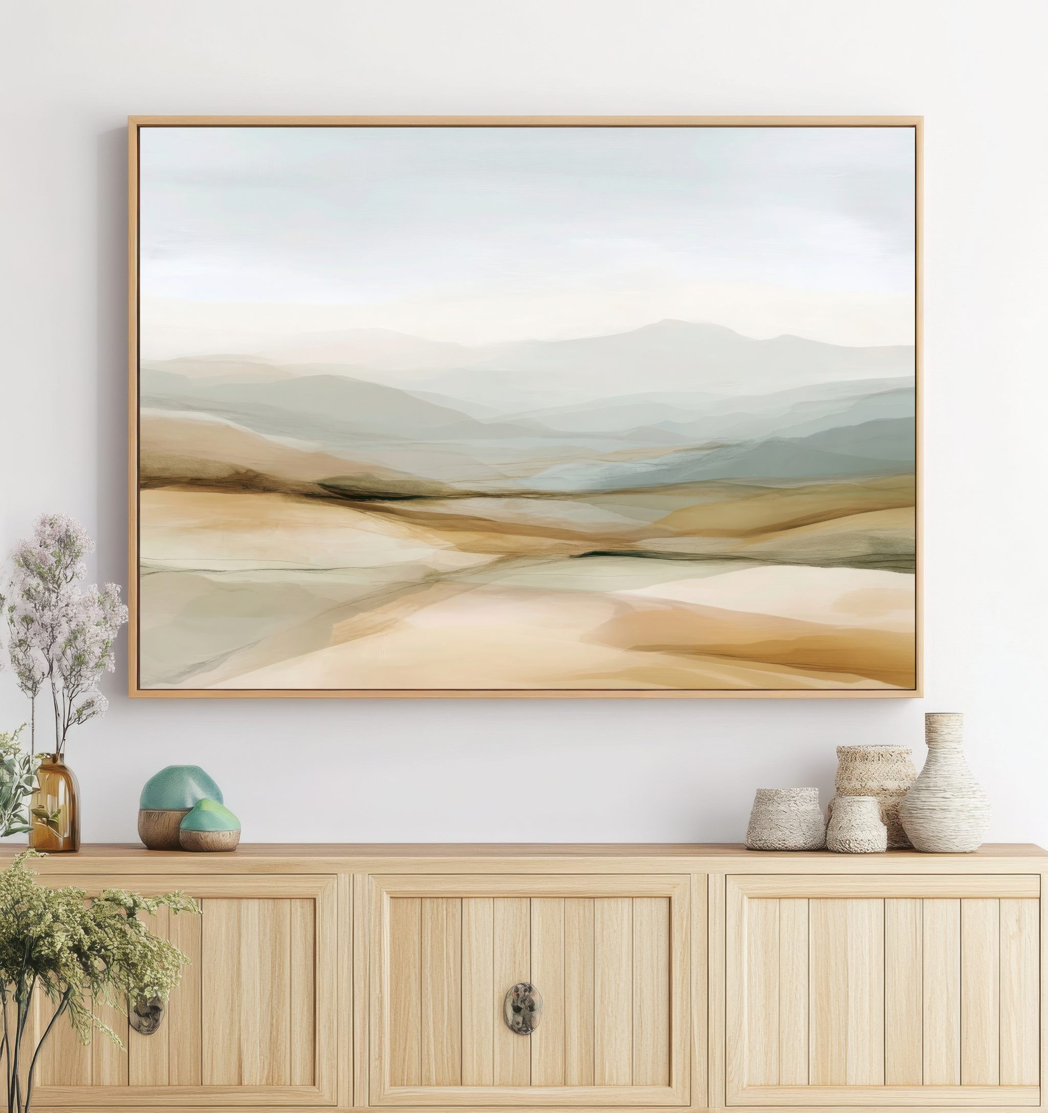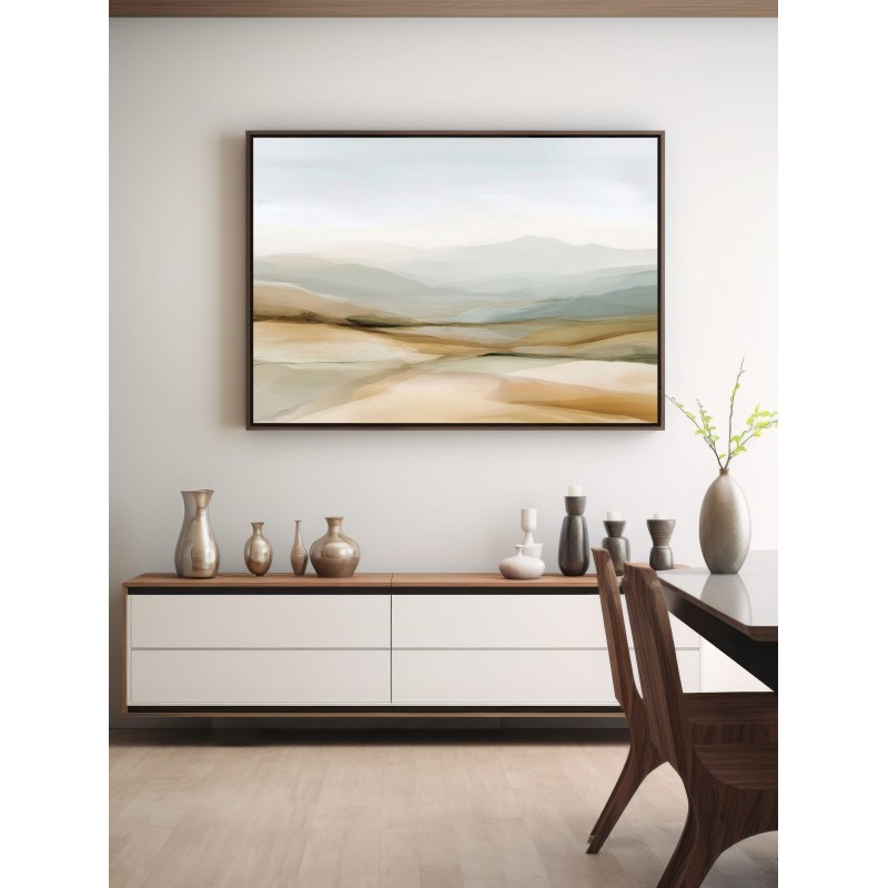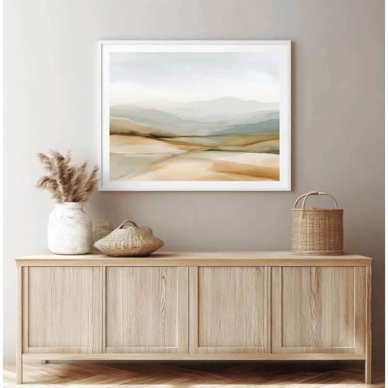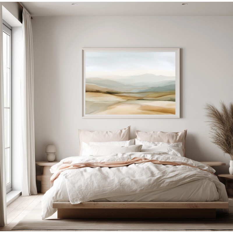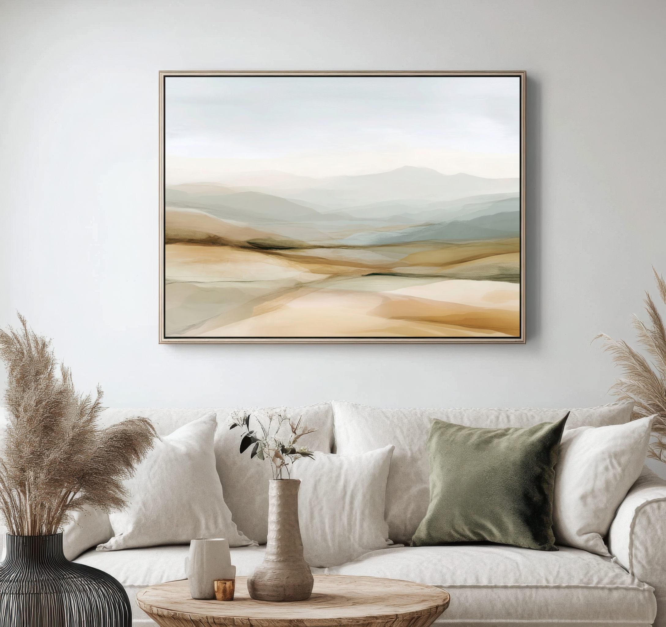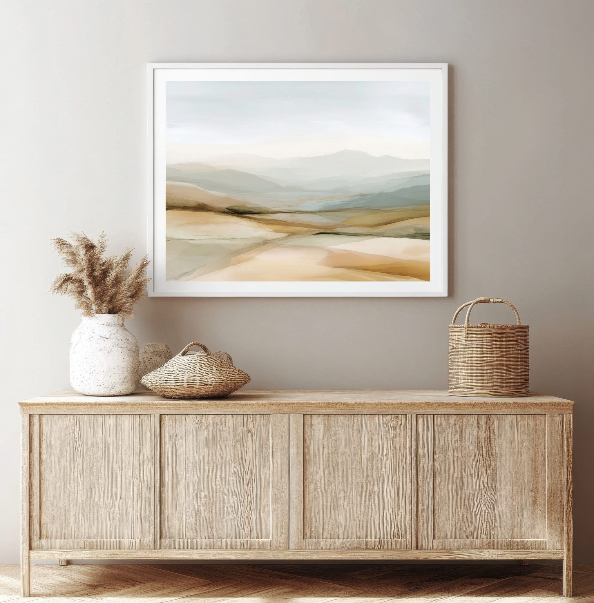 Questo quadro astratto minimalista raffigura un paesaggio etereo composto da colline morbide e stratificate, immerse in toni neutri, sabbia, beige e verdi delicati. Le sfumature leggere e la composizione orizzontale creano un effetto visivo rilassante e armonioso, ideale per ambienti luminosi. Perfetto come quadro moderno per soggiorno, camera da letto o studio, si integra con stili minimal, Japandi e contemporanei, donando equilibrio, eleganza e una sensazione di calma naturale agli spazi.