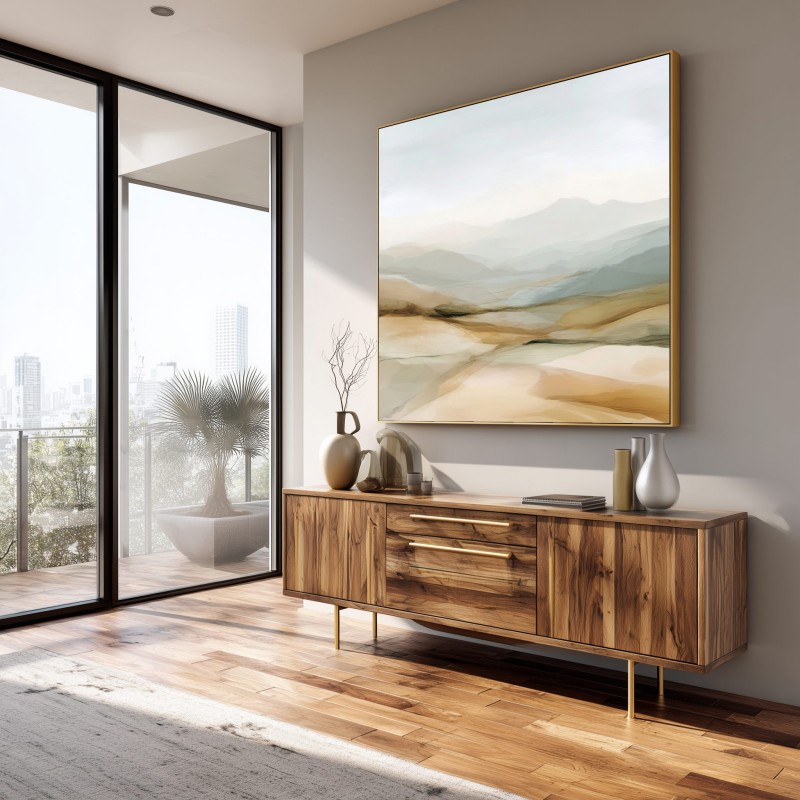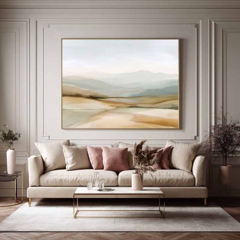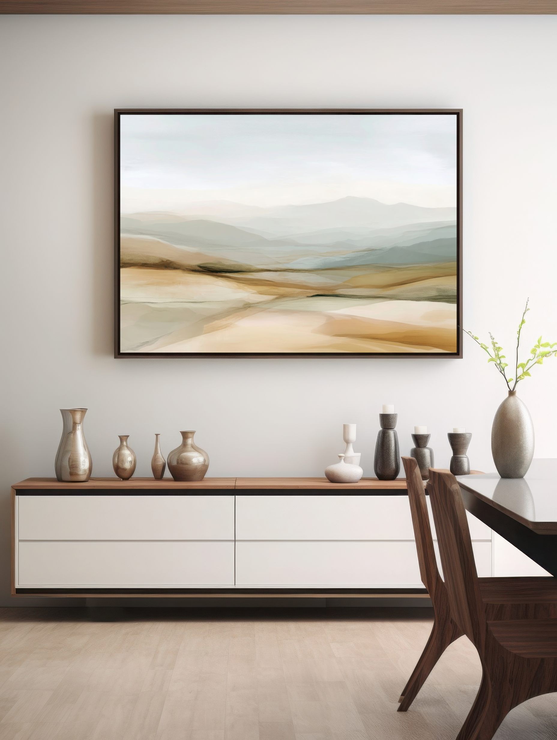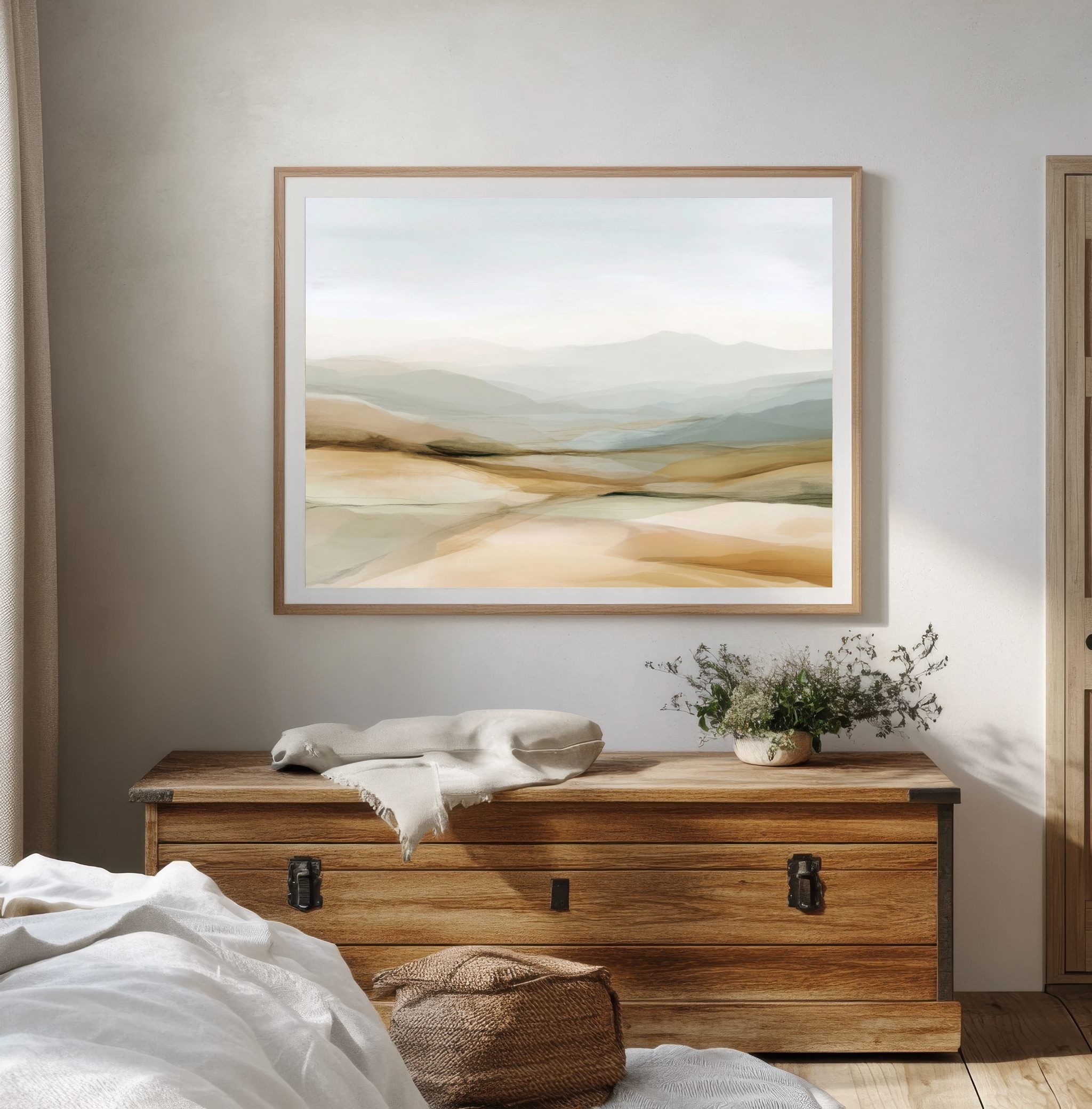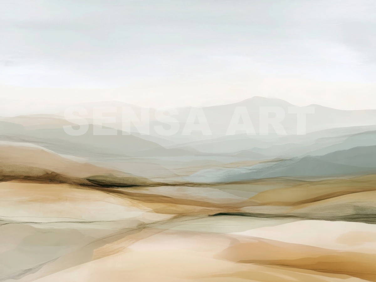 Questo quadro astratto minimalista raffigura un paesaggio etereo composto da colline morbide e stratificate, immerse in toni neutri, sabbia, beige e verdi delicati. Le sfumature leggere e la composizione orizzontale creano un effetto visivo rilassante e armonioso, ideale per ambienti luminosi. Perfetto come quadro moderno per soggiorno, camera da letto o studio, si integra con stili minimal, Japandi e contemporanei, donando equilibrio, eleganza e una sensazione di calma naturale agli spazi.
