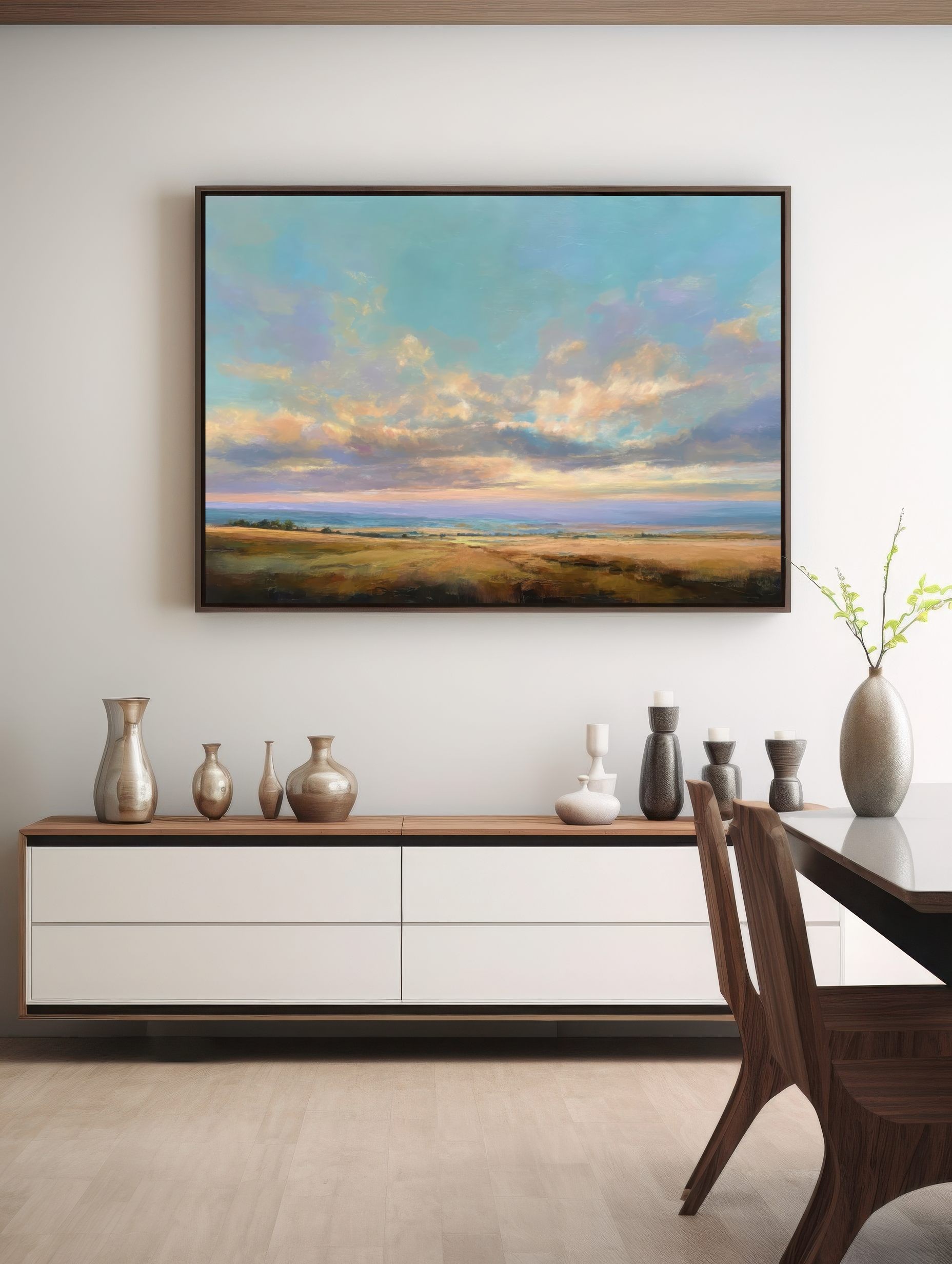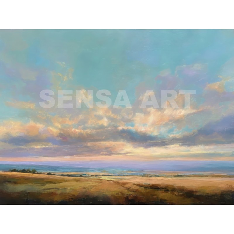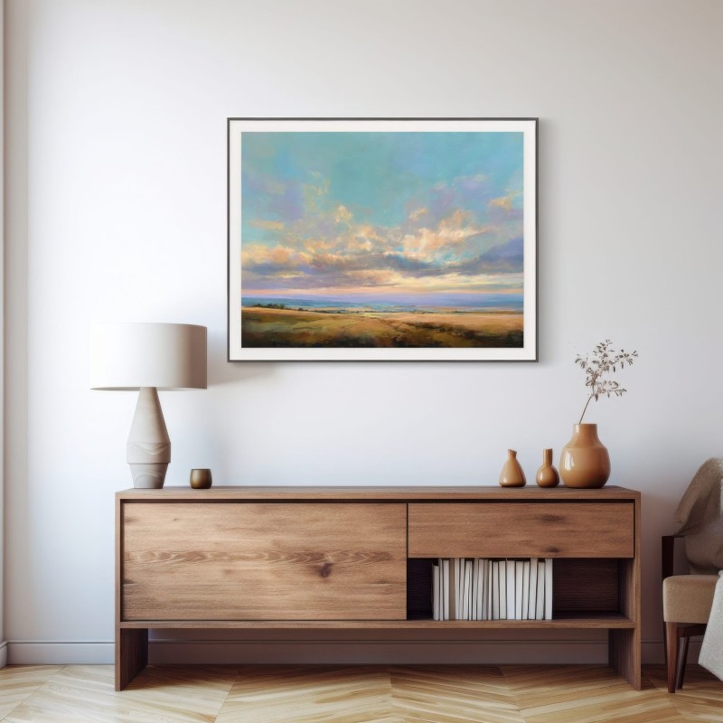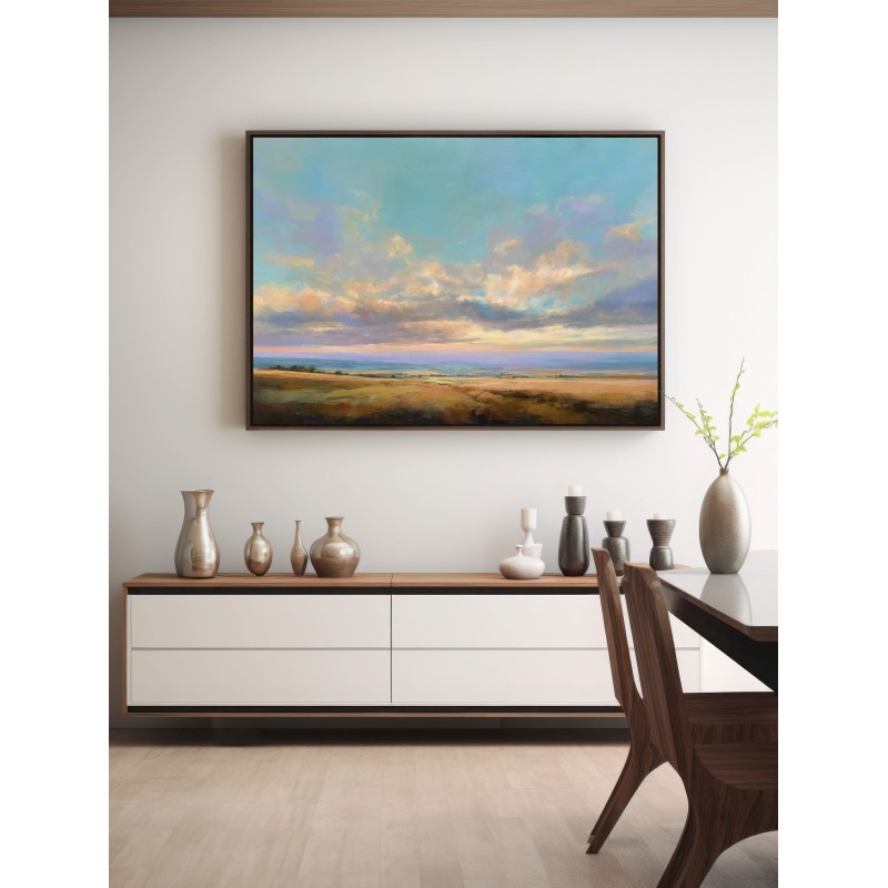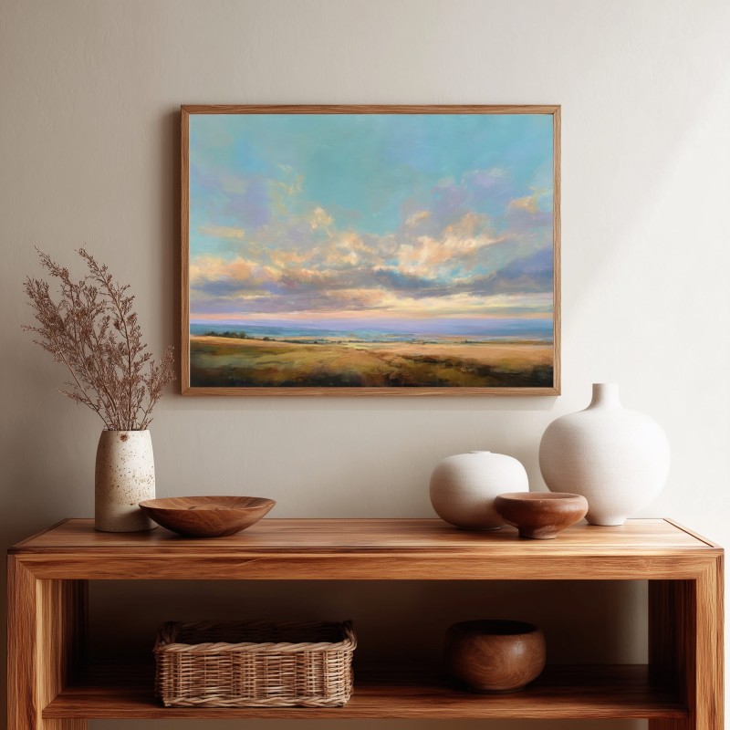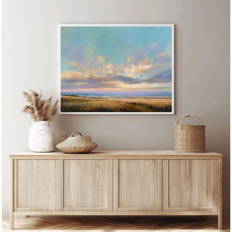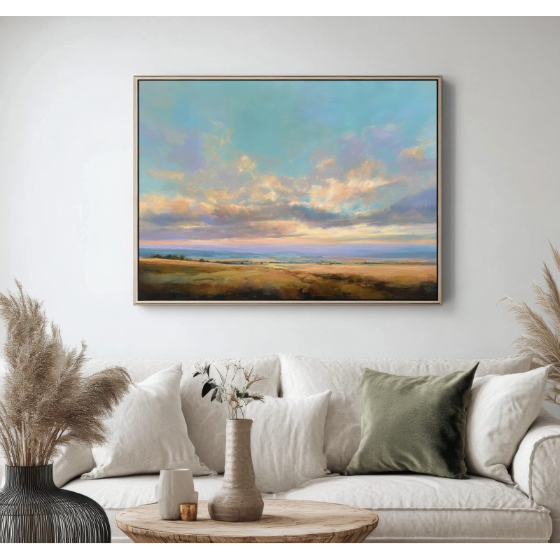 Questo quadro astratto contemporaneo raffigura un paesaggio aperto dominato da un cielo ampio e luminoso, attraversato da nuvole morbide e sfumature pastello. I toni caldi dei campi dorati si fondono con azzurri e verdi delicati, creando una composizione equilibrata e rilassante. Ideale come quadro moderno per soggiorno, camera da letto o studio, è perfetto per ambienti minimal, naturali e Japandi, dove dona luce, profondità e una sensazione di calma visiva.