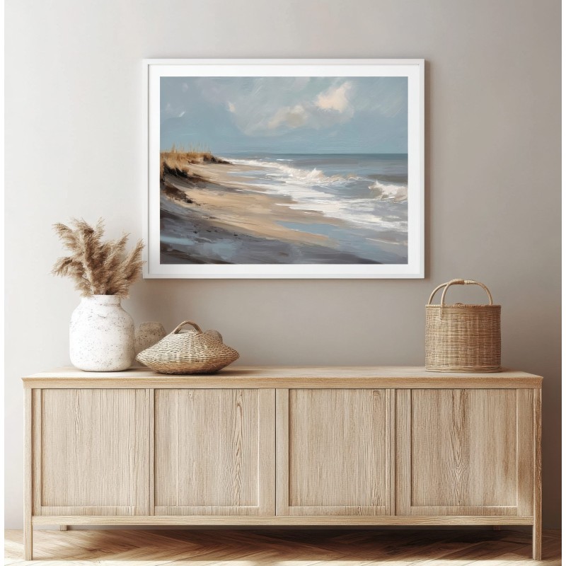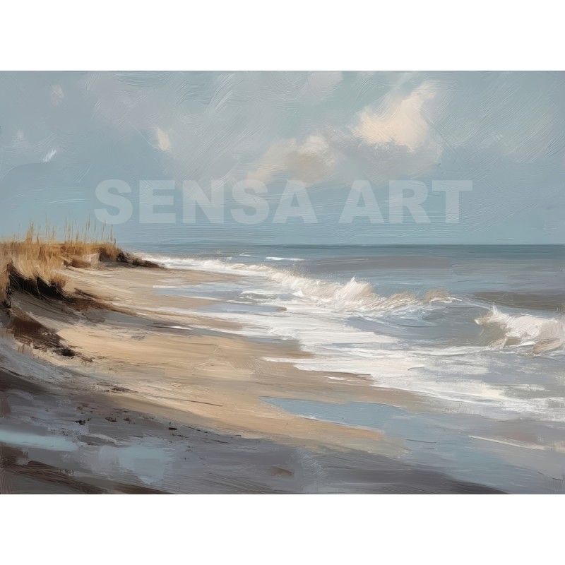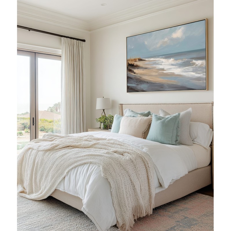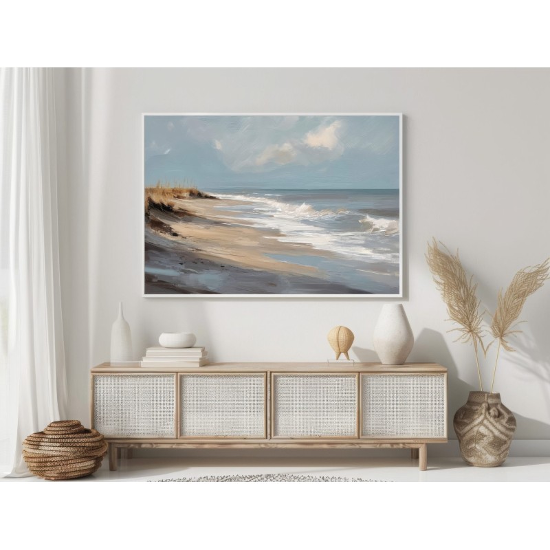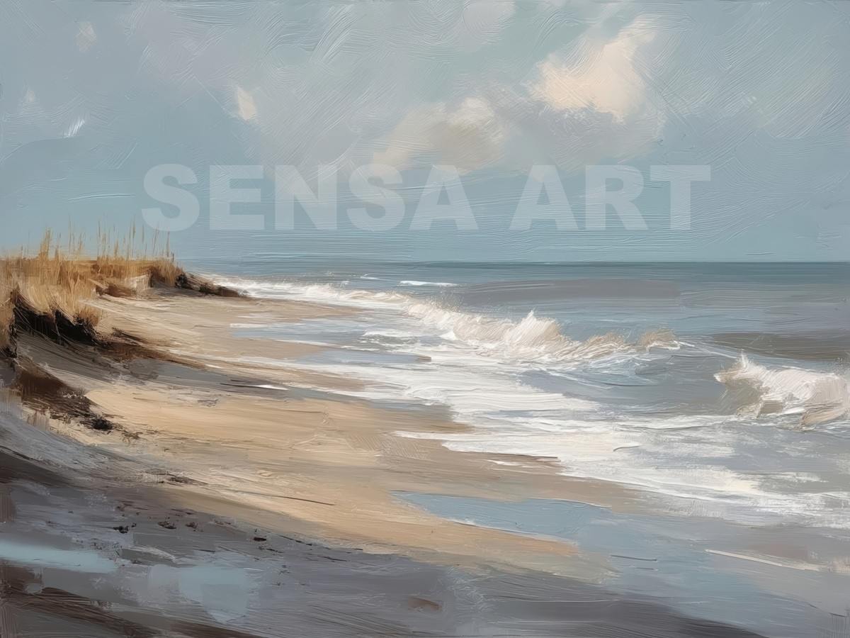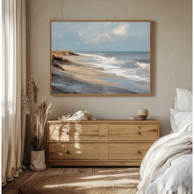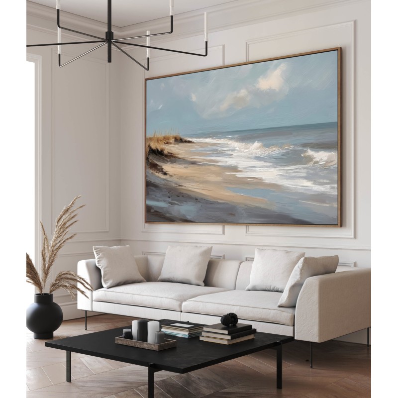 Questo quadro astratto di paesaggio marino raffigura una spiaggia silenziosa attraverso pennellate ampie e materiche, dove i toni sabbia, beige e azzurri polverosi si fondono con delicate sfumature grigio-perla. La composizione trasmette calma, equilibrio e naturalezza, evocando il ritmo lento delle onde e l’aria salmastra della costa. Ideale come quadro decorativo per soggiorni luminosi, camere da letto rilassanti o ambienti in stile moderno, minimal e Japandi, dona profondità e serenità visiva.