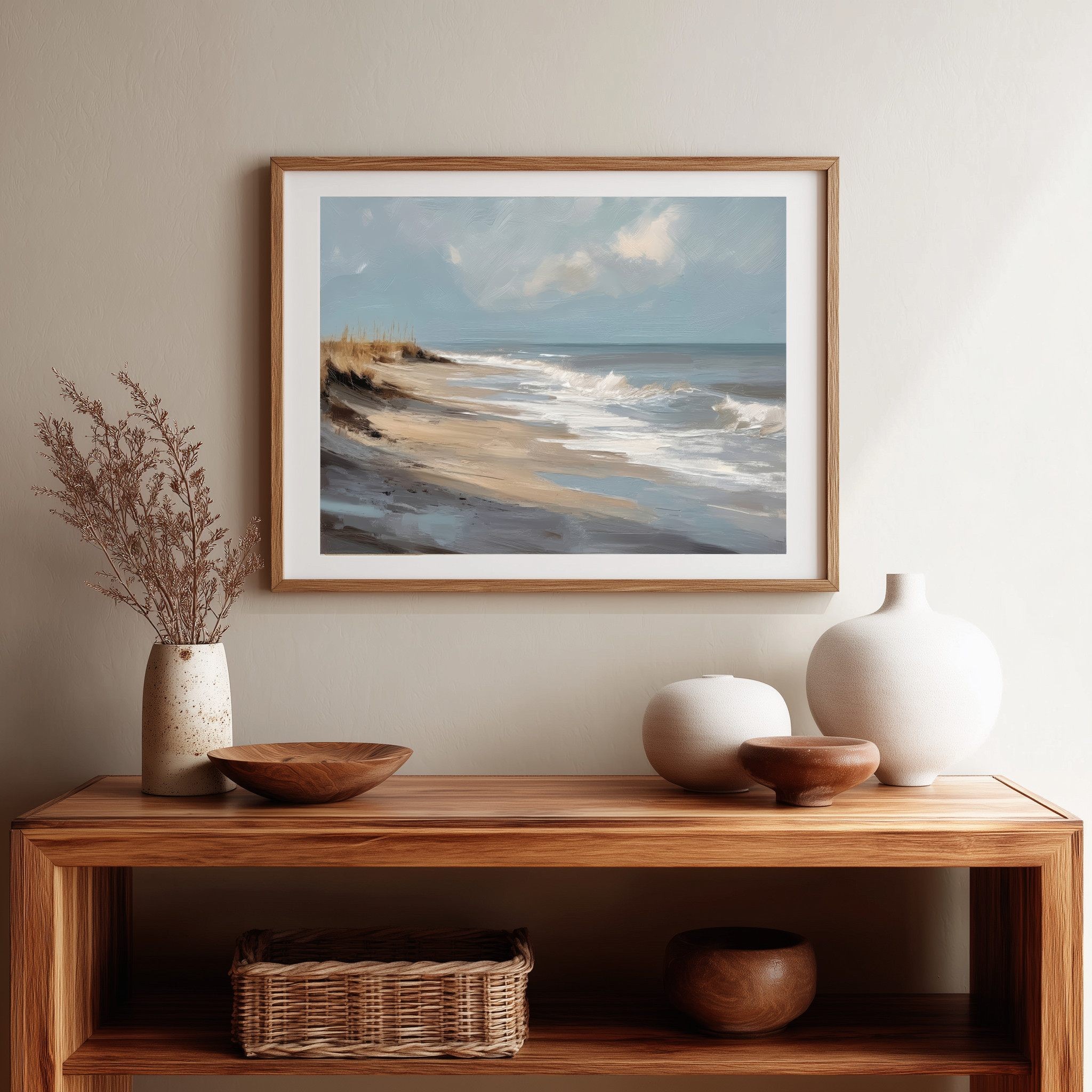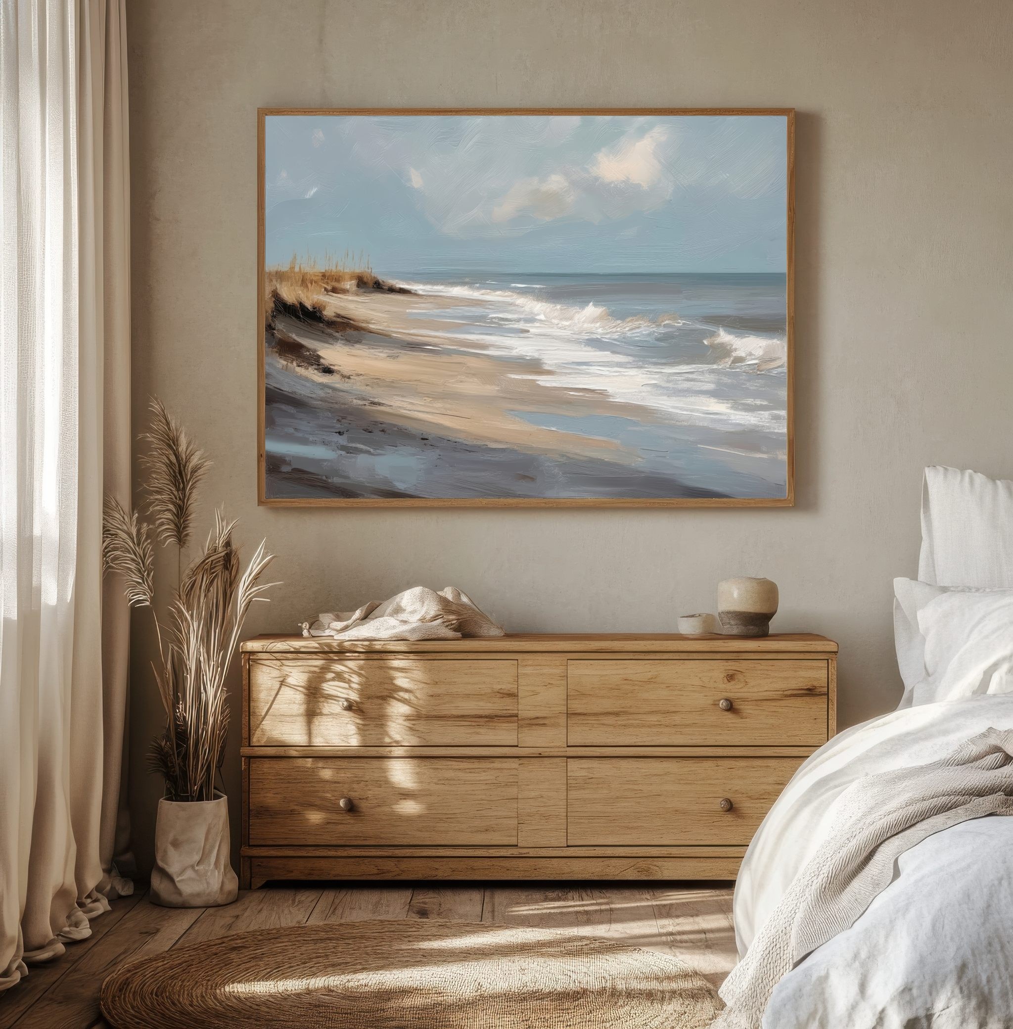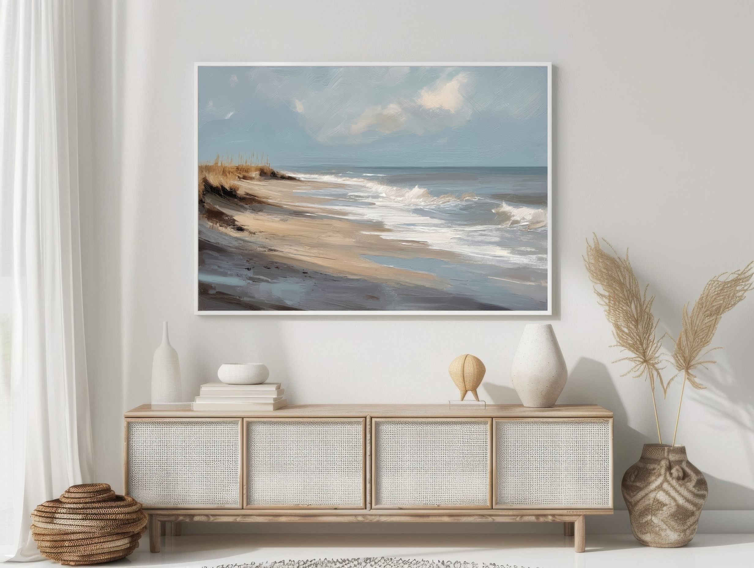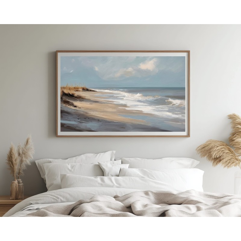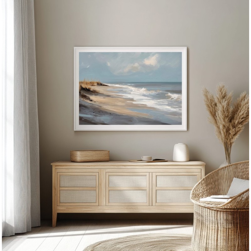 Questo quadro astratto di paesaggio marino raffigura una spiaggia silenziosa attraverso pennellate ampie e materiche, dove i toni sabbia, beige e azzurri polverosi si fondono con delicate sfumature grigio-perla. La composizione trasmette calma, equilibrio e naturalezza, evocando il ritmo lento delle onde e l’aria salmastra della costa. Ideale come quadro decorativo per soggiorni luminosi, camere da letto rilassanti o ambienti in stile moderno, minimal e Japandi, dona profondità e serenità visiva.