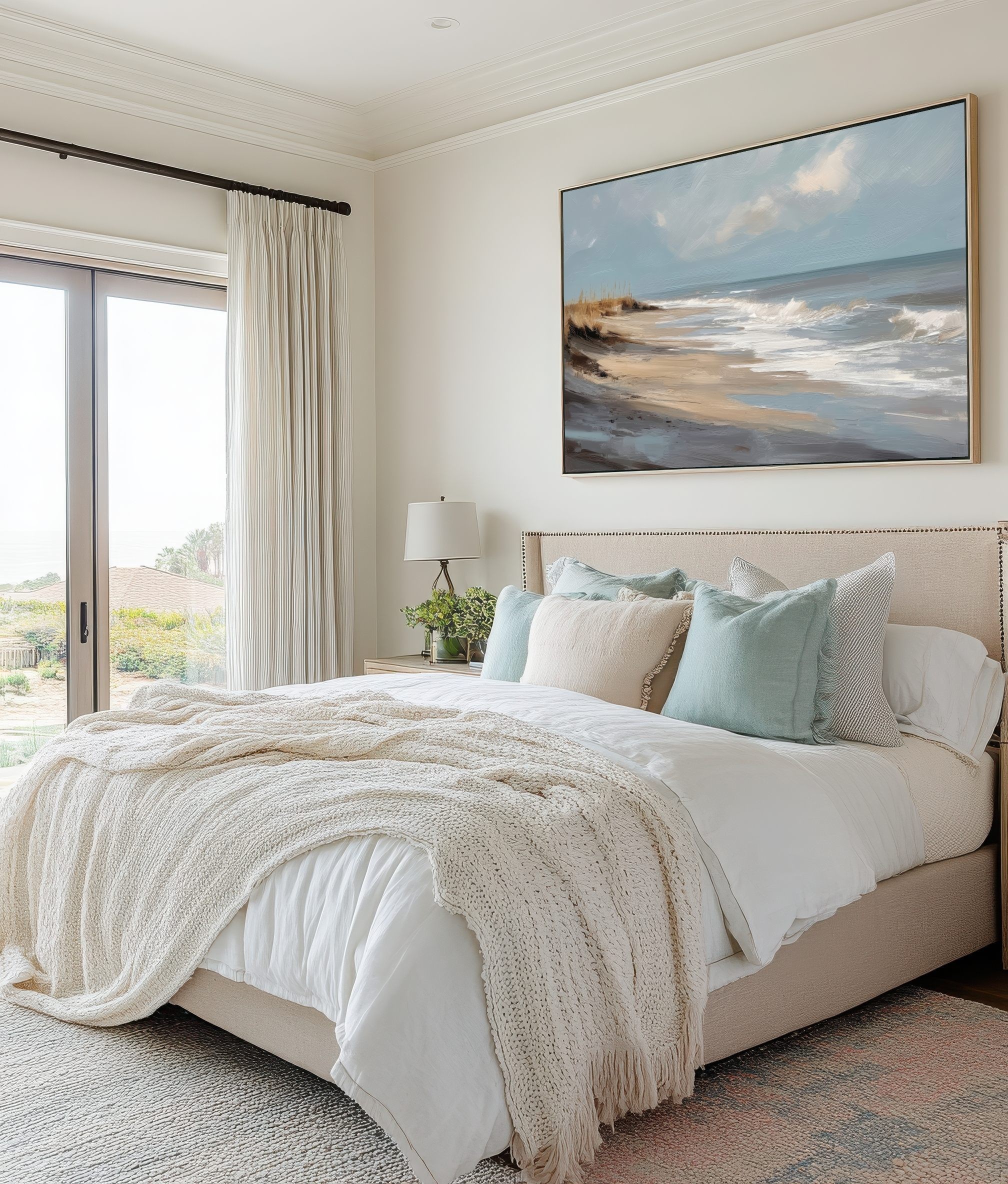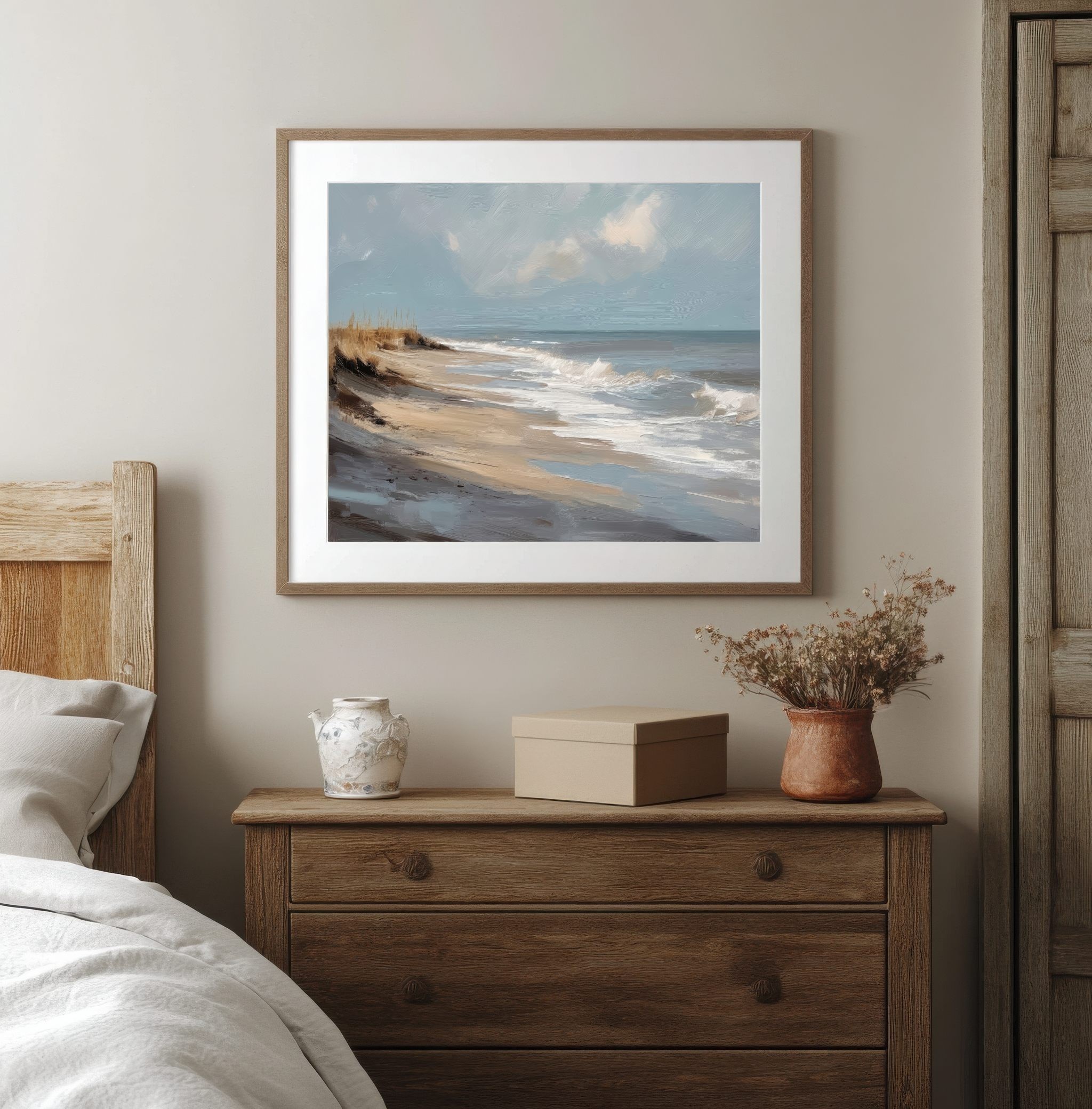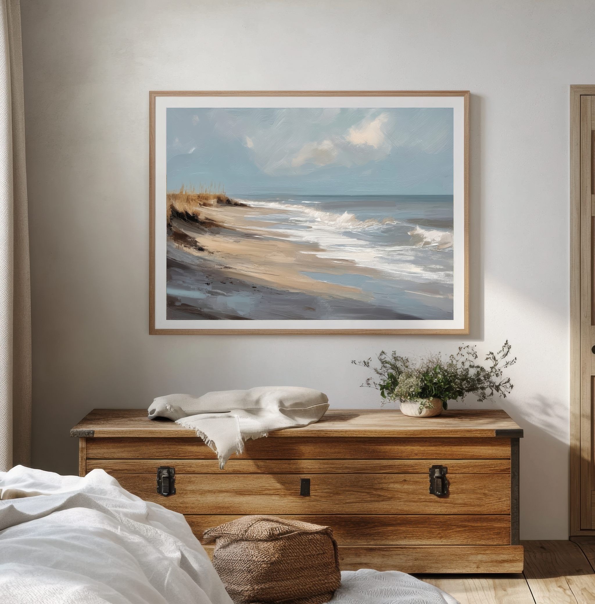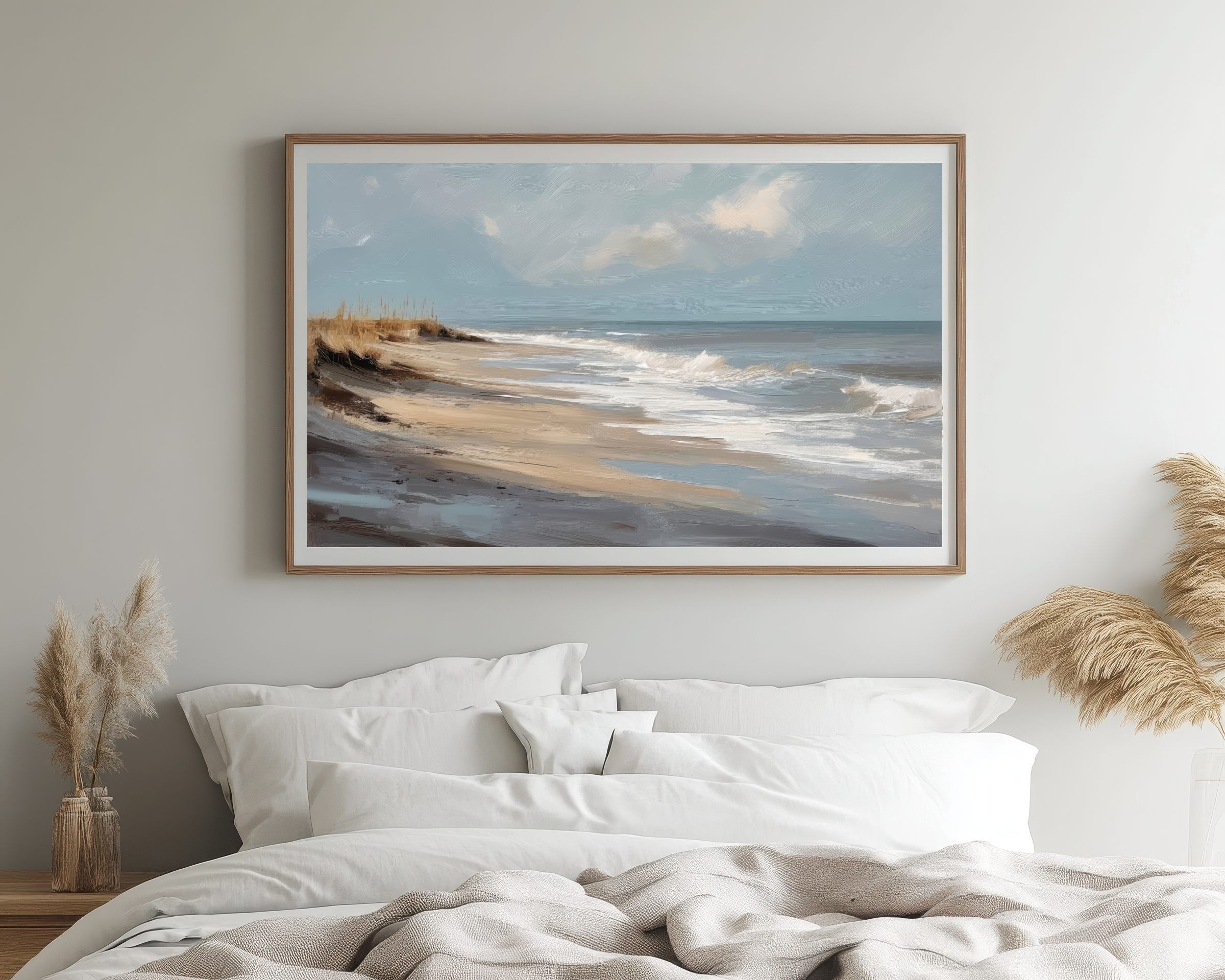 Questo quadro astratto di paesaggio marino raffigura una spiaggia silenziosa attraverso pennellate ampie e materiche, dove i toni sabbia, beige e azzurri polverosi si fondono con delicate sfumature grigio-perla. La composizione trasmette calma, equilibrio e naturalezza, evocando il ritmo lento delle onde e l’aria salmastra della costa. Ideale come quadro decorativo per soggiorni luminosi, camere da letto rilassanti o ambienti in stile moderno, minimal e Japandi, dona profondità e serenità visiva.