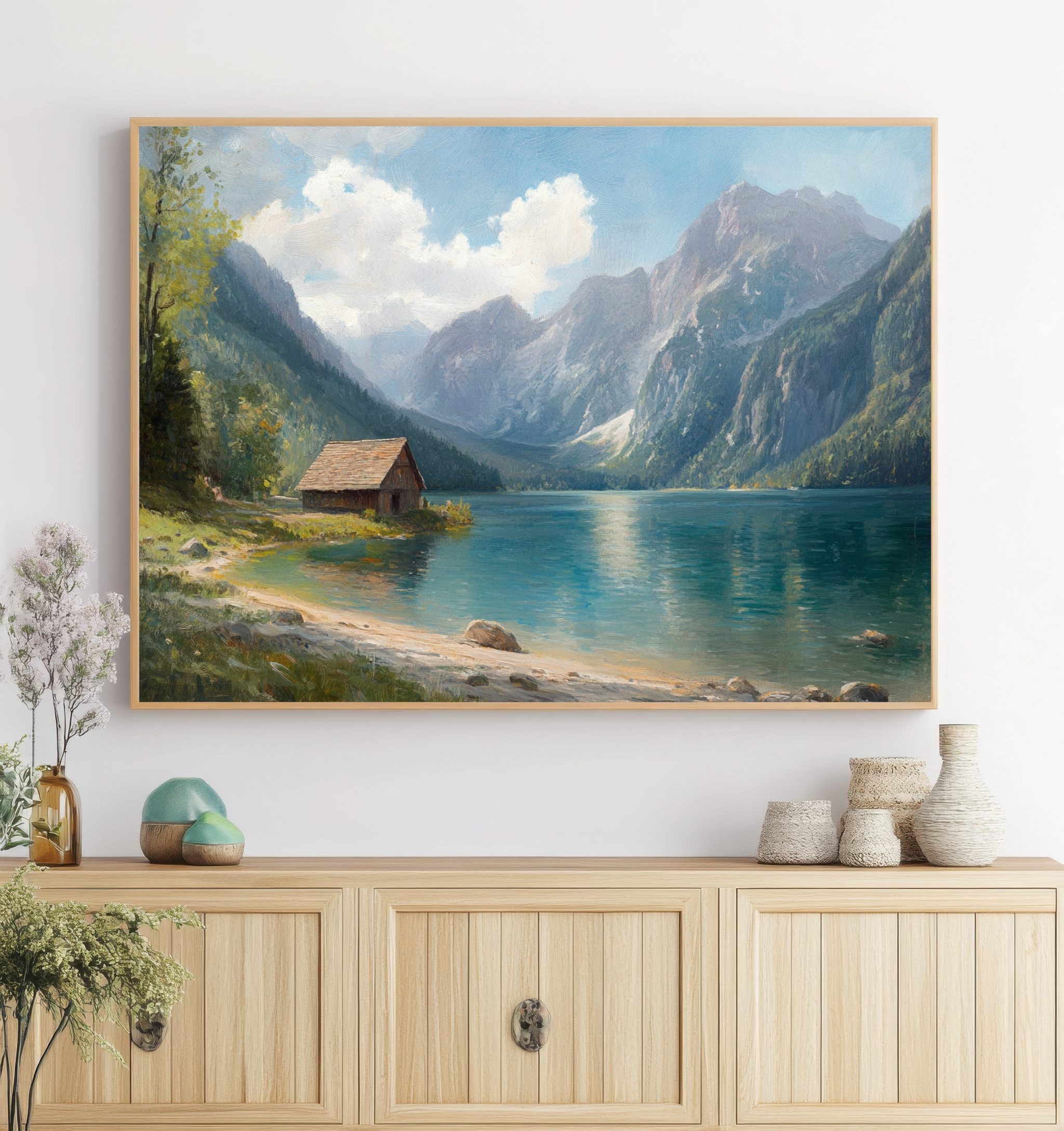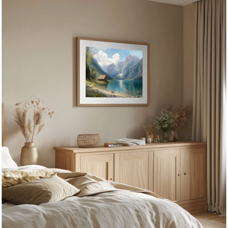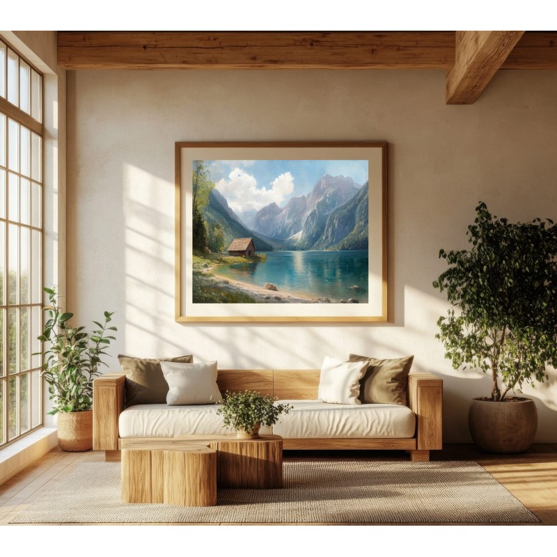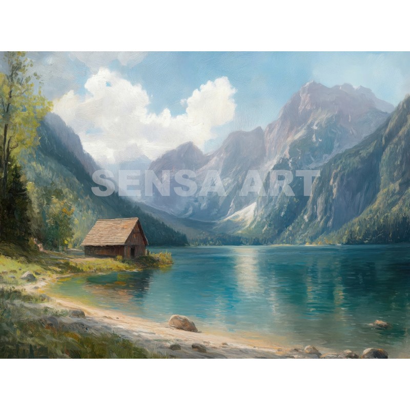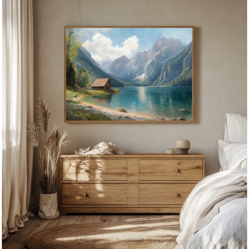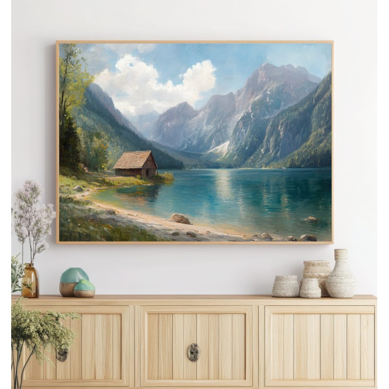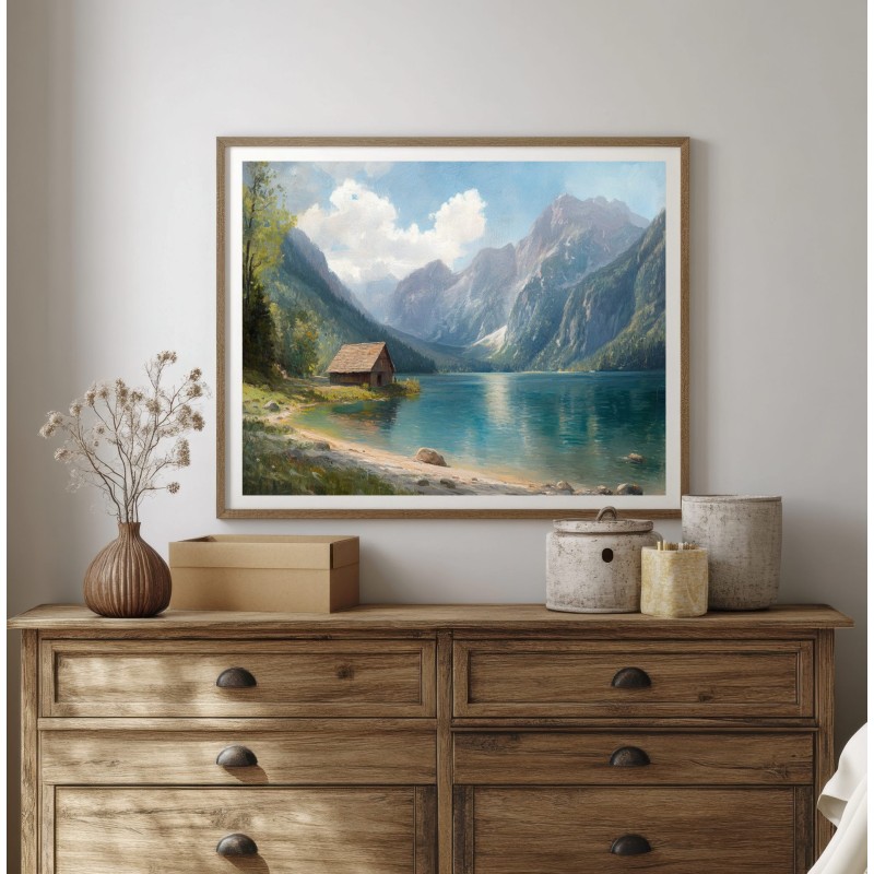 Questo quadro raffigurante un lago di montagna cattura la bellezza tranquilla di un paesaggio alpino immerso nella natura. Le maestose montagne si riflettono sull’acqua cristallina mentre un piccolo chalet in legno sulla riva aggiunge un tocco di calore e autenticità alla scena.