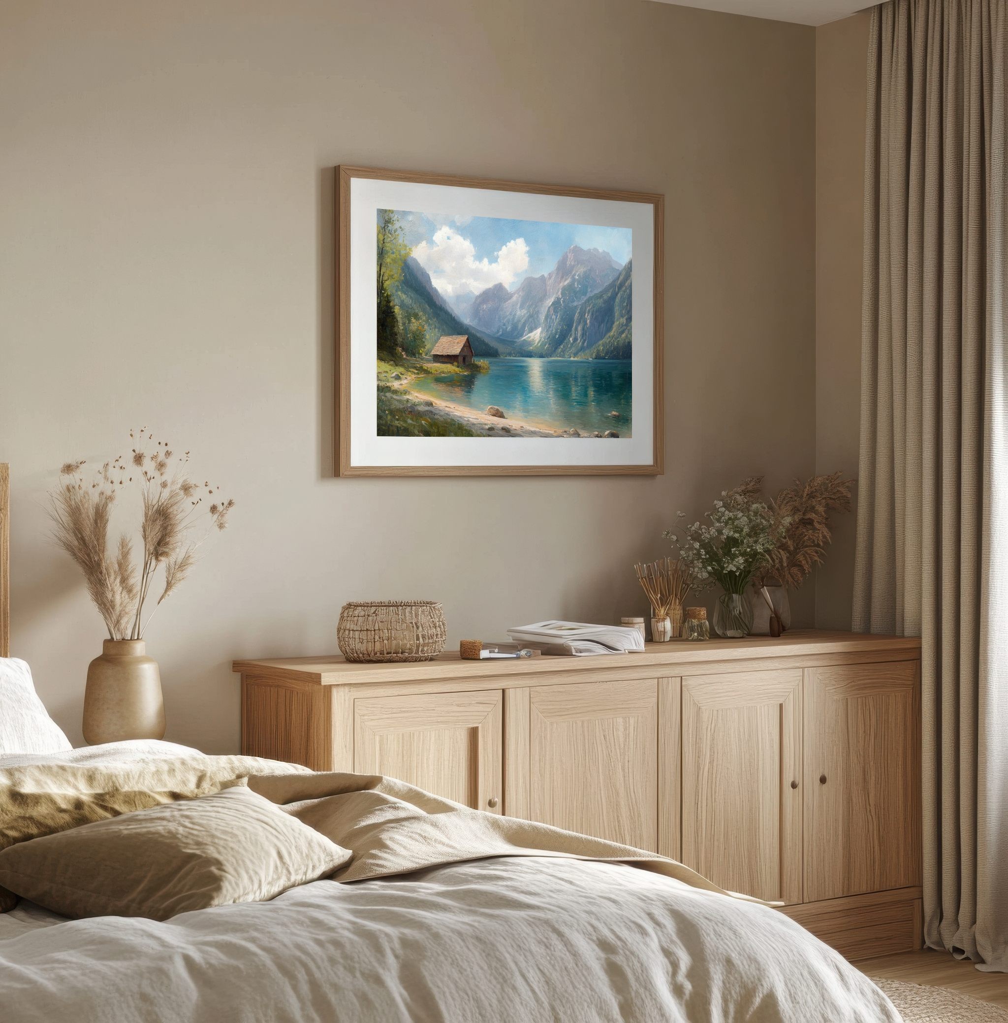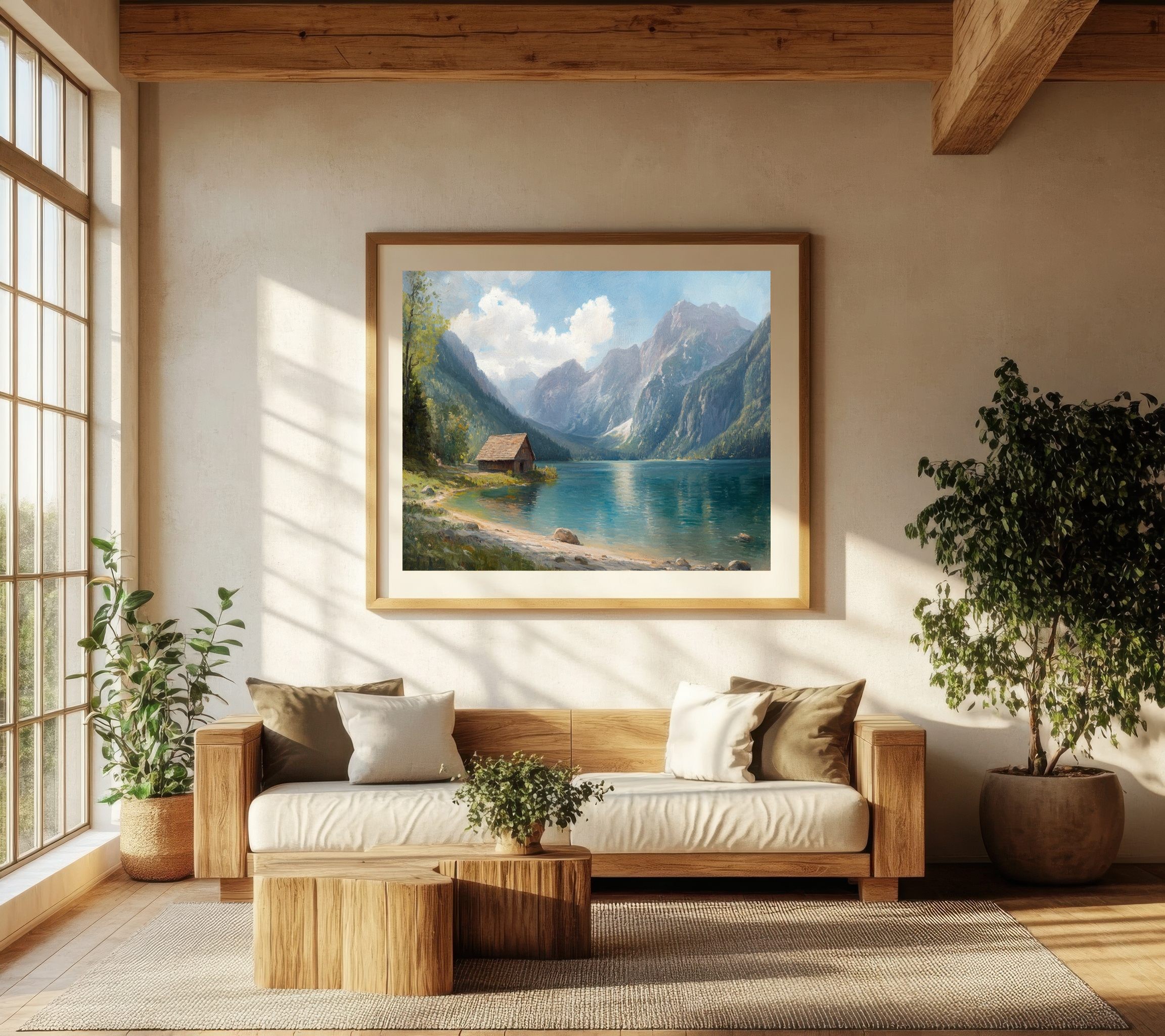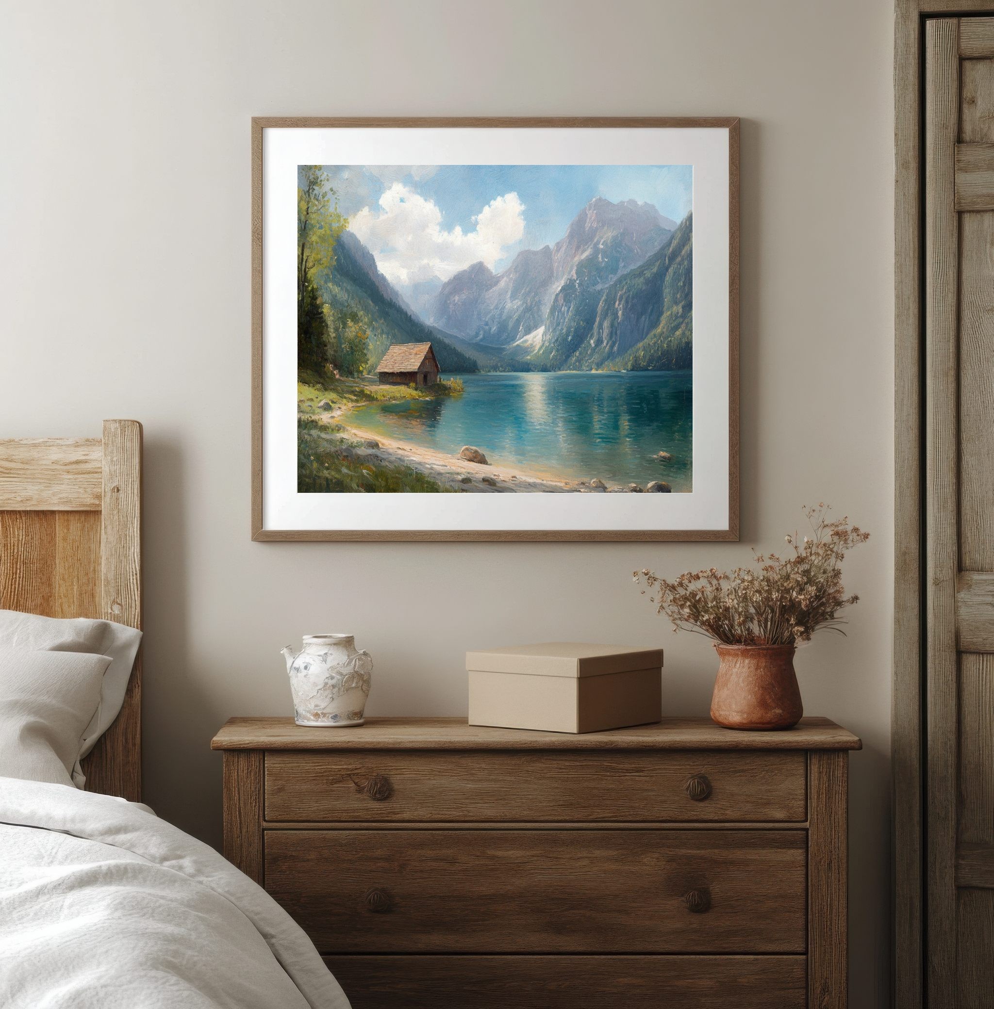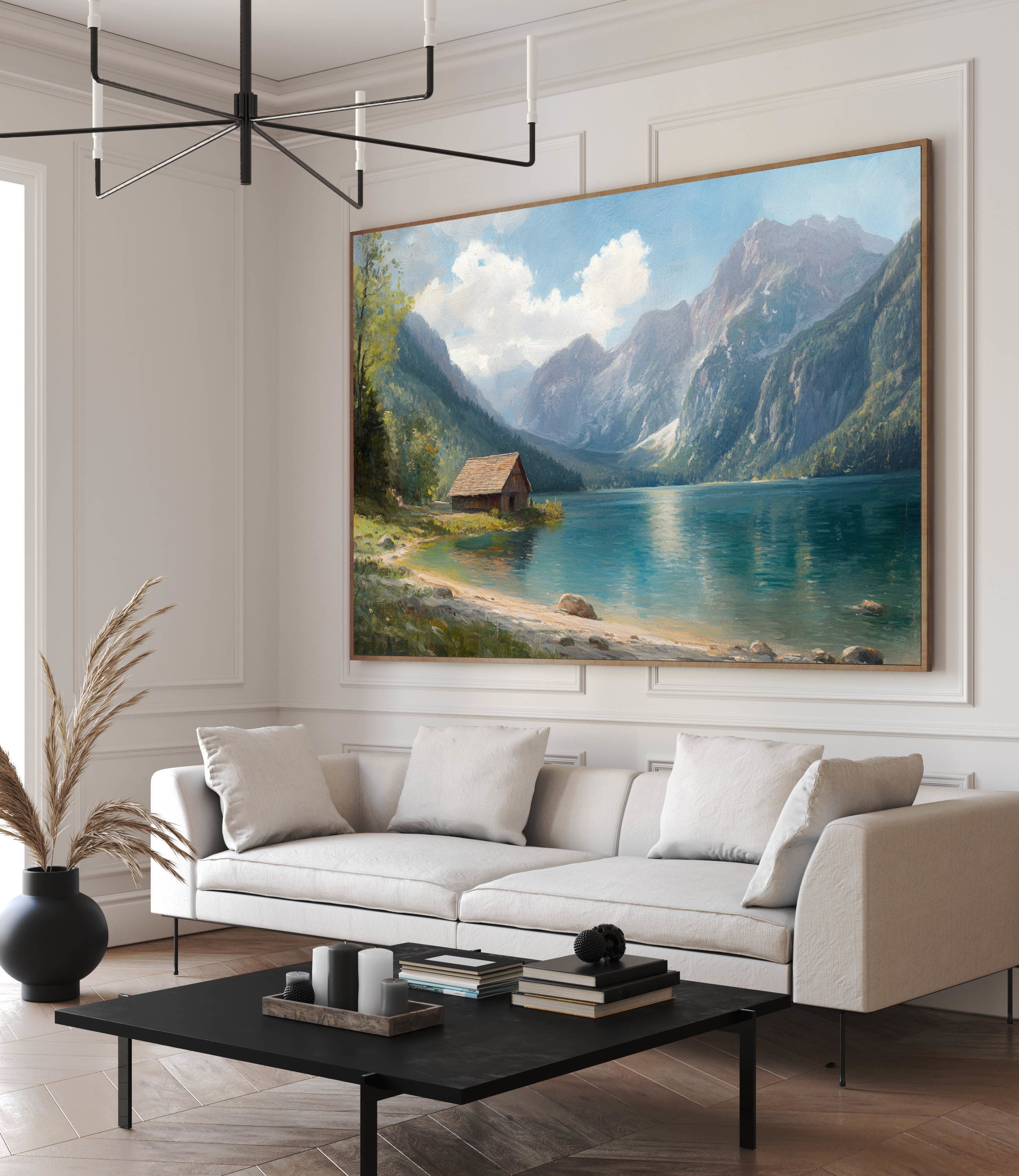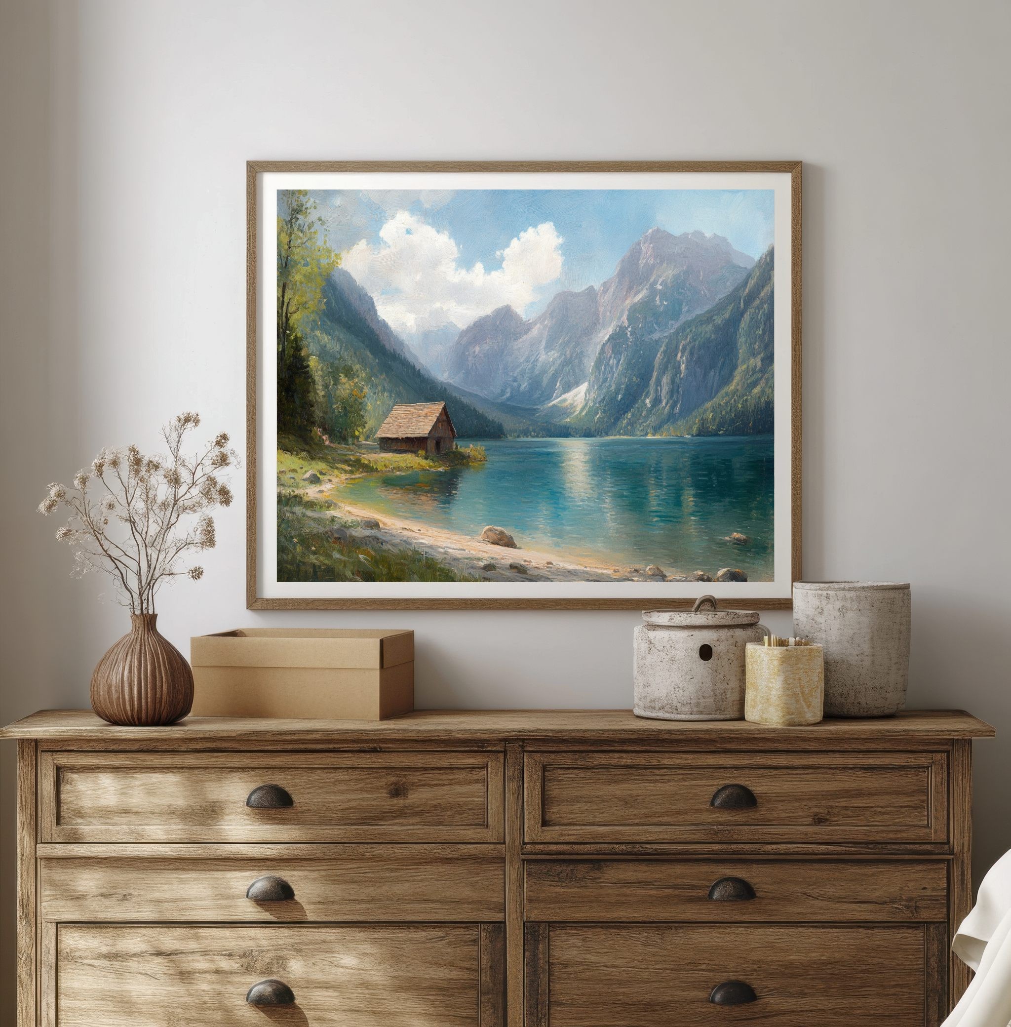 Questo quadro raffigurante un lago di montagna cattura la bellezza tranquilla di un paesaggio alpino immerso nella natura. Le maestose montagne si riflettono sull’acqua cristallina mentre un piccolo chalet in legno sulla riva aggiunge un tocco di calore e autenticità alla scena.