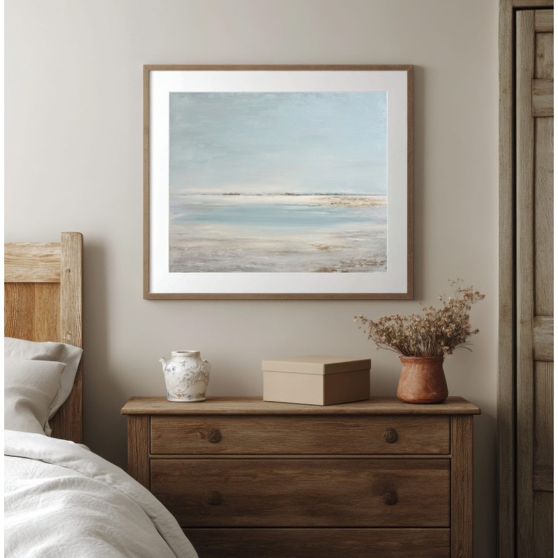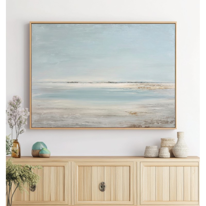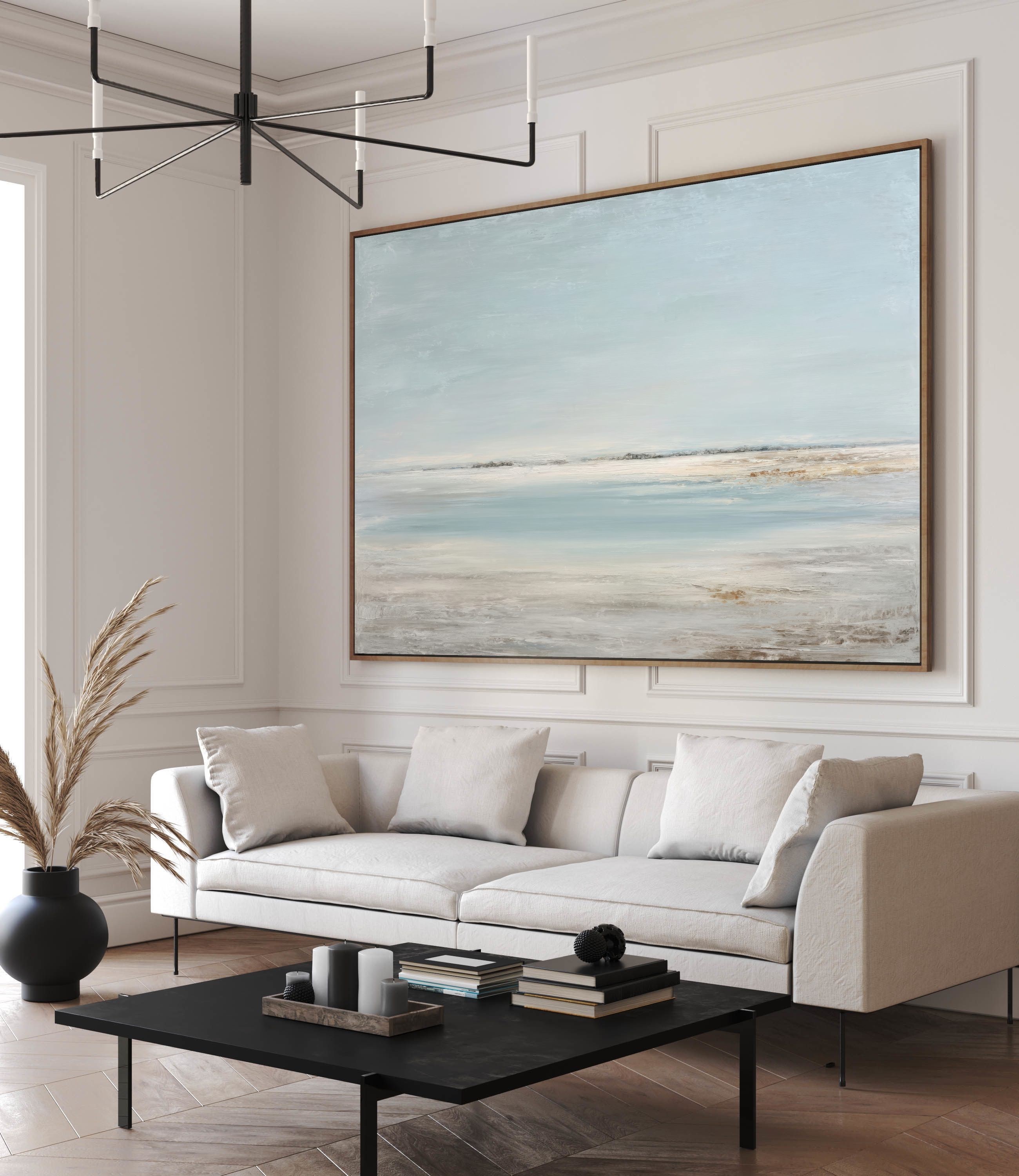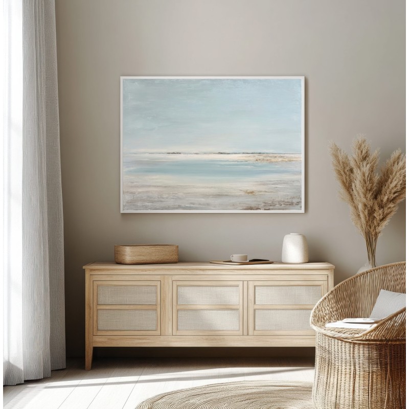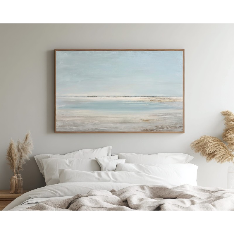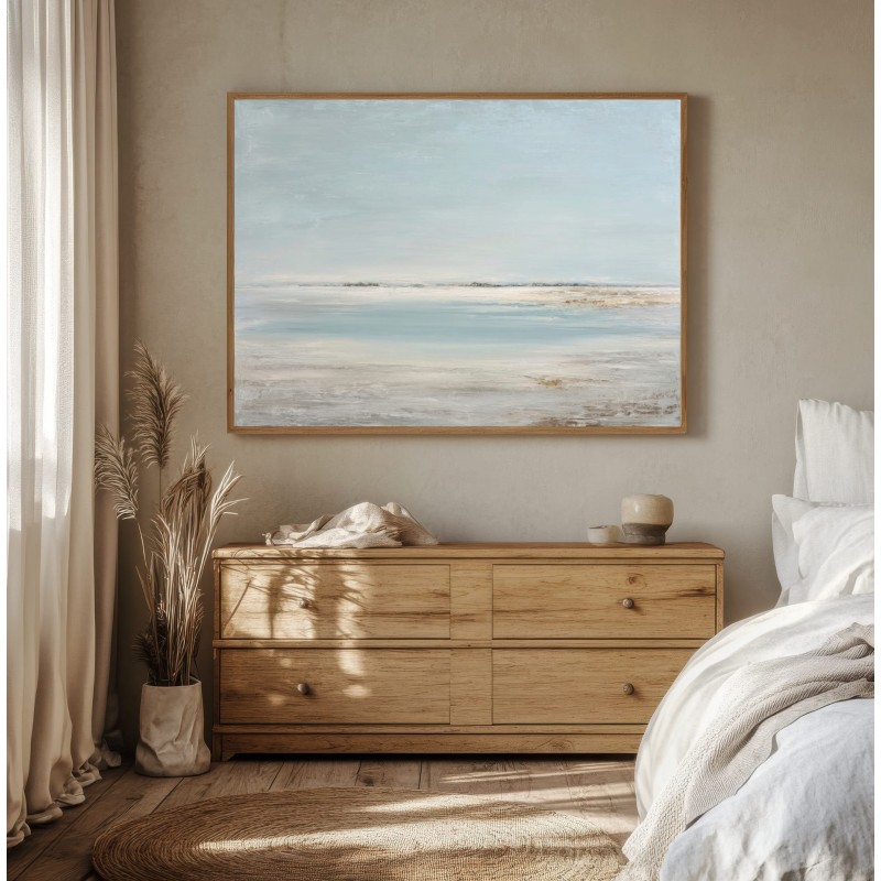 Questo elegante quadro mare astratto minimalista rappresenta l’infinito incontro tra cielo e acqua in un paesaggio marino essenziale e luminoso. Le delicate sfumature di azzurro, beige e sabbia evocano la calma di una spiaggia silenziosa, dove l’orizzonte si perde nella luce del cielo.