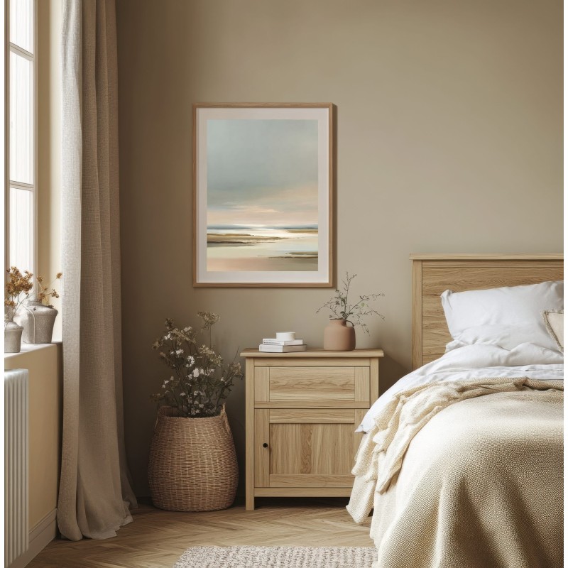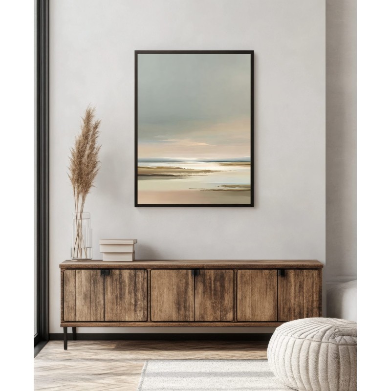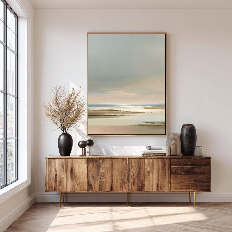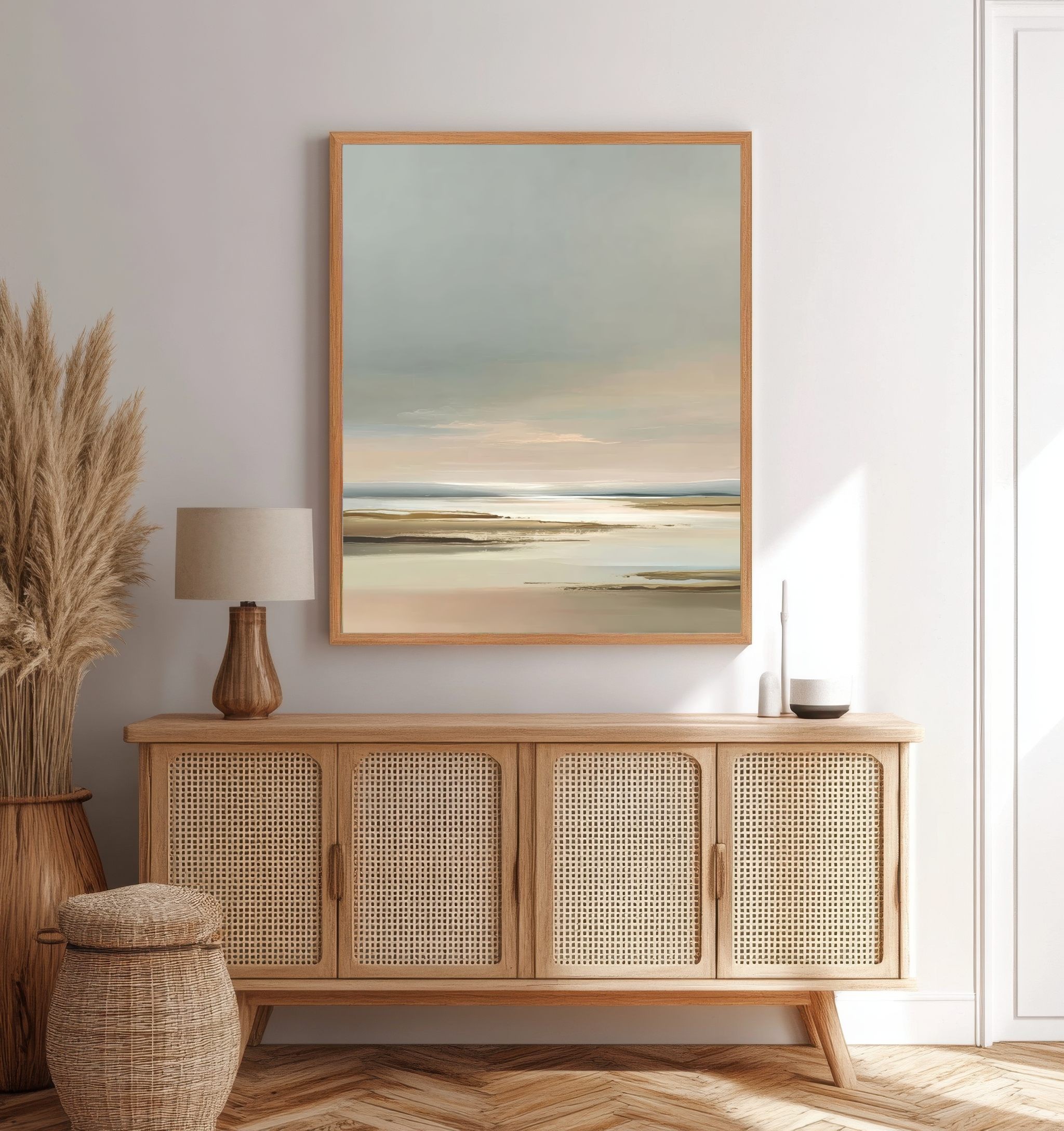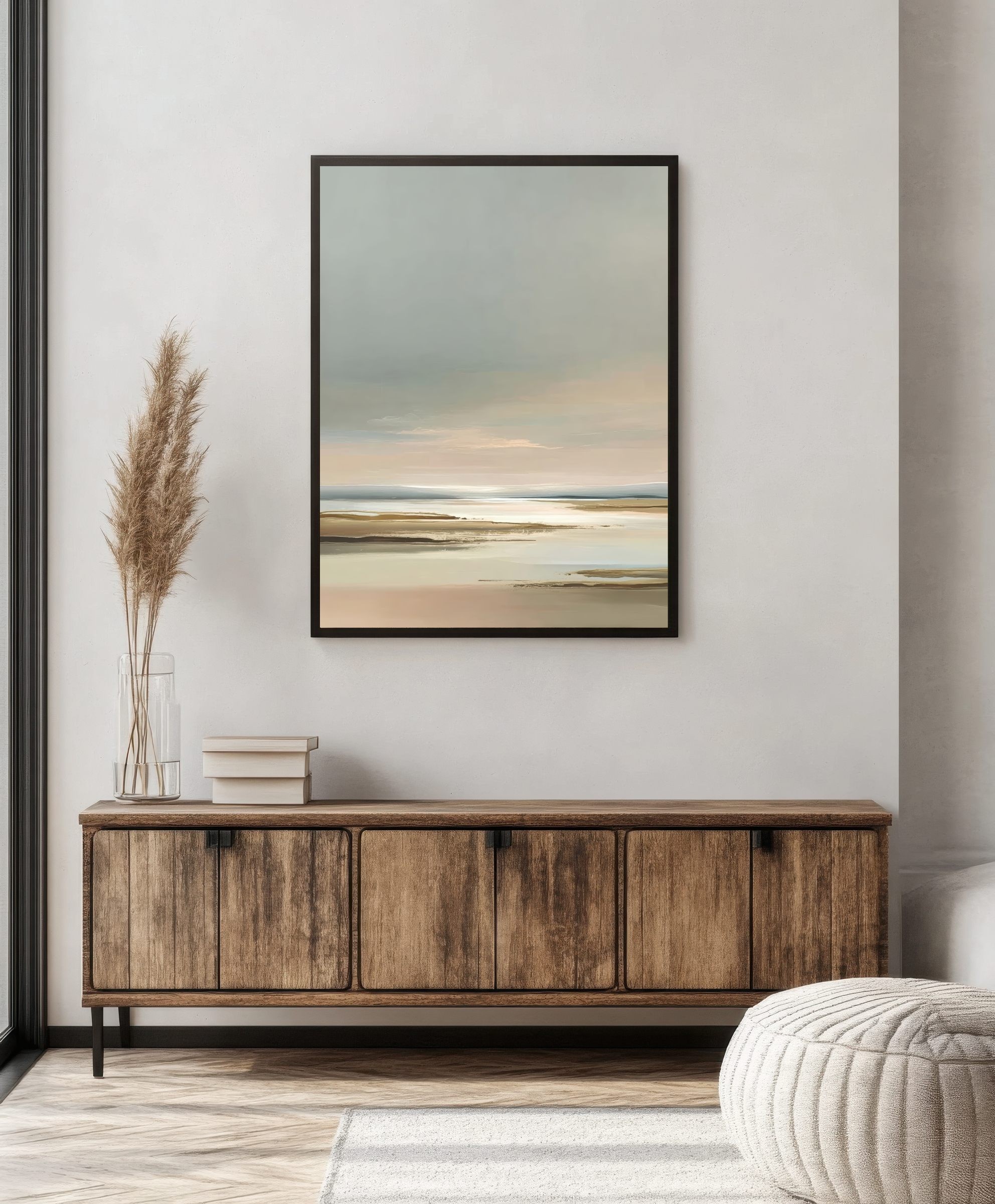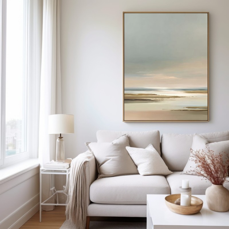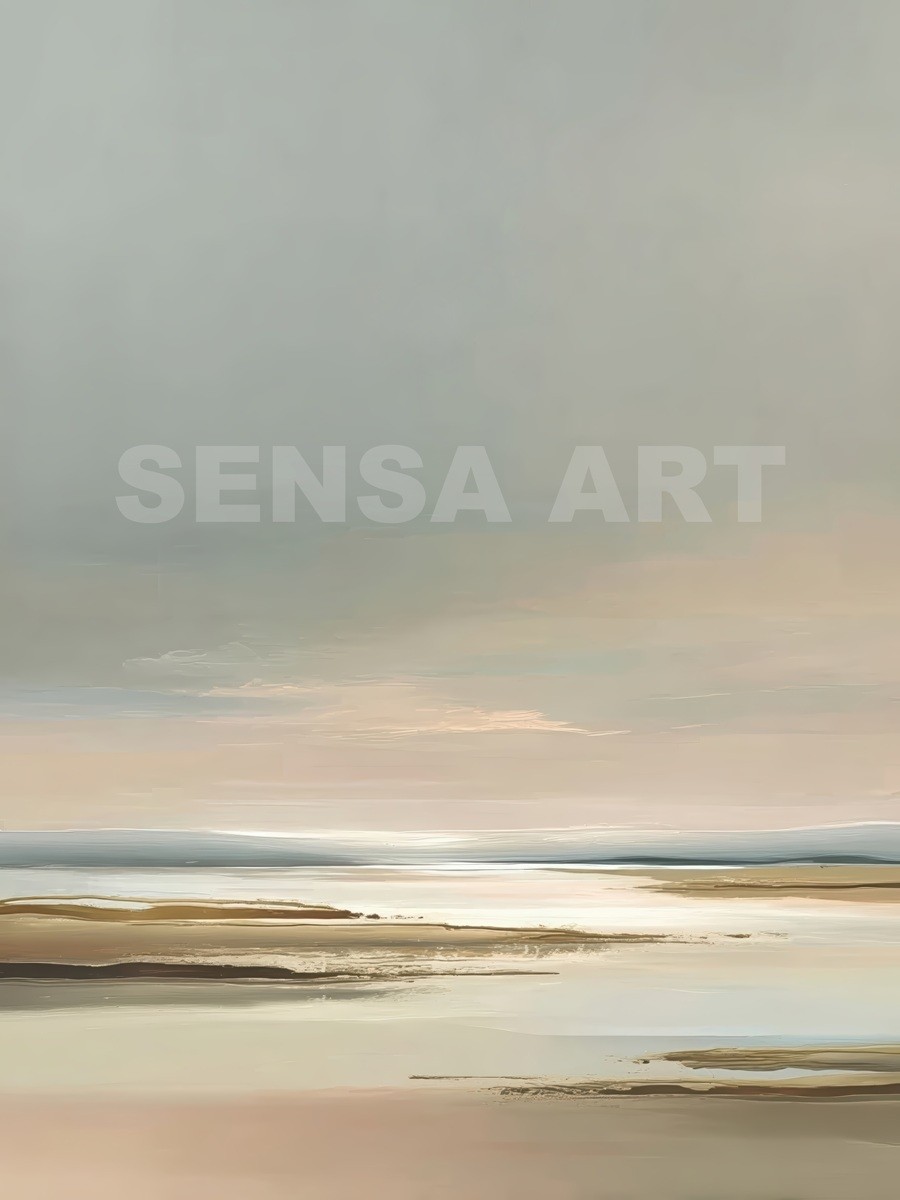 La composizione è caratterizzata da toni neutri e sofisticati: beige caldo, sabbia, verde salvia e delicate sfumature dorate. Le pennellate morbide e stratificate conferiscono profondità e movimento, mantenendo allo stesso tempo uno stile pulito ed elegante.