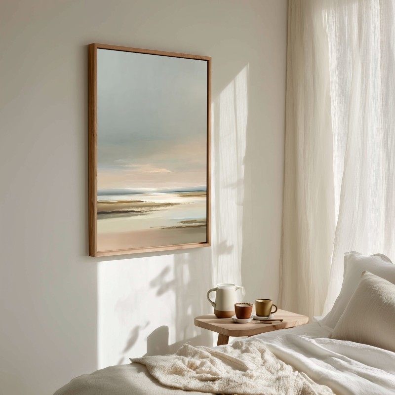 Questo raffinato quadro mare astratto minimalista rappresenta un paesaggio costiero essenziale, dove cielo e acqua si fondono in un equilibrio perfetto di luce e colore. L’orizzonte sottile e luminoso crea una sensazione di infinito, evocando la calma delle distese marine al tramonto.