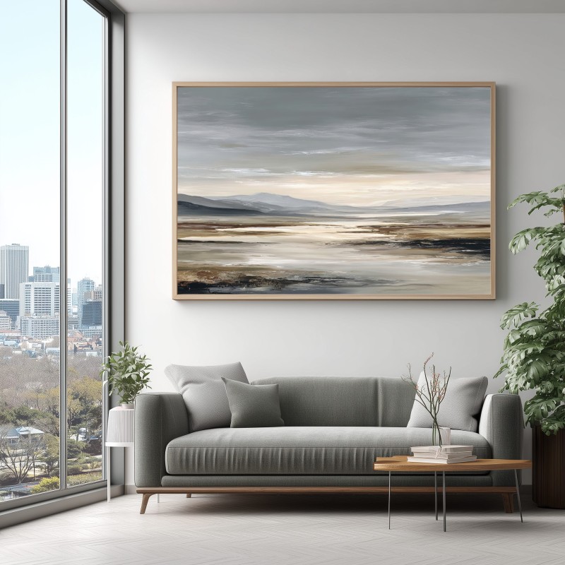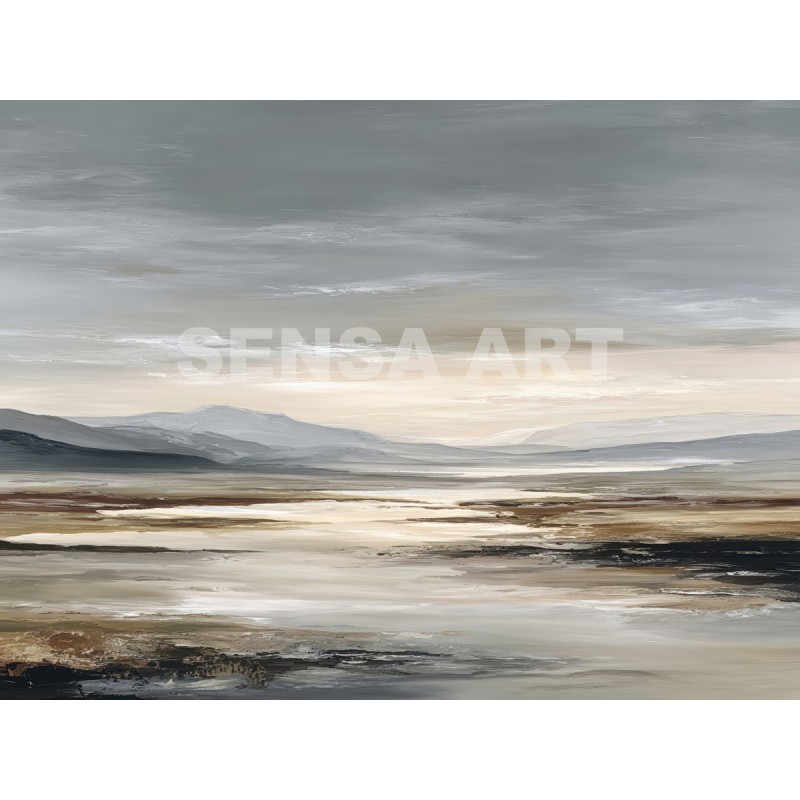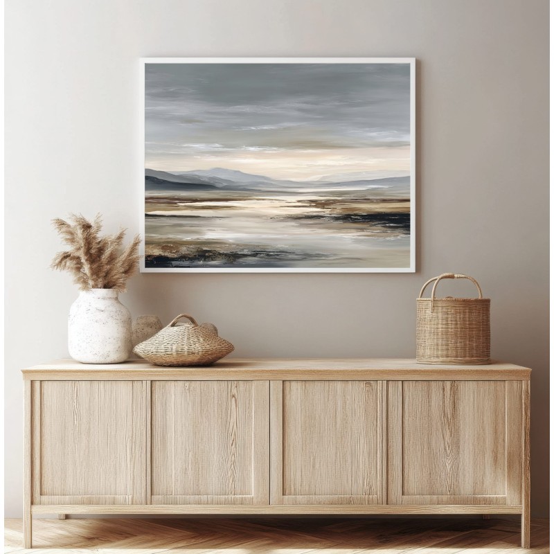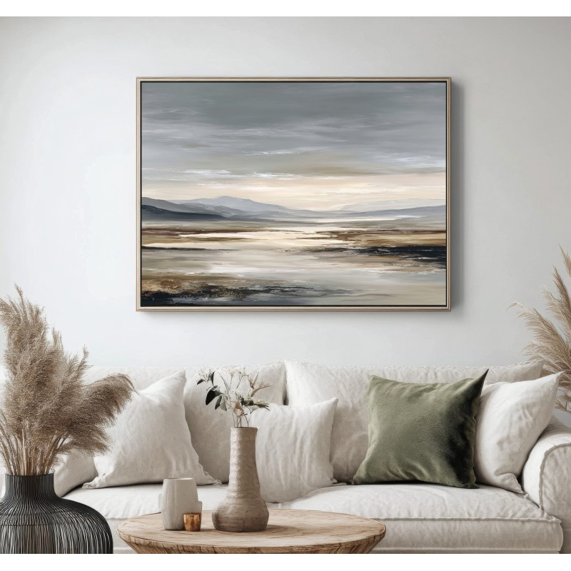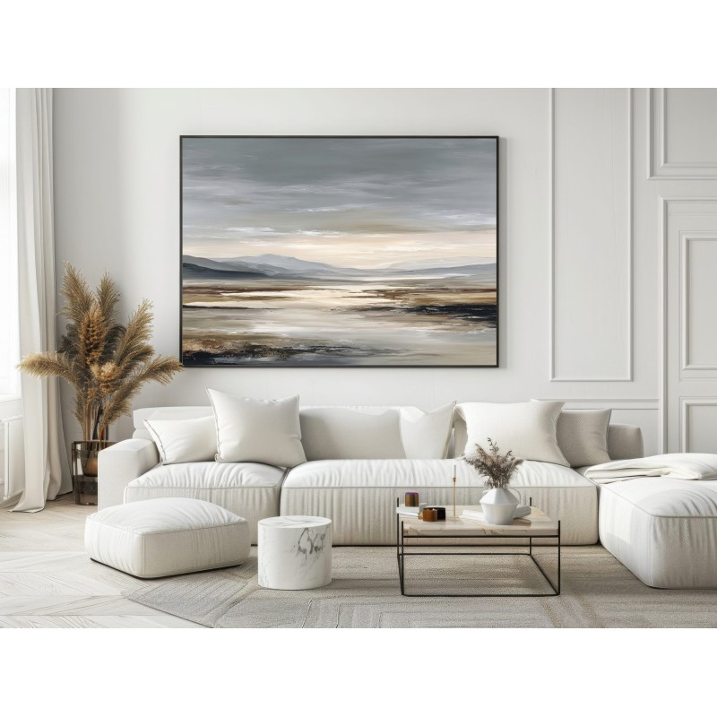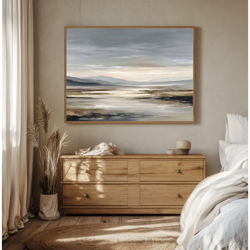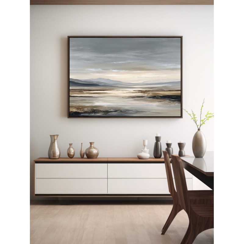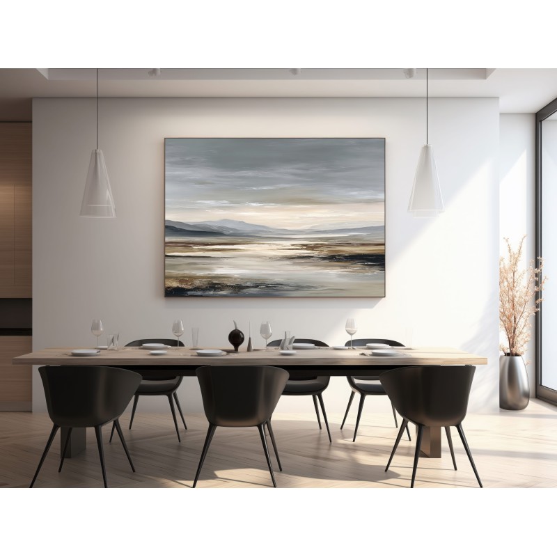Questo elegante quadro paesaggio astratto con montagne rappresenta una vasta distesa naturale dove terra, acqua e cielo si fondono in una composizione armoniosa e suggestiva. Le montagne sullo sfondo emergono tra leggere foschie, creando profondità e un senso di infinito.