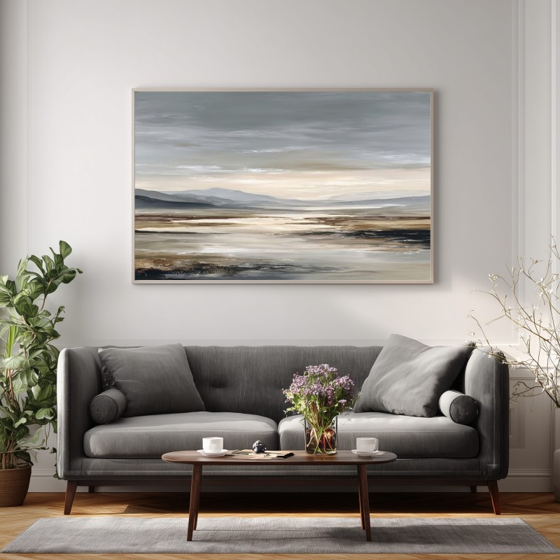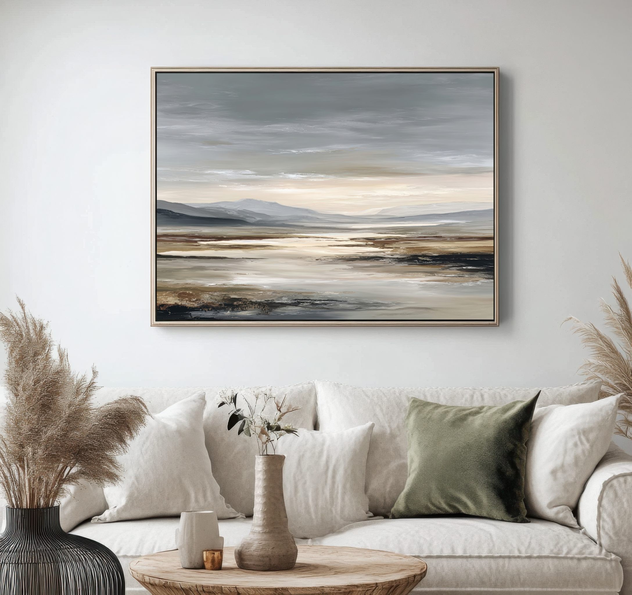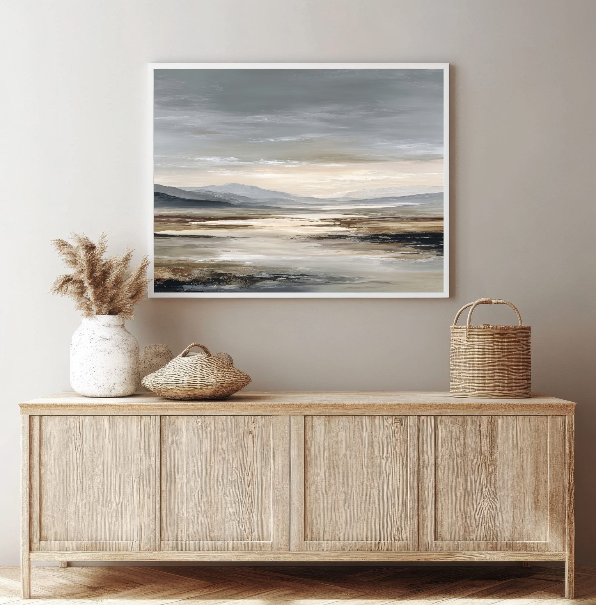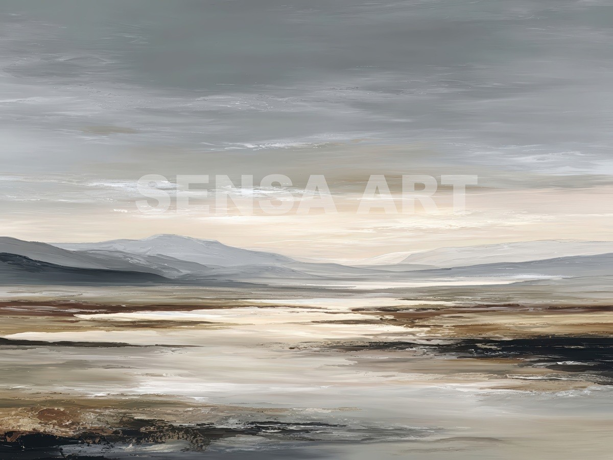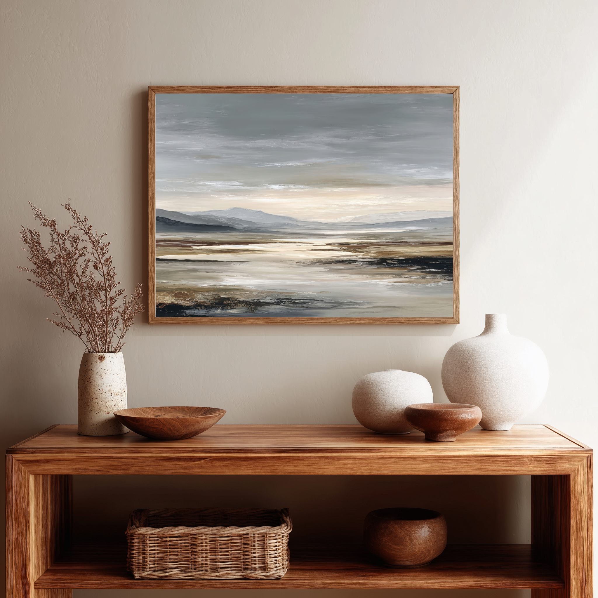 Questo elegante quadro paesaggio astratto con montagne rappresenta una vasta distesa naturale dove terra, acqua e cielo si fondono in una composizione armoniosa e suggestiva. Le montagne sullo sfondo emergono tra leggere foschie, creando profondità e un senso di infinito.