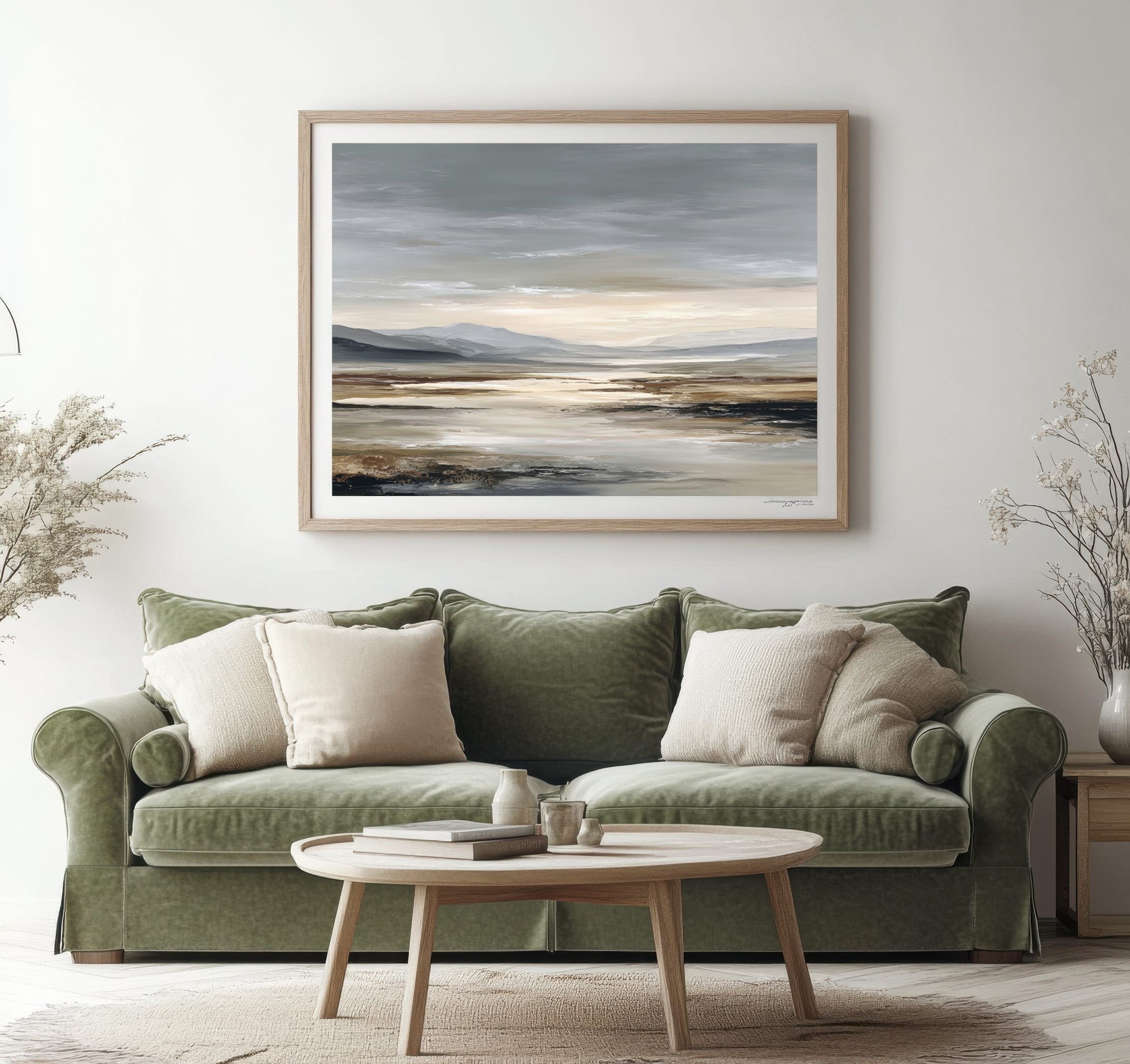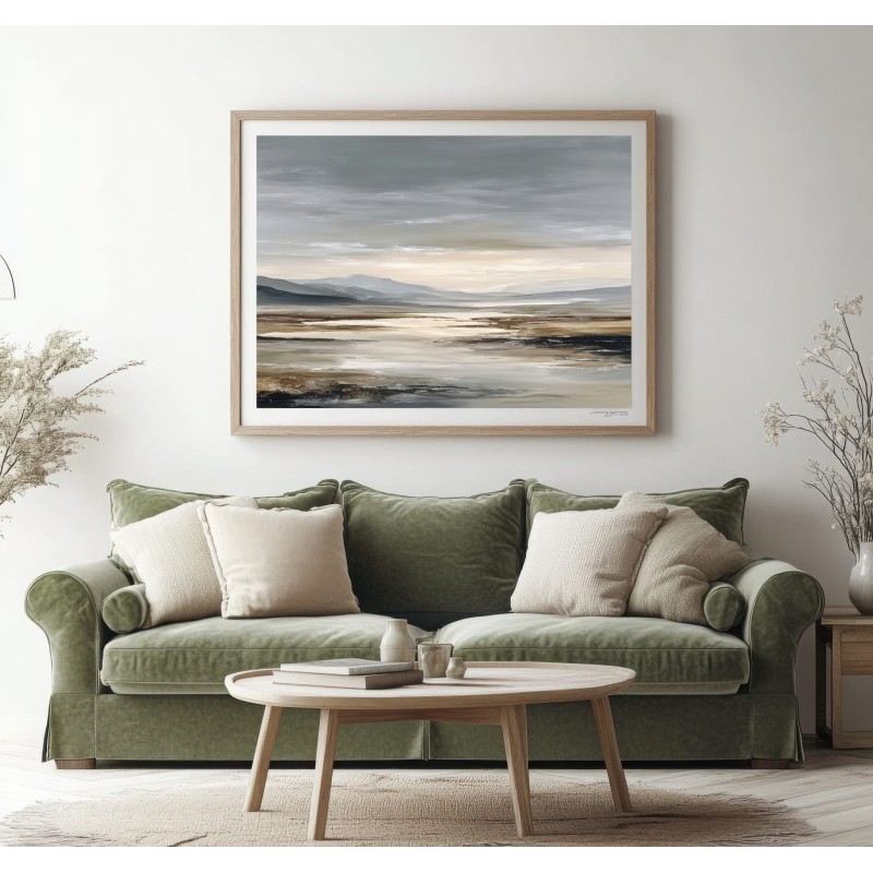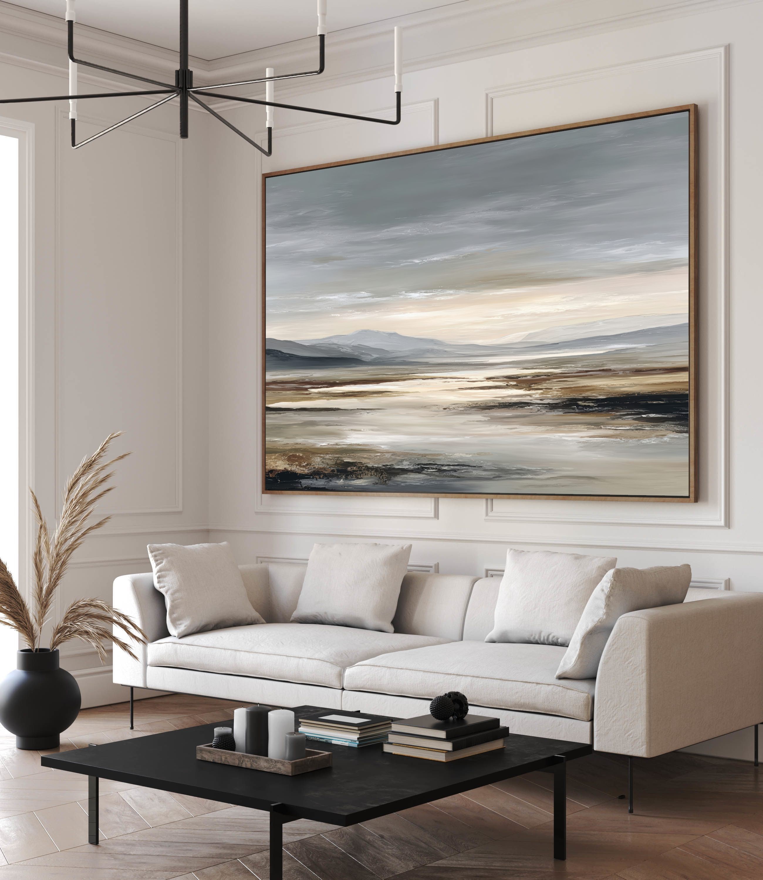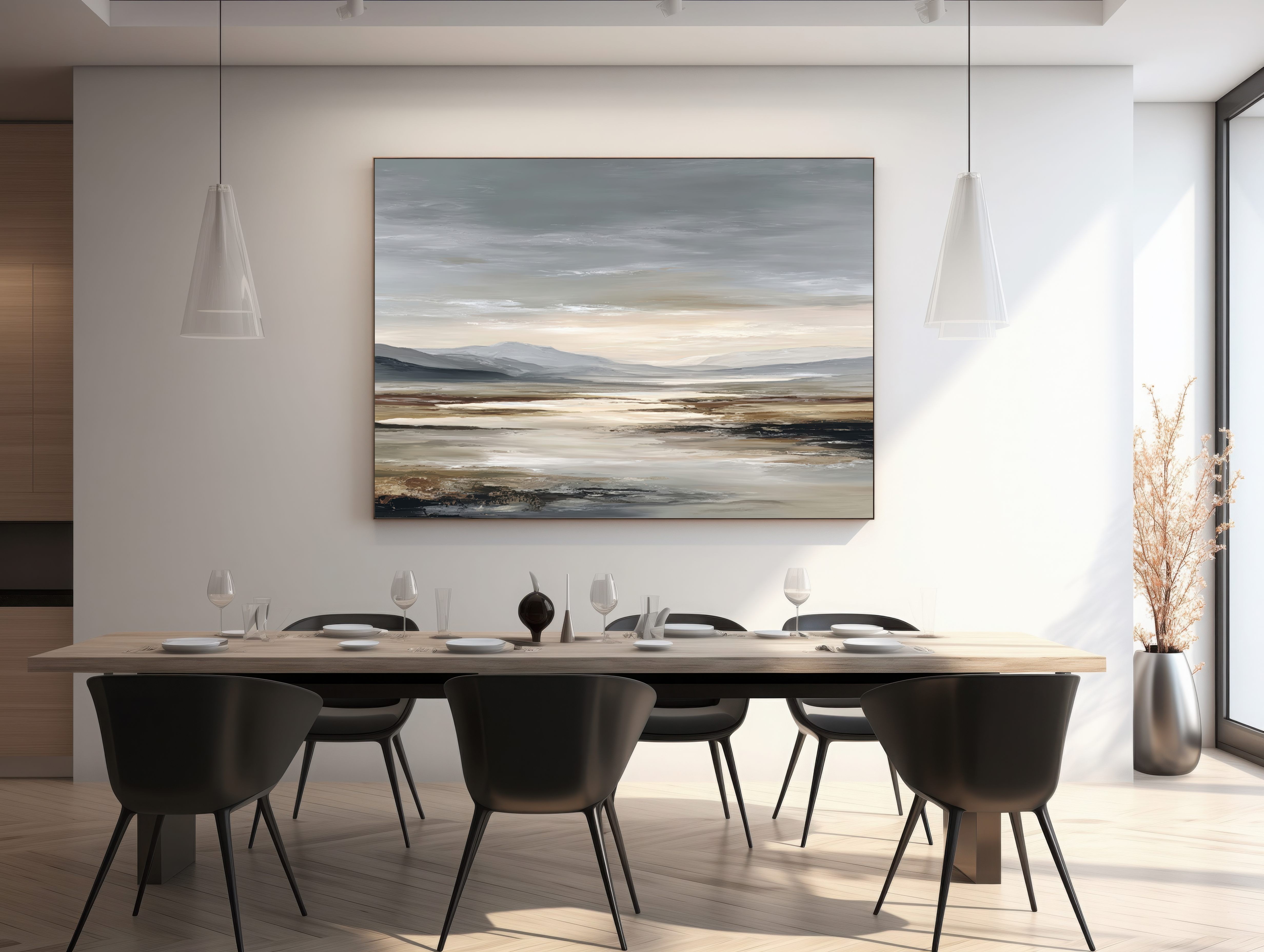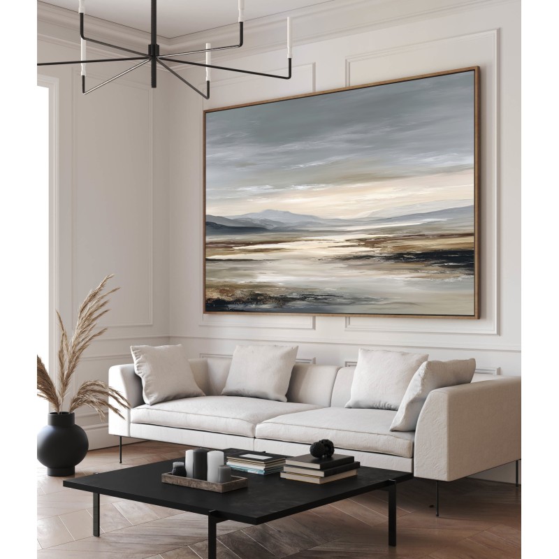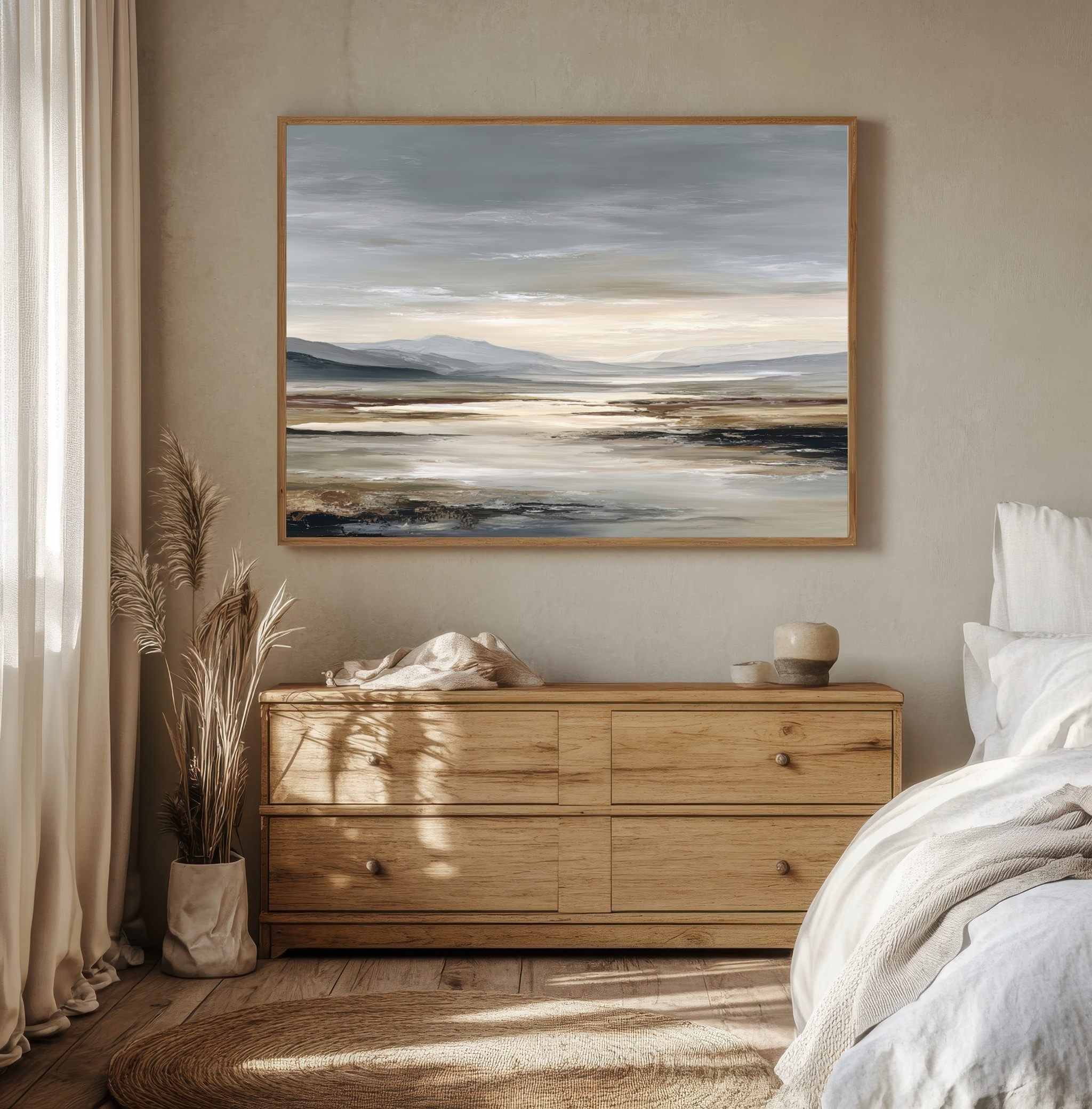 Questo elegante quadro paesaggio astratto con montagne rappresenta una vasta distesa naturale dove terra, acqua e cielo si fondono in una composizione armoniosa e suggestiva. Le montagne sullo sfondo emergono tra leggere foschie, creando profondità e un senso di infinito.