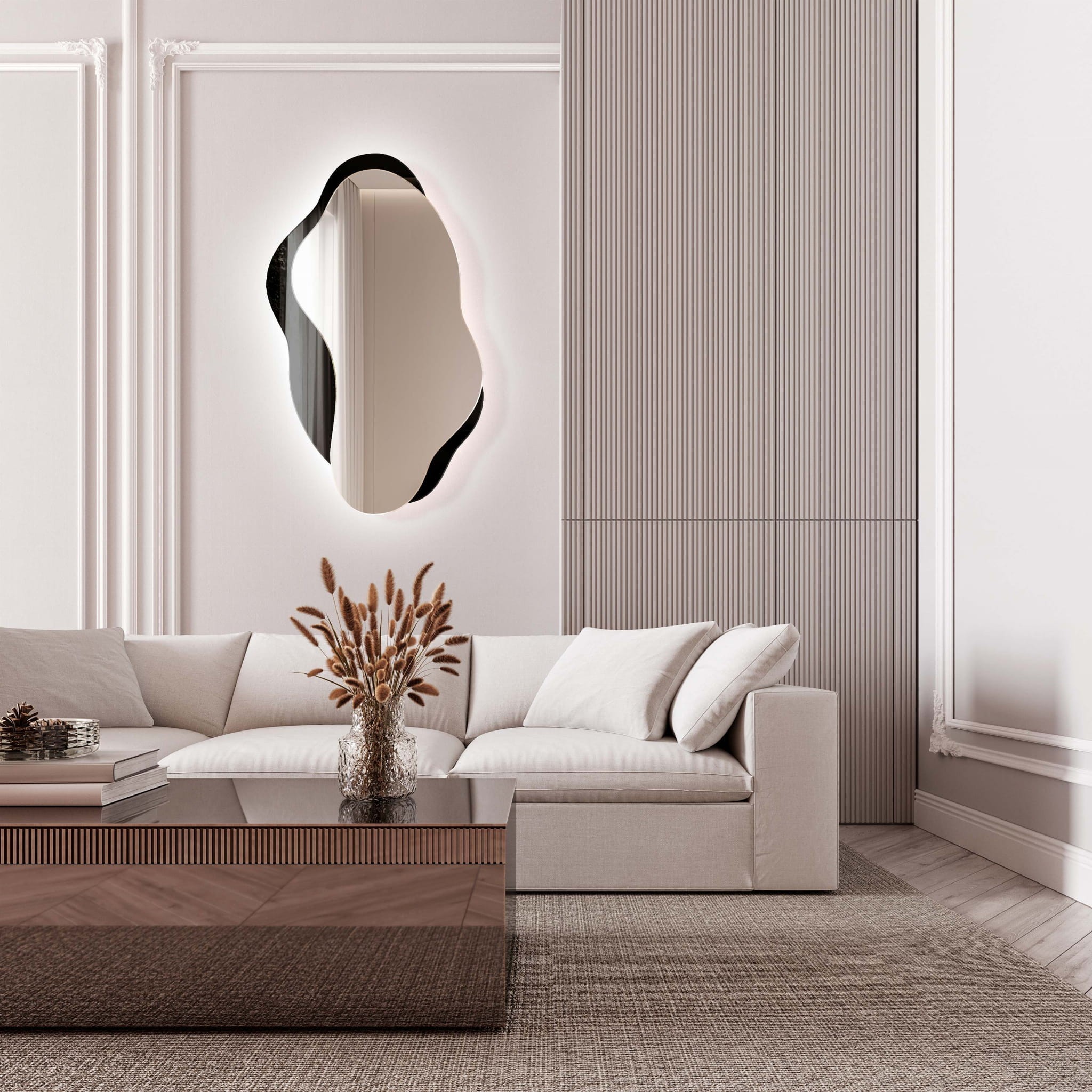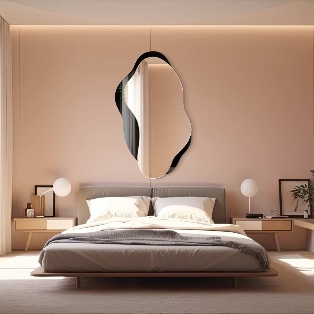 Questo specchio da parete asimmetrico con luce LED integrata è una soluzione d’arredo ideale per un salotto moderno o un open space dal gusto minimal. La sua forma organica cattura l’attenzione, conferendo un tocco scultoreo e raffinato all’ambiente. La retroilluminazione LED crea un piacevole gioco di luci soffuse sulle pareti, donando profondità e calore alla stanza. Perfetto da abbinare a un divano dalle tinte chiare e a complementi d’arredo in tonalità neutre, questo specchio di design unisce estetica e funzionalità in modo unico.