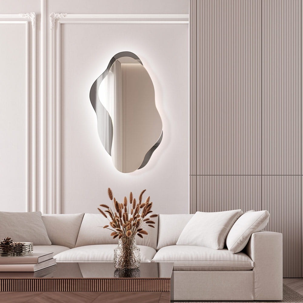 Questo specchio asimmetrico verticale con retroilluminazione LED aggiunge un tocco moderno e raffinato al soggiorno o alla zona relax. La forma irregolare e sinuosa dona movimento e personalità alle pareti, mentre la luce LED diffusa crea un'atmosfera accogliente e sofisticata. Perfetto per ambienti minimal chic e contemporanei, questo specchio decorativo moderno si abbina idealmente a mobili dai colori neutri e tonalità delicate, valorizzando lo spazio e amplificandone la luminosità con eleganza e originalità.