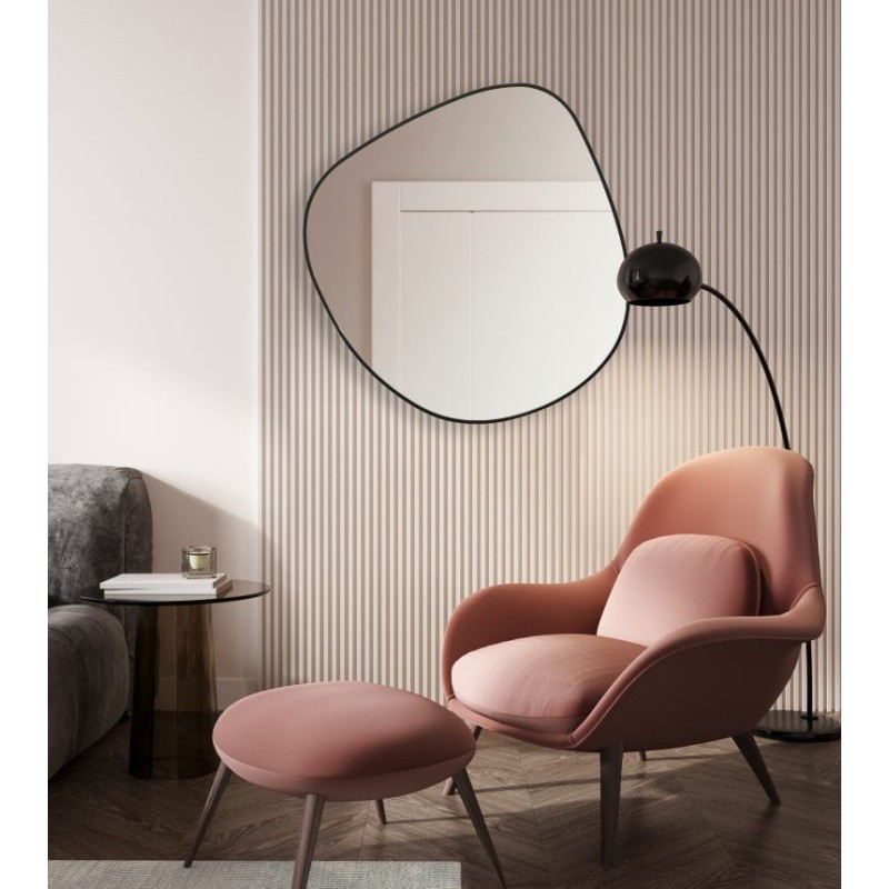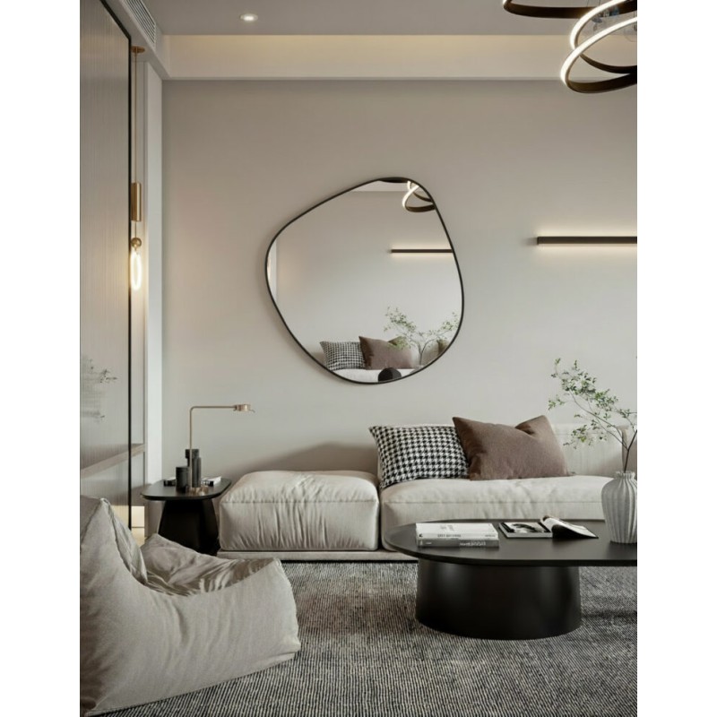 Lo specchio asimmetrico con cornice nera è un elemento decorativo dal forte impatto visivo, ideale per ambienti moderni e sofisticati. La sua forma irregolare e organica rompe la linearità degli spazi, creando movimento ed eleganza sulla parete.