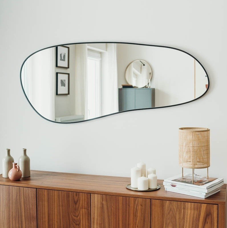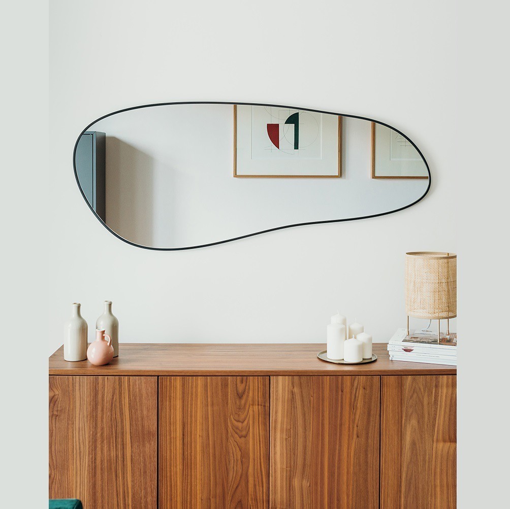 Lo specchio decorativo irregolare con cornice nera sottile è perfetto per aggiungere un tocco di raffinatezza agli ambienti moderni. Il suo design fluido e organico crea un effetto visivo dinamico, ideale per soggiorni, ingressi e camere da letto. Grazie alla sua ampia superficie riflettente, dona luminosità e profondità agli spazi, rendendoli più accoglienti. Perfetto per interni minimalisti e contemporanei, è lo specchio di design perfetto per arricchire la tua casa con stile e originalità.