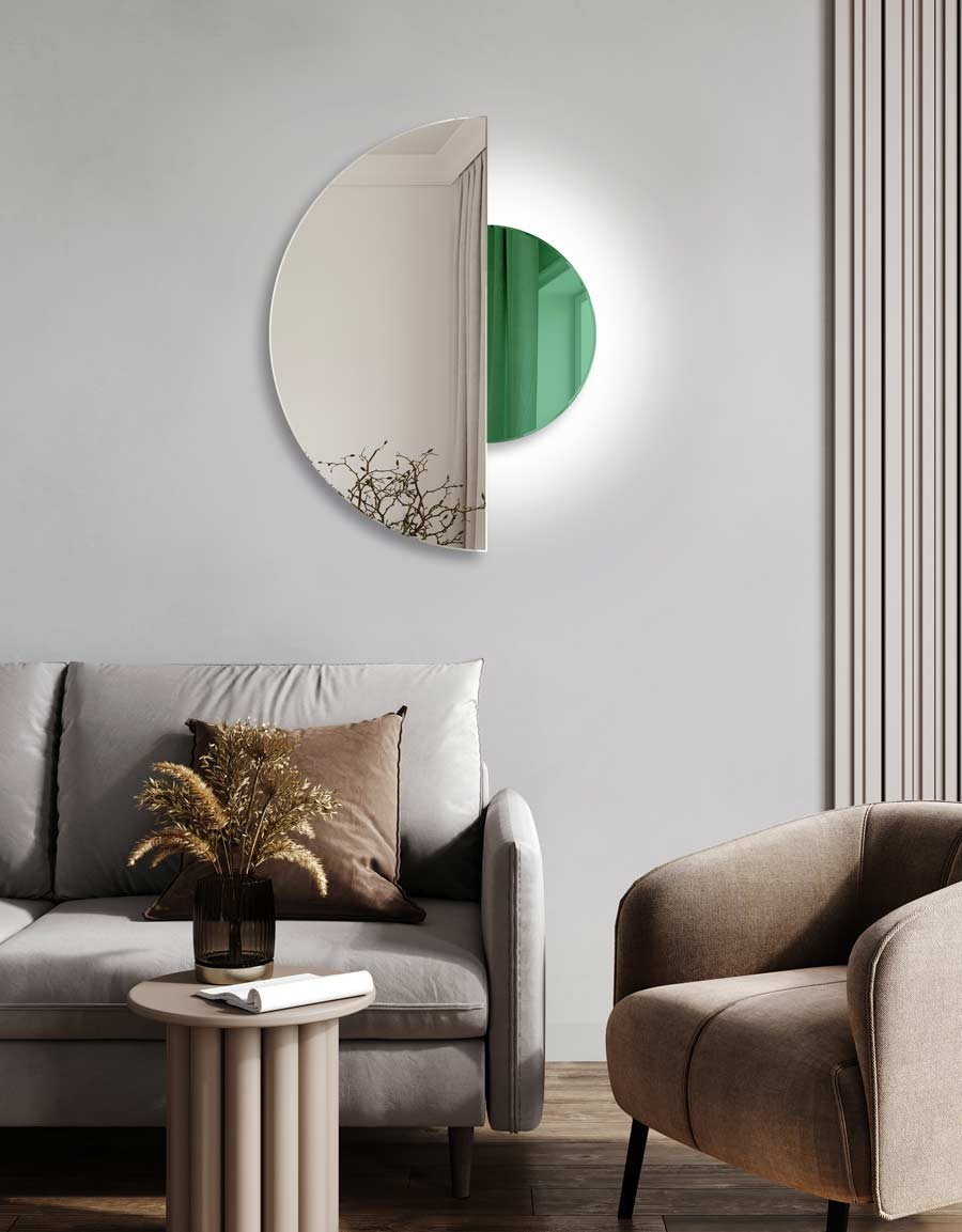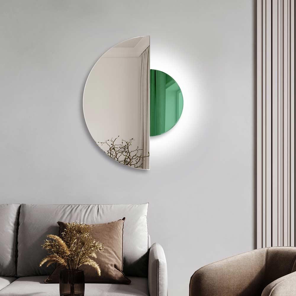 Scopri l'eleganza contemporanea dello specchio da parete con LED e inserto in vetro verde, perfetto per valorizzare ogni ambiente moderno. Il design geometrico, con mezza luna riflettente e cerchio centrale in vetro colorato, crea un effetto visivo d'impatto. L'illuminazione a LED integrata dona luce soffusa e atmosfera accogliente, ideale per soggiorni, camere o ingressi. Il contrasto tra il vetro trasparente e il verde dona carattere e originalità. Un complemento d’arredo sofisticato, adatto a chi cerca specchi di design moderni e decorativi. Unisce stile e funzionalità per un tocco unico e creativo alla tua casa.