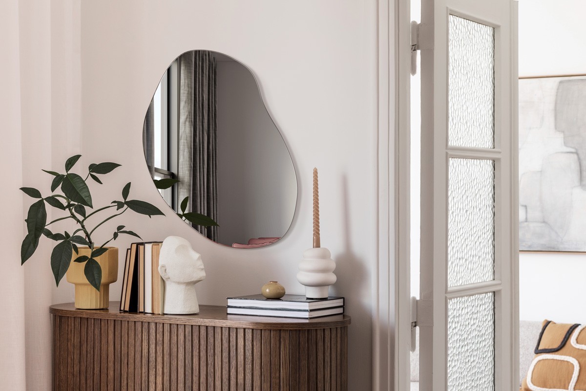 Questo specchio dalla forma organica e asimmetrica attira l'attenzione e dona un tocco distintivo all'interno. Le linee morbide e fluide dello specchio aggiungono leggerezza e originalità alla stanza. Sarà senza dubbio una decorazione unica nel soggiorno o nella camera da letto. Perfetto per interni moderni e minimalisti, apportando un tocco di mistero e una sensazione di armonia.