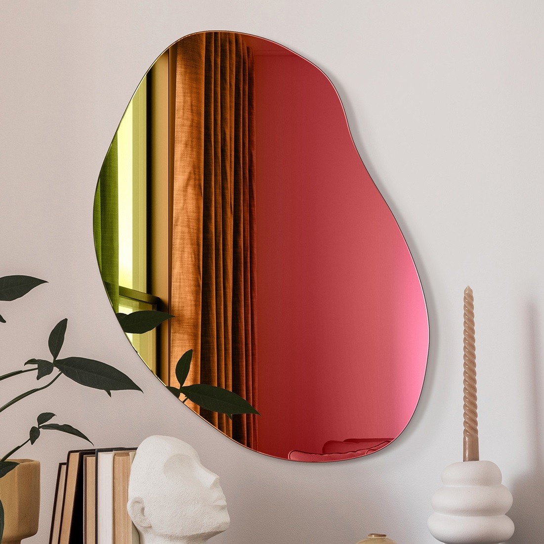 Plama Nº3 Rainbow è un meraviglioso specchio arcobaleno dal carattere decorativo. Riflette in modo cangiante a seconda dell'angolo di osservazione, restituendo l'immagine dell'ambiente in colori intensi – dal rosa all’arancione, fino a un verde brillante. Un altro pregio di questo specchio è la sua forma irregolare e organica, che si inserisce perfettamente nelle tendenze attuali di interior design. Questo specchio decorativo multicolore valorizzerà qualsiasi ambiente, ideale per la sala da pranzo, il soggiorno o la camera da letto.