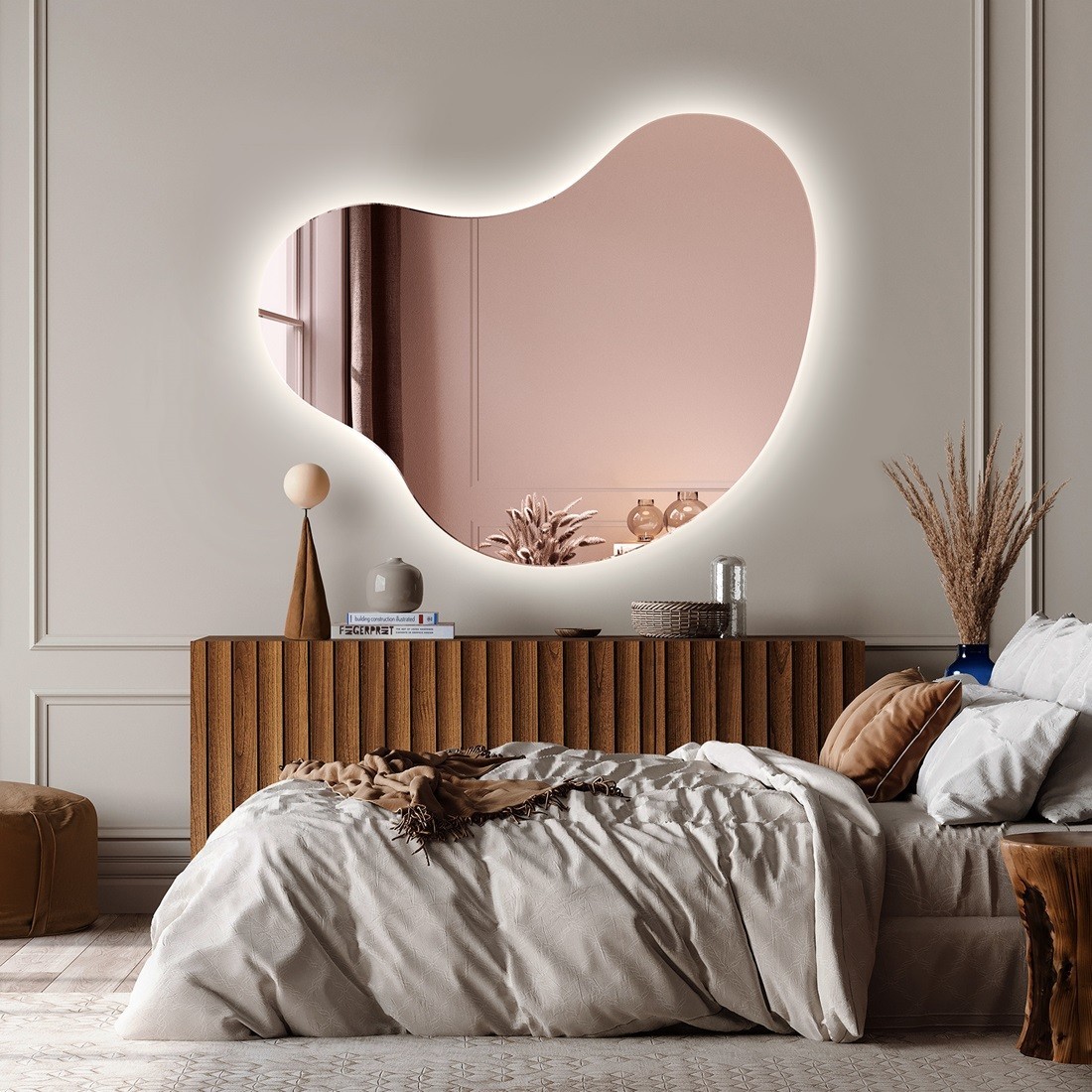 Questo specchio asimmetrico in tono oro rosa con retroilluminazione LED è la scelta perfetta per chi desidera un tocco di modernità ed eleganza nella propria casa. Il suo design organico e la morbida luce ambientale che emette creano un'atmosfera accogliente e sofisticata, ideale per camere da letto, soggiorni e bagni.