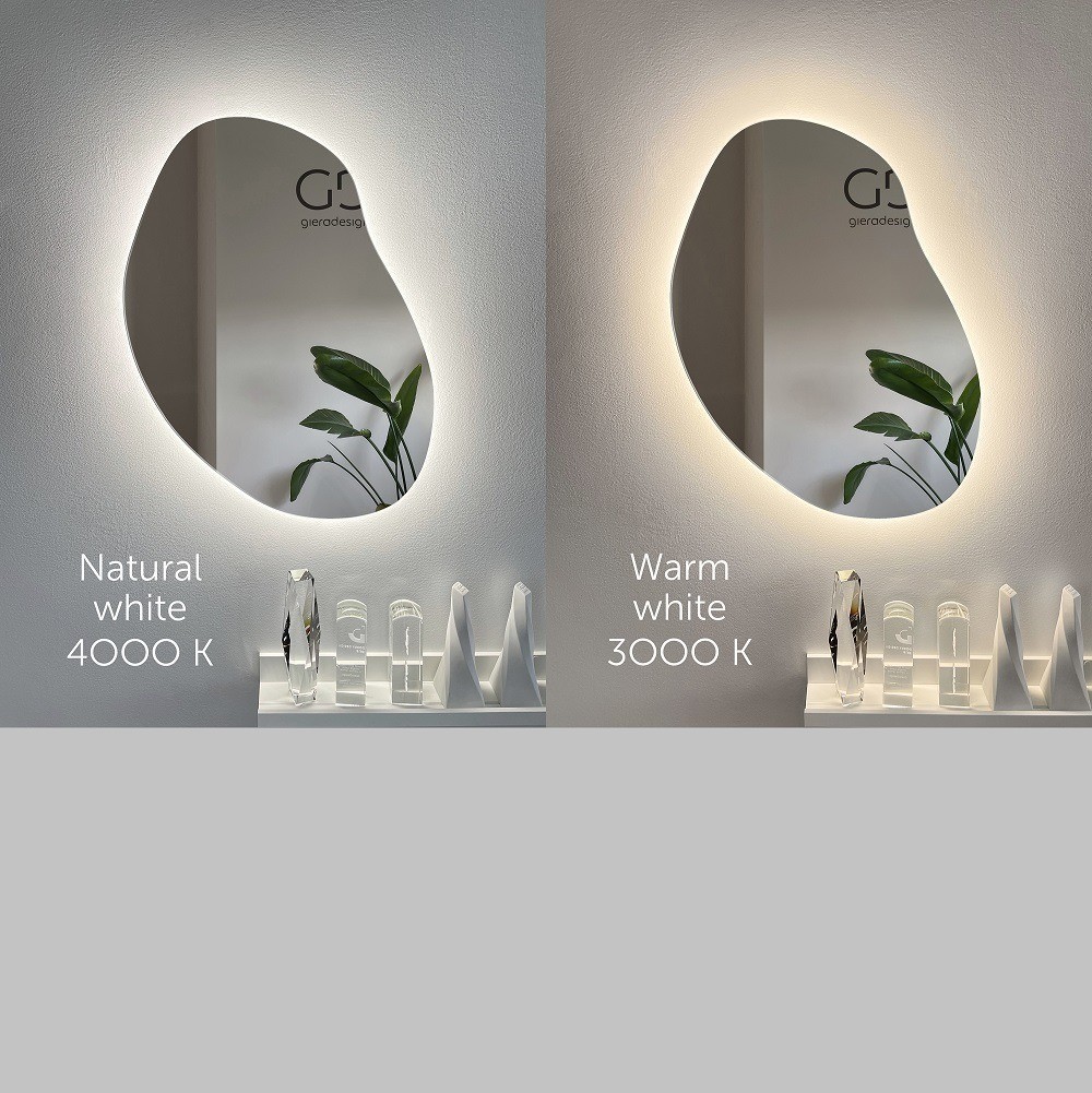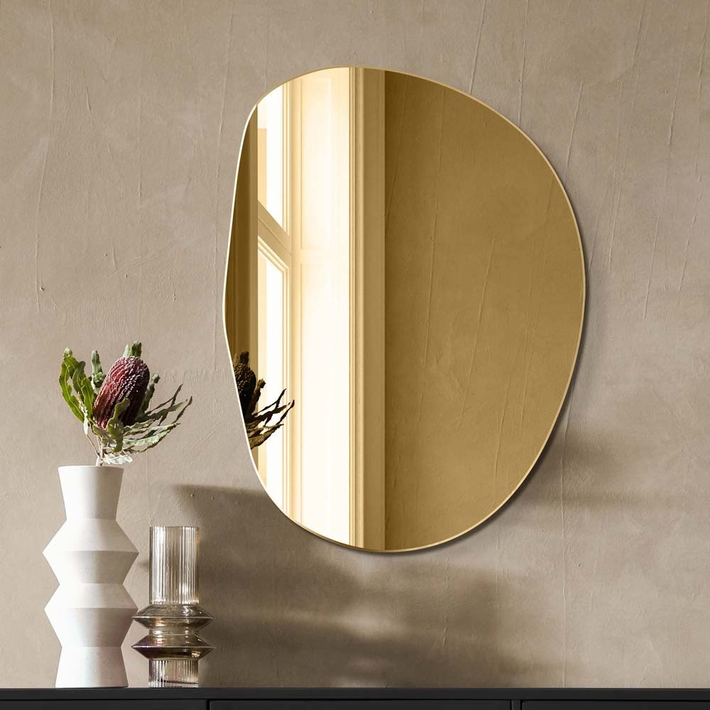 Questo specchio decorativo retroilluminato ha una forma organica, ispirata alla natura, con una finitura in oro che si integra armoniosamente negli interni moderni ed eclettici. La sua superficie irregolare e fluida aggiunge un tocco contemporaneo ed elegante a qualsiasi ambiente. È ideale per decorare salotti, ingressi o camere da letto, esaltando delicatamente i colori neutri e donando luminosità all’ambiente.