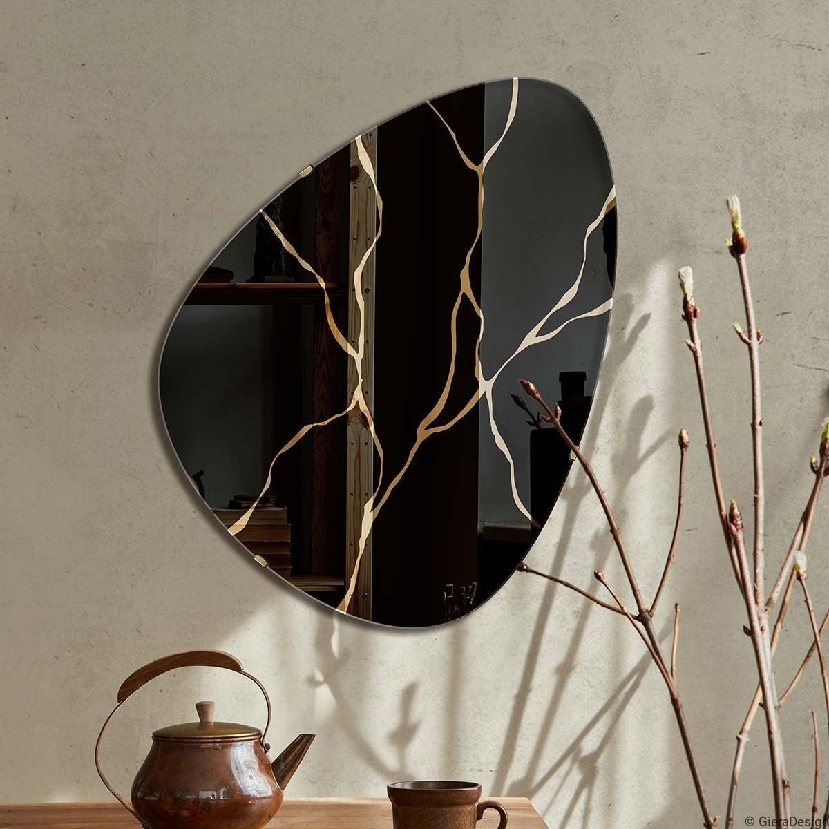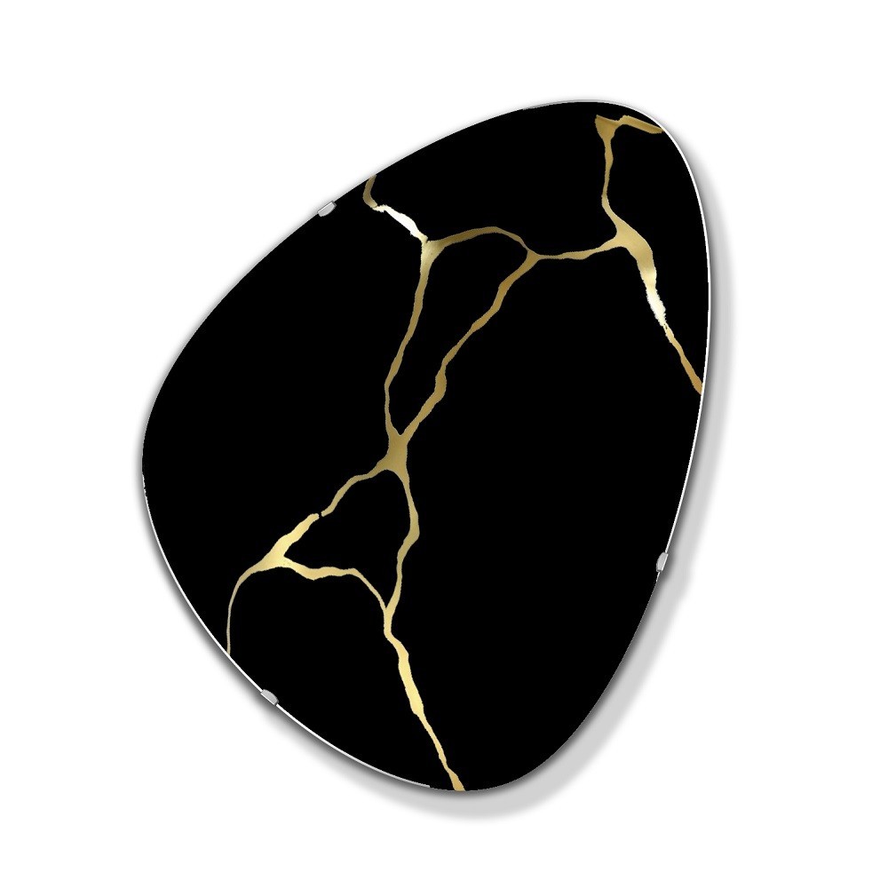 Lo specchio Fly Kintsugi è realizzato con una lastra di specchio dorato, decorata con un motivo inciso e dipinto (sul retro). Il motivo non si consuma né si lava via.