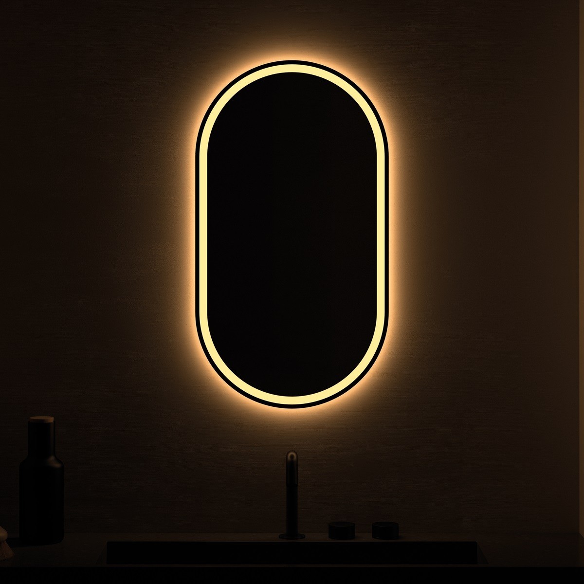 Specchio da bagno ovale con contorno nero dipinto sul retro del vetro, che incornicia delicatamente la superficie riflettente senza aggiungere spessore. La luce LED retroilluminata diffonde un bagliore morbido e uniforme, creando un’atmosfera elegante e rilassante. Dotato di interruttore touch e funzione antiappannamento, unisce design minimalista e tecnologia moderna. Perfetto per bagni contemporanei e ambienti raffinati.