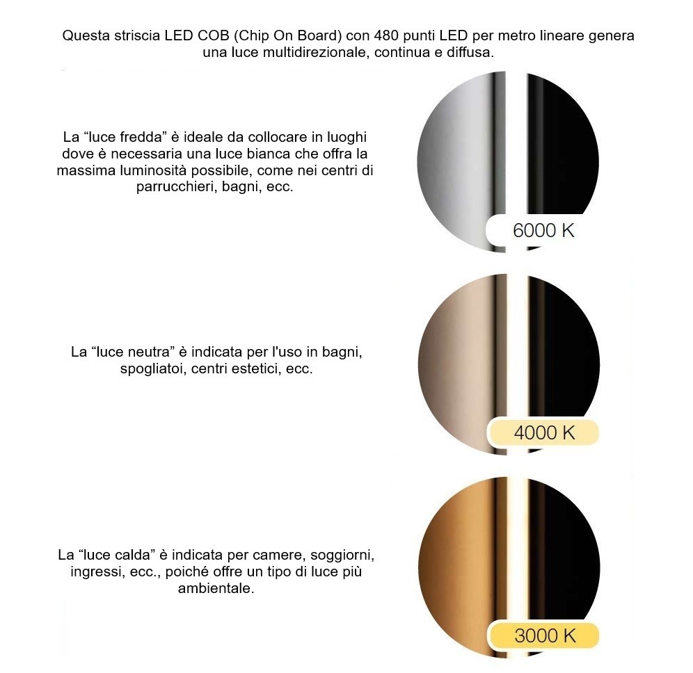 Colori dell'illuminazione a scelta: Luce fredda: 6000ºK, Luce neutra: 4.000ºK, Luce calda: 3.000ºK.