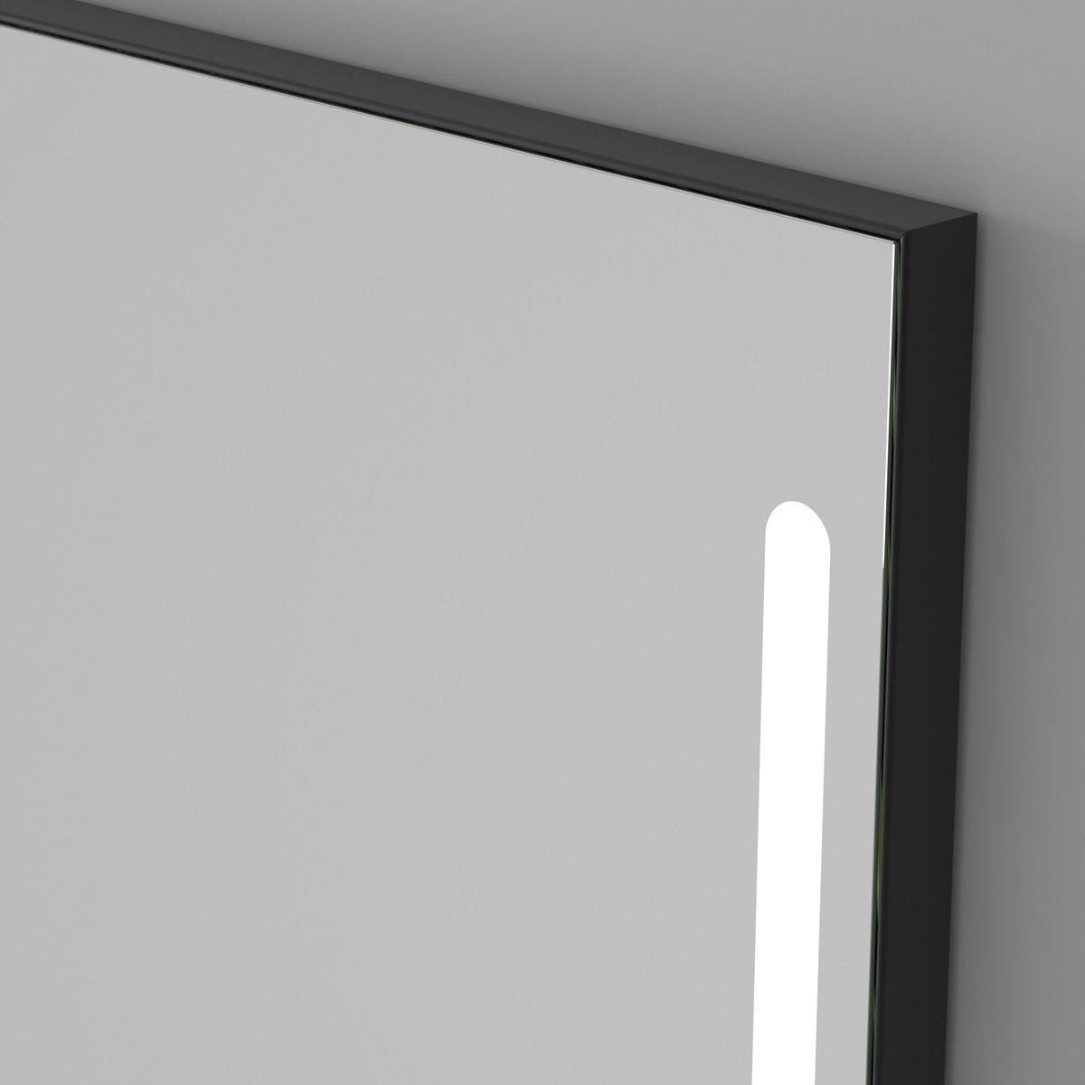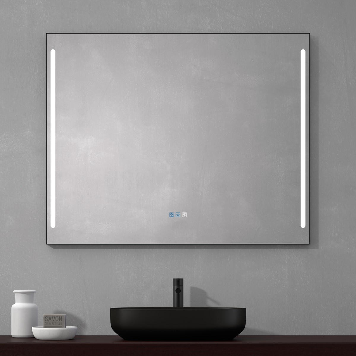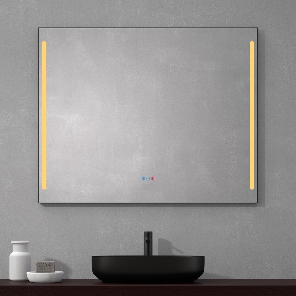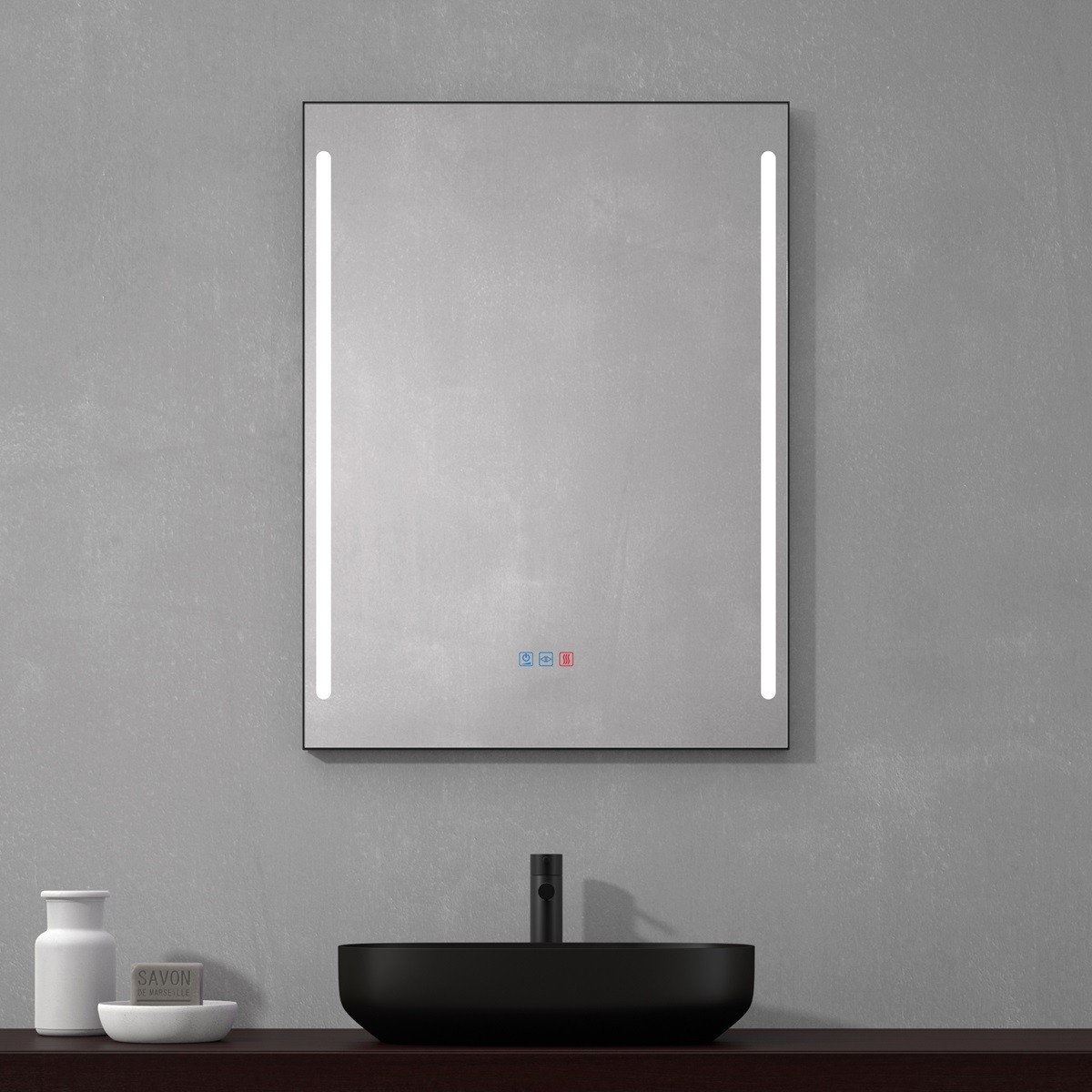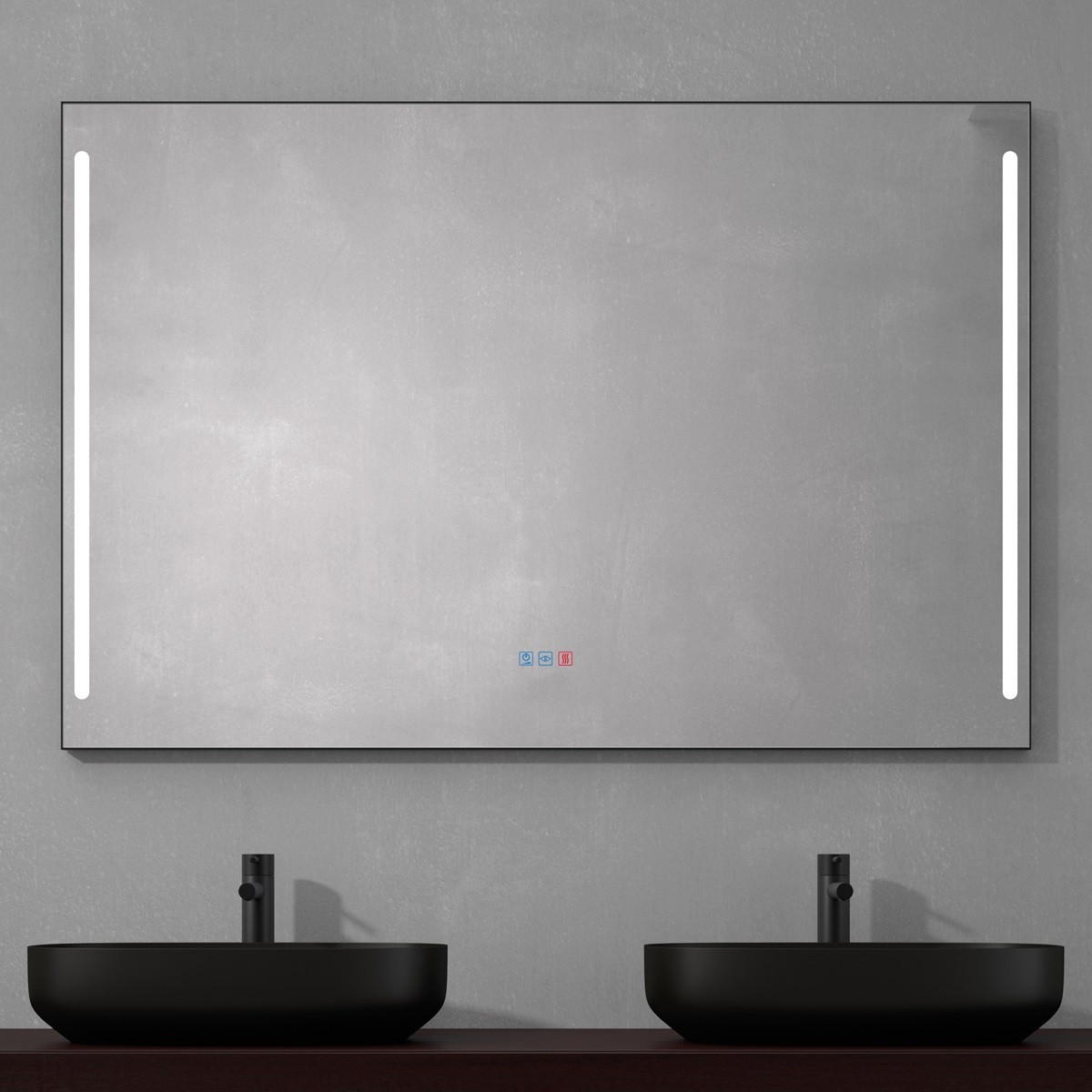 Specchio bagno moderno con cornice nera sottile e doppia fascia luminosa verticale integrata nella superficie del vetro. L’illuminazione LED diffonde una luce uniforme e intensa, ideale per il trucco o la rasatura quotidiana. Realizzato in vetro di alta qualità, unisce funzionalità e stile contemporaneo. Il design minimalista con linee pulite e la cornice nera donano eleganza e carattere, perfetto per bagni moderni e spazi contract. Include comando touch per accensione e regolazione della temperatura di colore.
