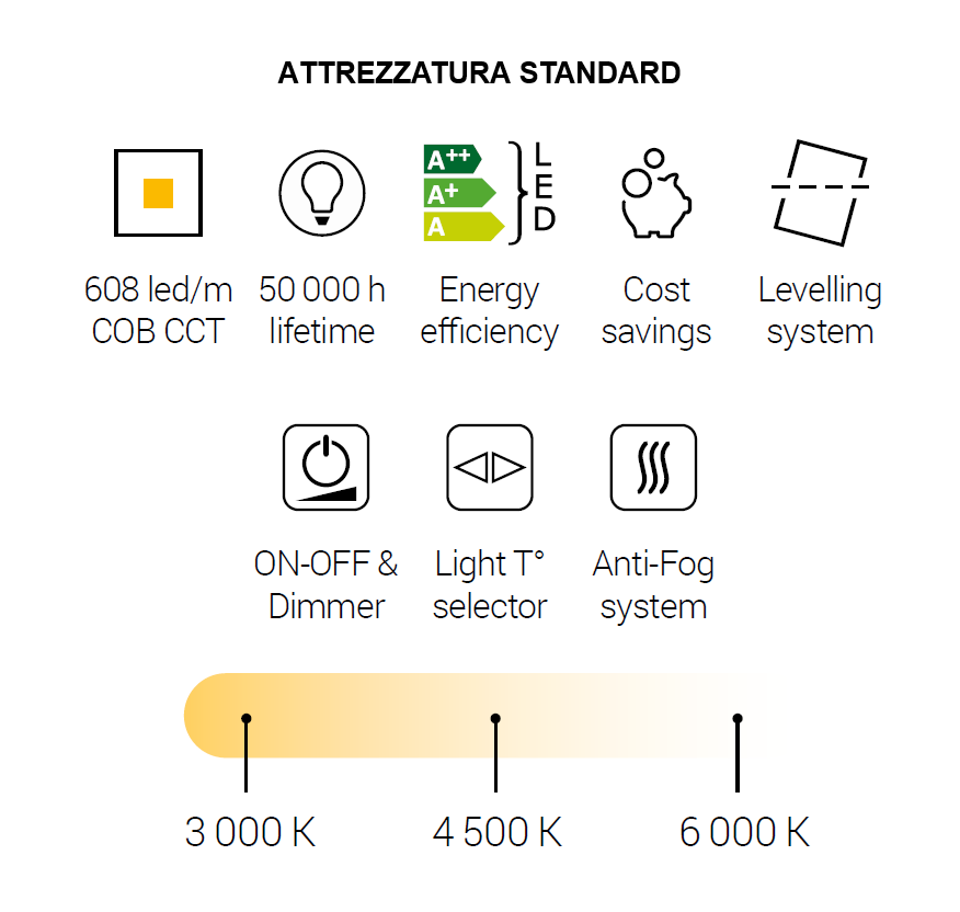 Effetto luce continua: Fredda: 6000K, Neutra: 4500K, Calda: 3000K.