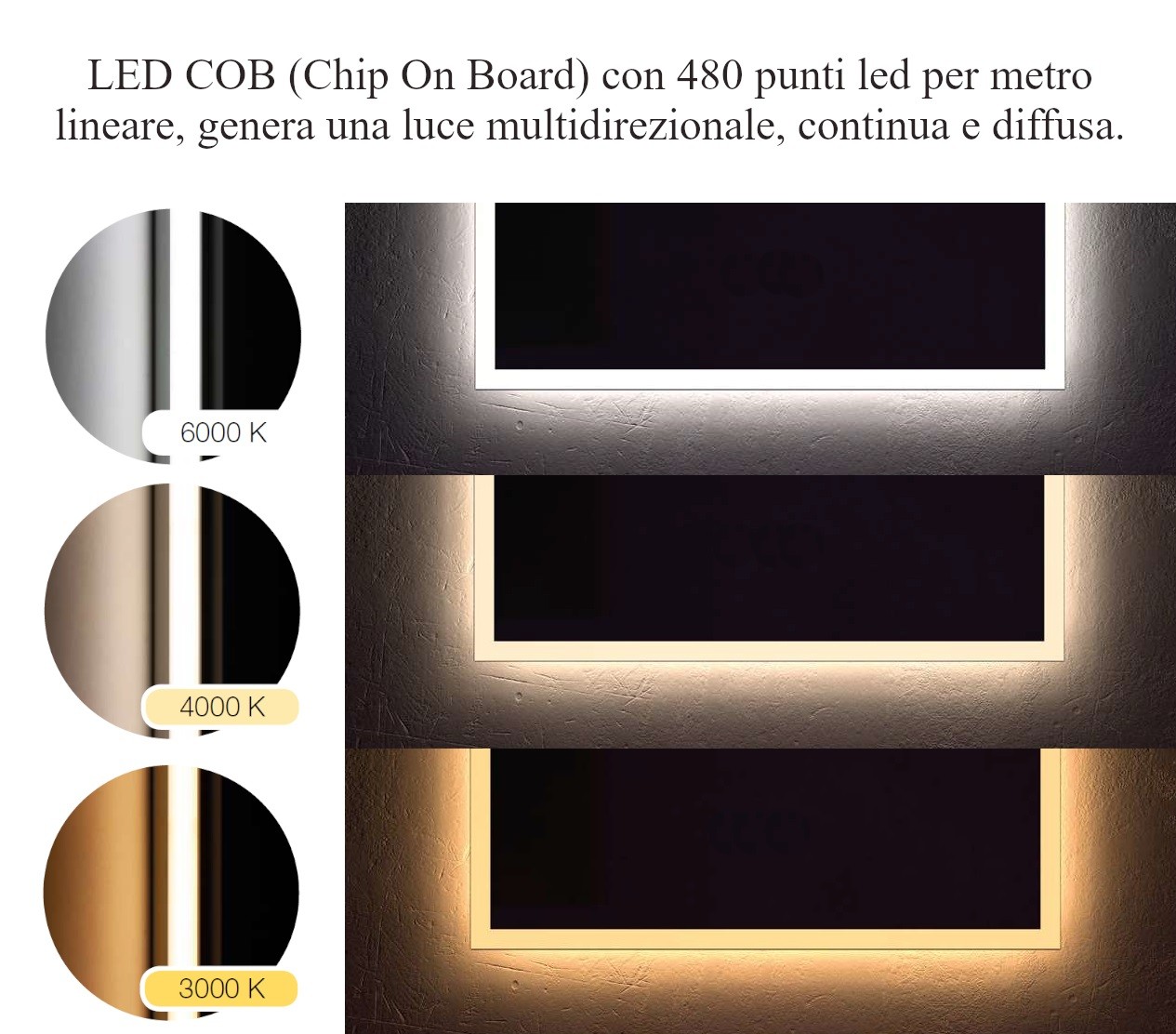 Colori di illuminazione disponibili: Luce fredda: 6000ºK, Luce neutra: 4.000ºK, Luce calda: 3.000ºK.