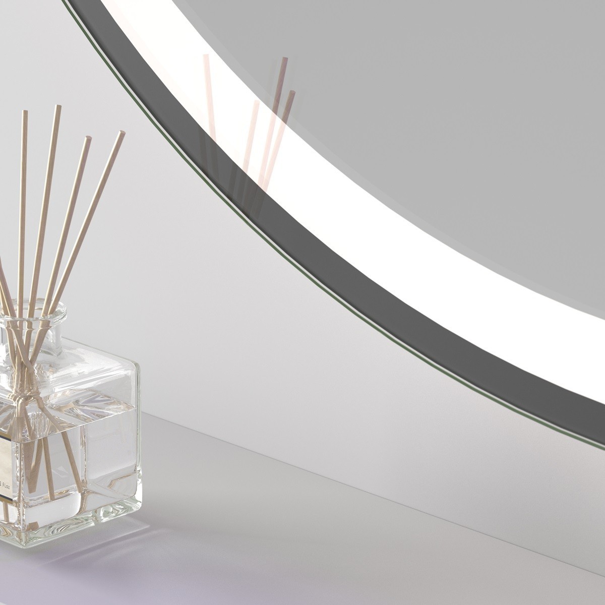 Lo specchio è dotato di illuminazione ambientale indiretta perimetrale (luce murale) e di un’illuminazione diretta emessa dalla parte frontale (vetro satinato).