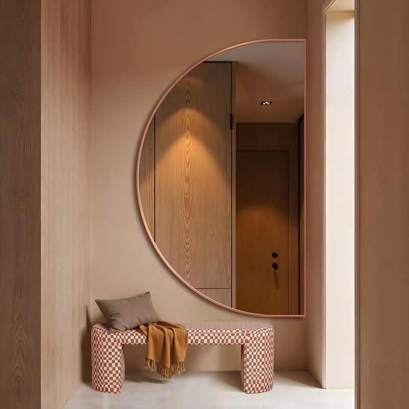 Specchio ad arco con cornice minimalista in colore rame. Grazie alla sua forma e al suo carattere universale, si adatta perfettamente a qualsiasi tipo di interno, sia esso in stile scandinavo, eclettico o moderno. Questo elegante specchio di tendenza aggiungerà stile e un tocco senza tempo al tuo ingresso, soggiorno, sala da pranzo, camera da letto o bagno.