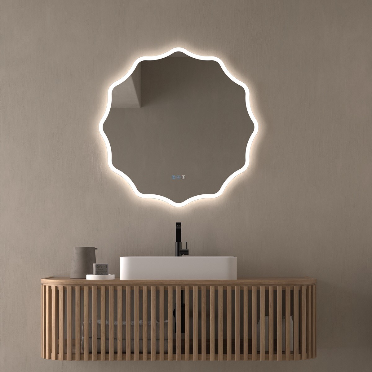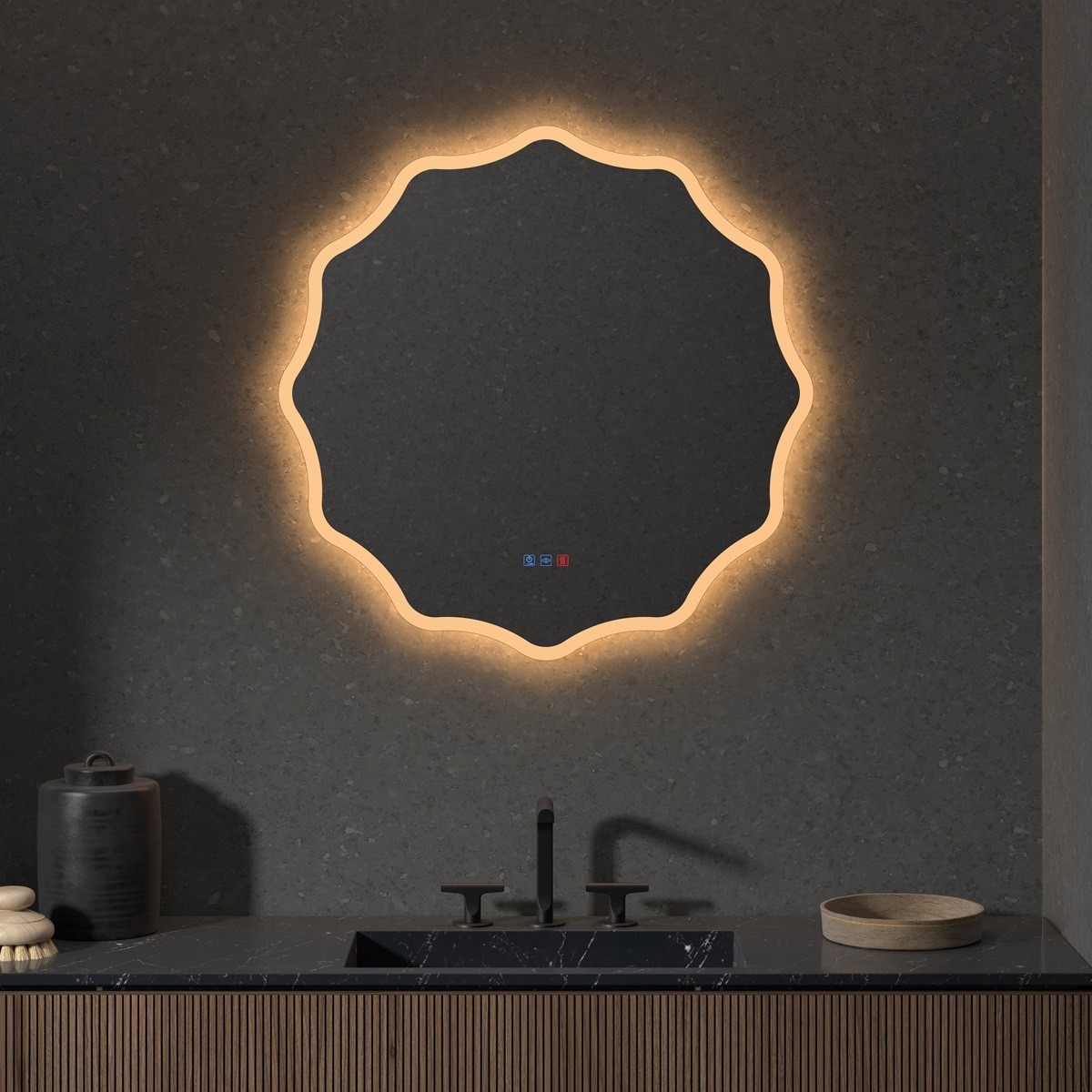 Questo specchio decorativo retroilluminato LED con bordo sagomato è un elemento di design esclusivo per chi desidera arredare il bagno con stile e originalità. La cornice ondulata crea un effetto dinamico e raffinato, mentre la retroilluminazione diffonde una luce calda e uniforme, ideale per valorizzare lo spazio. Realizzato in cristallo di alta qualità, garantisce nitidezza e resistenza, diventando un complemento funzionale e scenografico. Perfetto per bagni moderni, minimal o luxury, lo specchio bagno illuminato trasforma la zona lavabo in un ambiente elegante e accogliente.