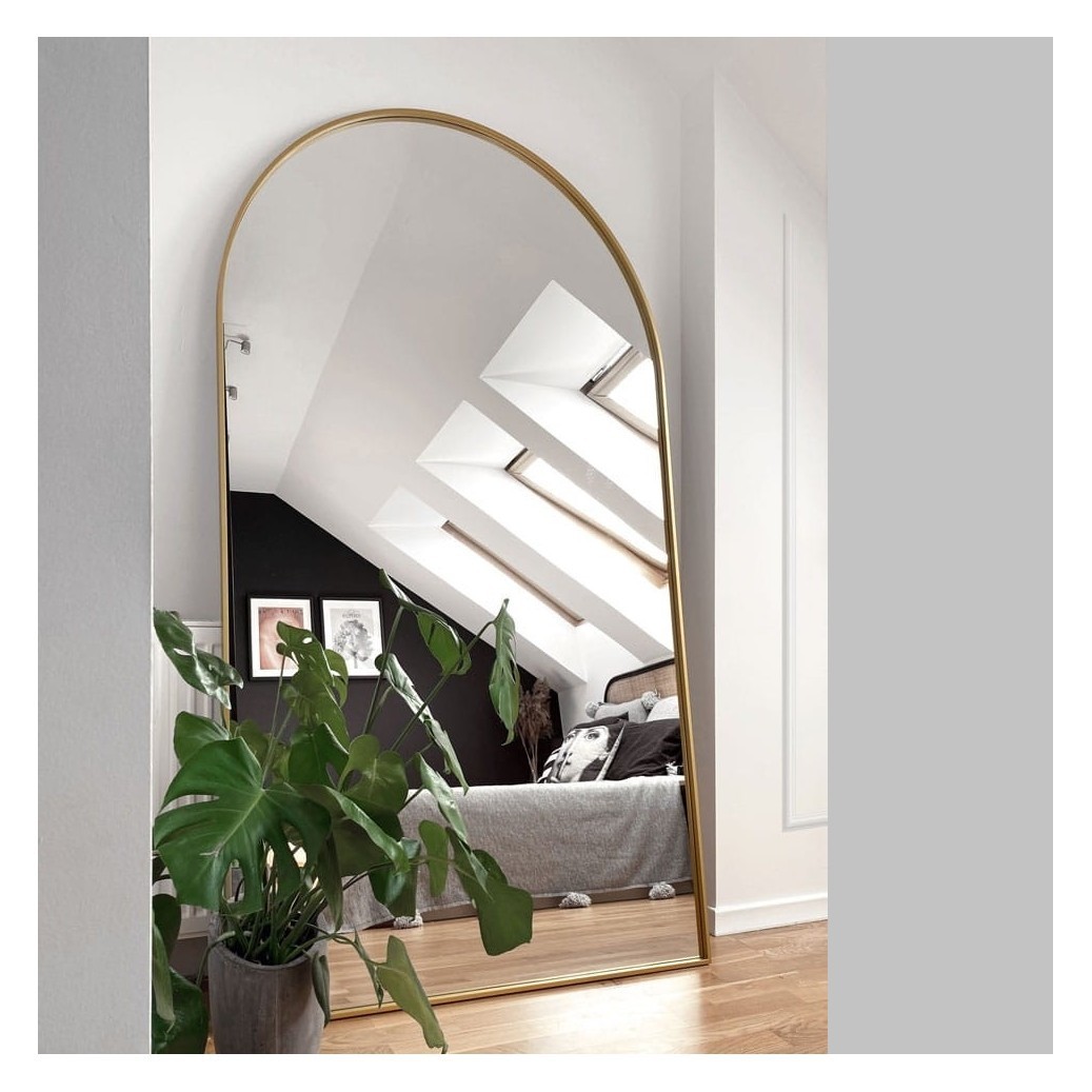 Specchio ad arco con cornice dorata, perfetto per camera da letto, ingresso o soggiorno. Questo specchio a figura intera con cornice sottile oro dona luminosità e profondità agli ambienti. Il design ad arco, elegante e senza tempo, rende questo specchio grande decorativo ideale per arredamenti moderni, classici o minimalisti. La finitura dorata aggiunge un tocco di lusso senza essere invadente. Realizzato in vetro di alta qualità, è perfetto per amplificare la luce naturale e creare un punto focale nella stanza. Una scelta di stile per chi cerca uno specchio elegante e funzionale.