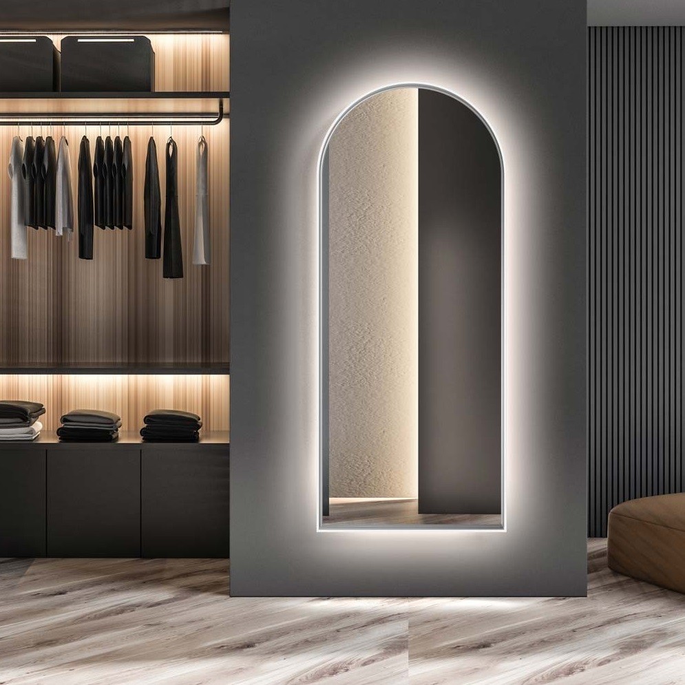 Questo elegante specchio a parete con luce LED integrata ha una forma ad arco moderna, ideale per cabina armadio, camera da letto o ingresso di design. La retroilluminazione LED diffusa crea un effetto luminoso raffinato e funzionale, perfetto per aggiungere profondità e stile agli interni. Lo specchio intero illuminato è realizzato con materiali di alta qualità, garantendo riflessi nitidi e duraturi. La sua cornice minimalista bianca si adatta a spazi contemporanei ed eleganti. Un must per arredamenti moderni.