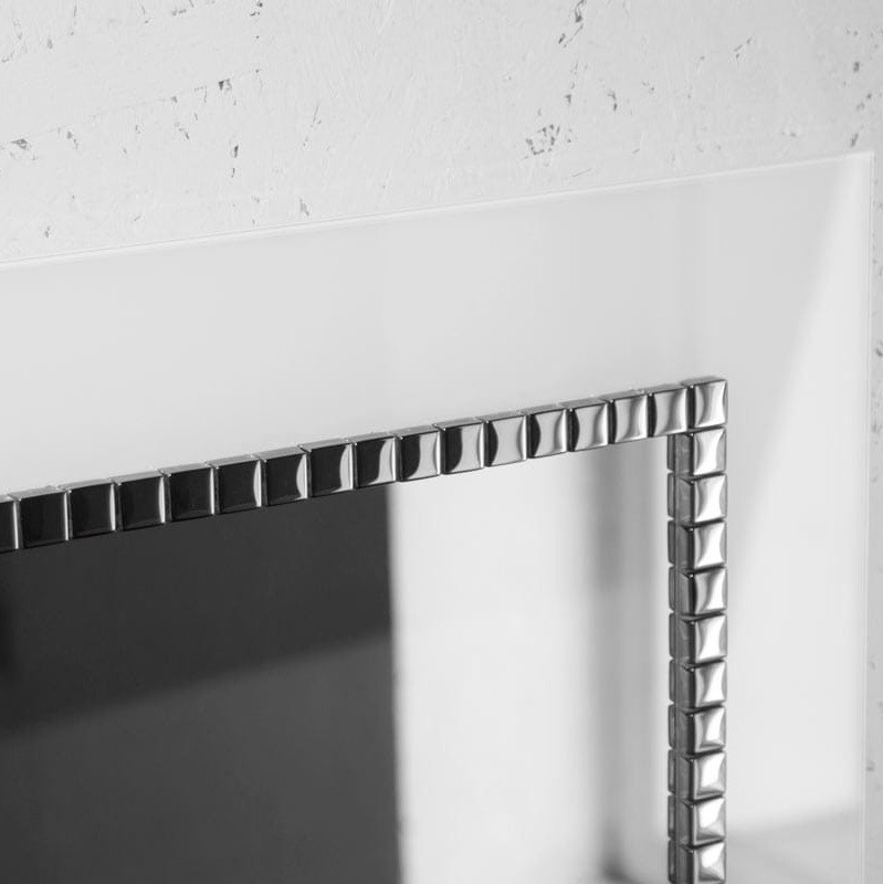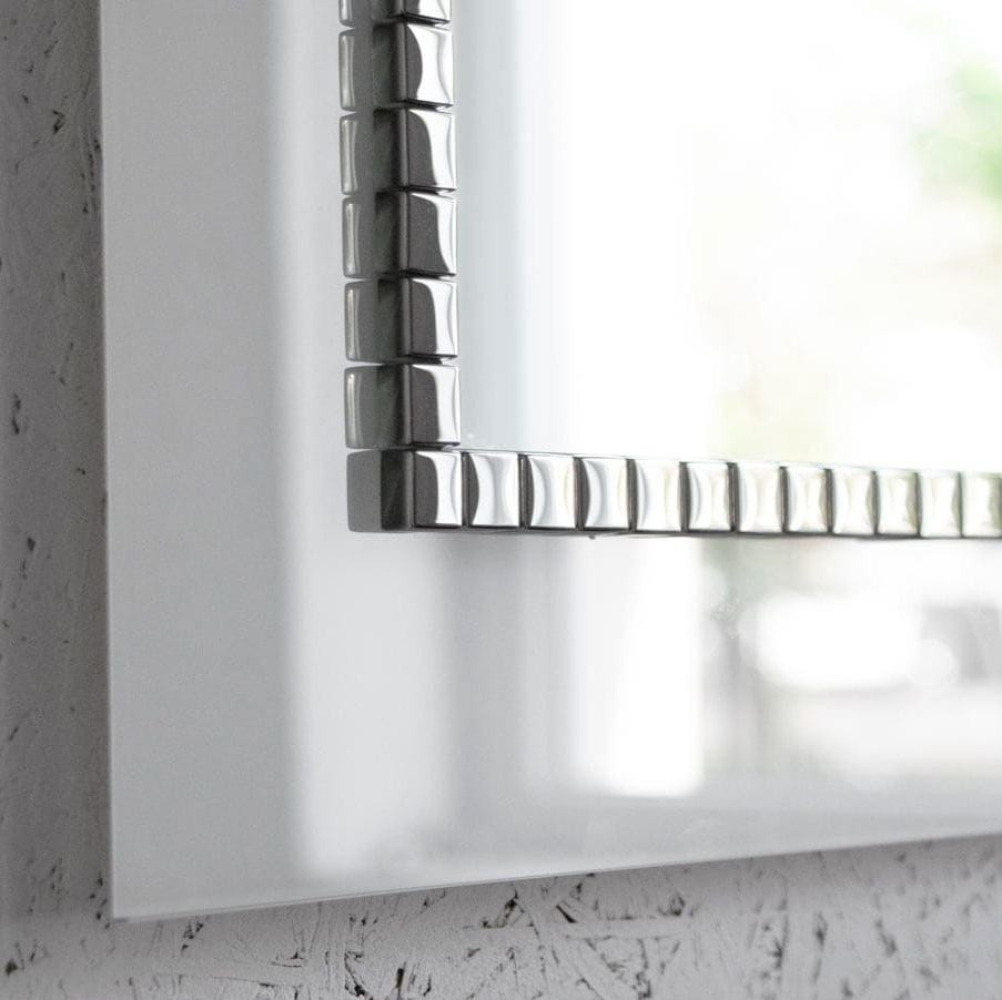Elegante specchio per cabina armadio retroilluminato con cornice in cristallo lacobel bianco decorata con mosaico in vetro argentato. Un pezzo di alto valore decorativo che si combina perfettamente con interni decorati in stile glamour o classico. Senza dubbio, diventerà una parte indispensabile della tua vita quotidiana.