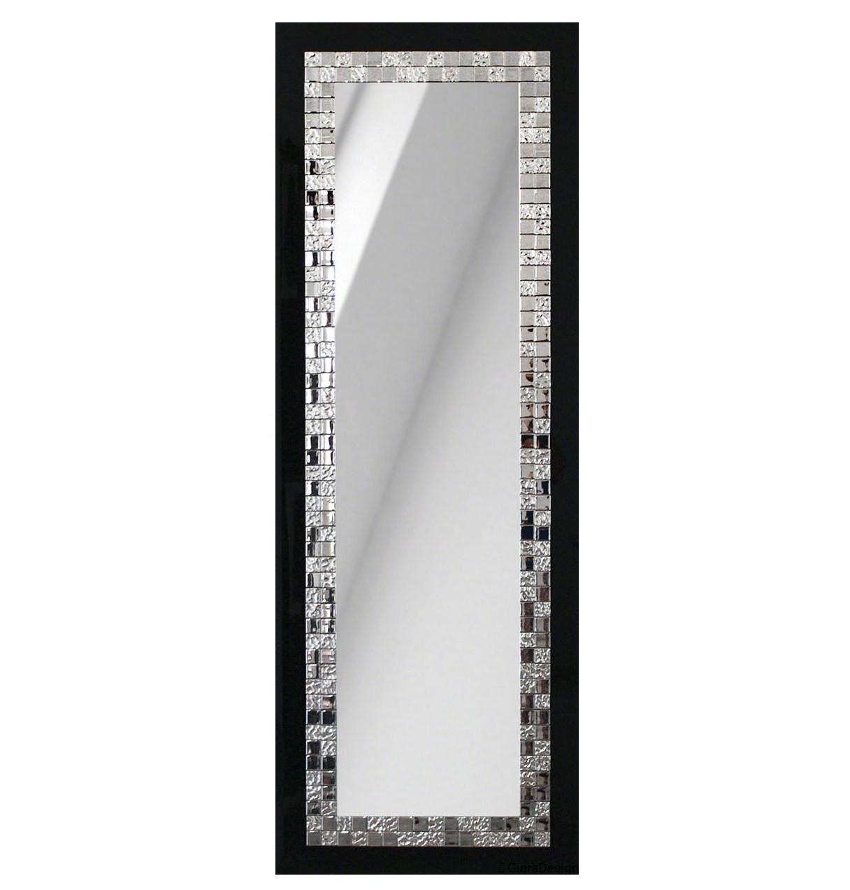 Specchio per cabina armadio con cornice in cristallo Lacobel nero, decorata con mosaici quadrati argentati. Un pezzo eccezionale di alto valore decorativo, che si combina perfettamente con interni decorati in stile glamour, dove si cerca un complemento elegante e raffinato.