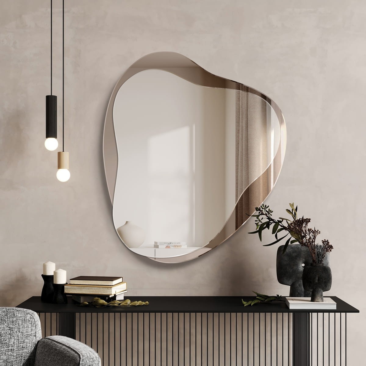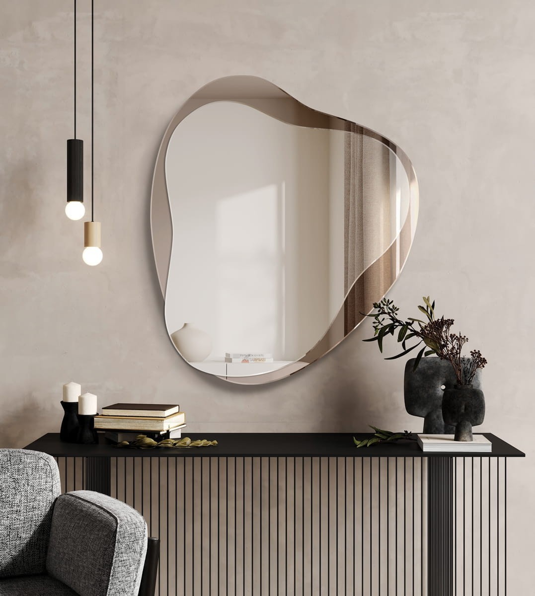 Specchio da parete con cornice in specchio marrone, perfetto per arredare ambienti eleganti e contemporanei. Il bordo riflettente in vetro specchiato color bronzo dona calore e raffinatezza, rendendo questo specchio decorativo moderno ideale per l’ingresso, il soggiorno o la camera da letto. La tonalità marrone specchiata si abbina facilmente a palette neutre o terrose, creando giochi di luce sofisticati. Uno specchio con cornice marrone pensato per chi desidera un complemento d’arredo funzionale ma di grande impatto estetico, che valorizza ogni parete con uno stile ricercato.