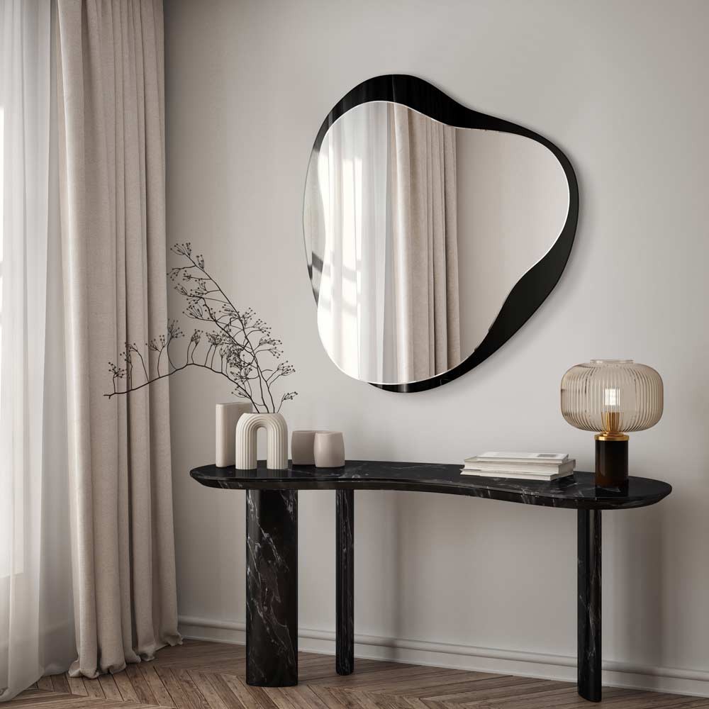 Lo specchio si integra perfettamente negli interni moderni. La cornice irregolare di colore nero attira l'attenzione, rendendolo una decorazione perfetta per un ingresso, il soggiorno, la camera da letto o la sala da pranzo.