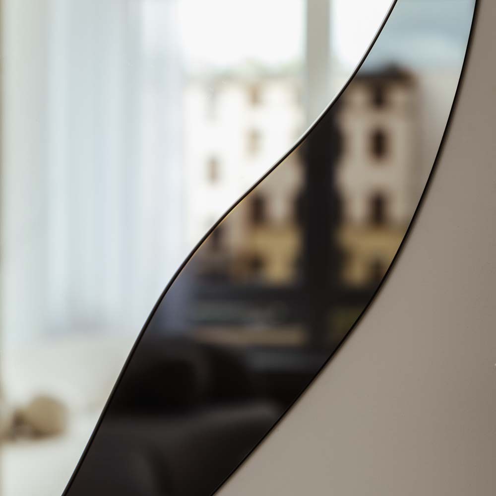 Lo specchio d'ingresso Amo Black, dalla forma irregolare, è un altro modello della collezione Amore. È composto da due pezzi: uno specchio optiwhite e un vetro nero lacobel ai quali è stata conferita una forma organica. La sua forma sensuale evoca tenerezza, cura e unità. Due forme irregolari si fondono, creando una totalità armoniosa. Allo stesso tempo, ognuna di esse evidenzia la propria individualità, proprio come in una relazione di successo.