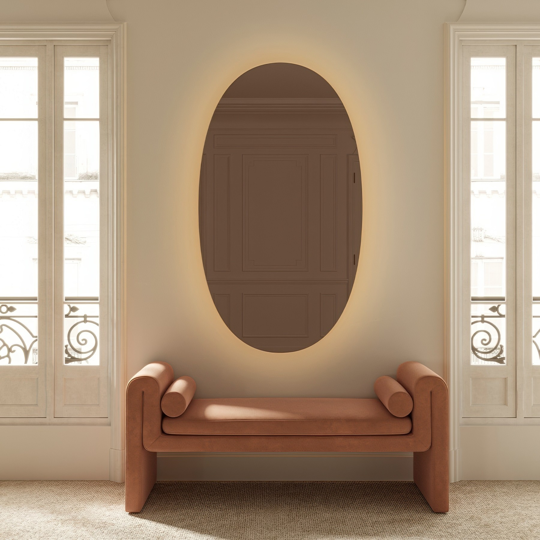 Una delle sue caratteristiche più distintive è che il Brio Bronze L sembra fluttuare leggermente sulla parete. Questa illusione visiva crea un punto focale che cattura ogni sguardo. La forma ovale dello specchio contribuisce a una sensazione generale di fluidità, rendendolo un complemento versatile per diversi stili di interior design.
