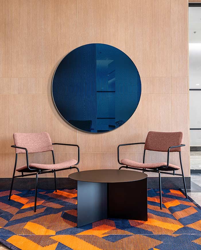 La collezione Cosmic comprende specchi estremamente decorativi ricoperti di motivi derivati dall'op-art. Le righe deformano il riflesso, creando un interessante effetto di interferenza. La stampa rende il riflesso sfocato e sfumato, e alcune aree si oscurano quando si guarda da un angolo specifico. Gli specchi e la loro atmosfera richiamano i pianeti.