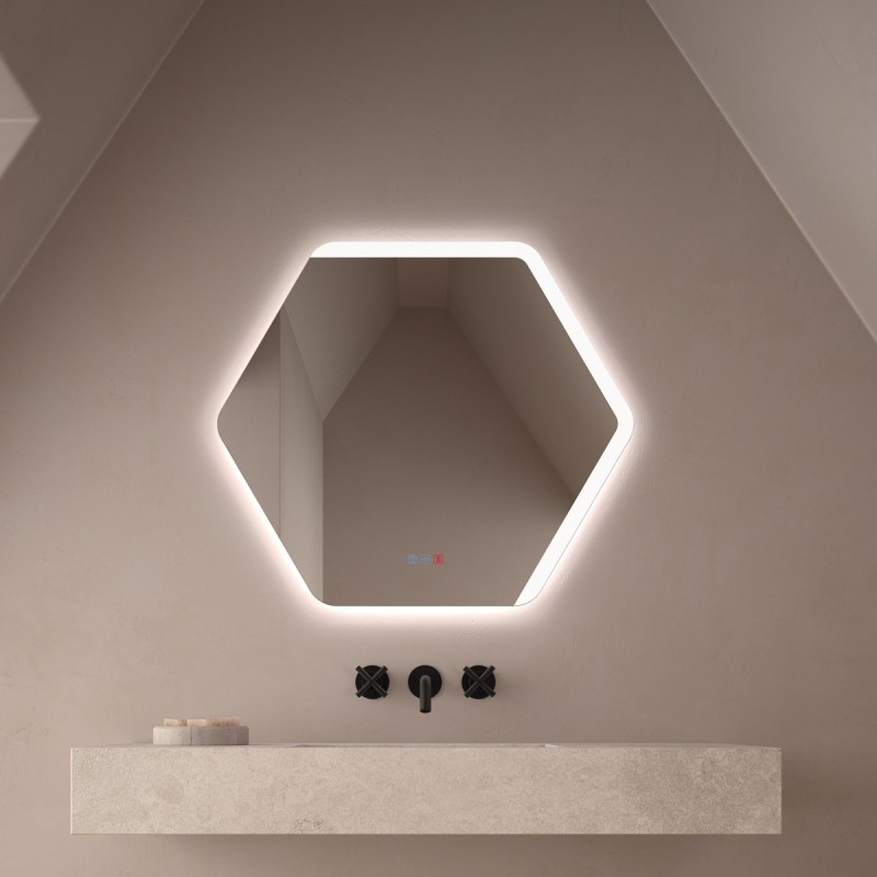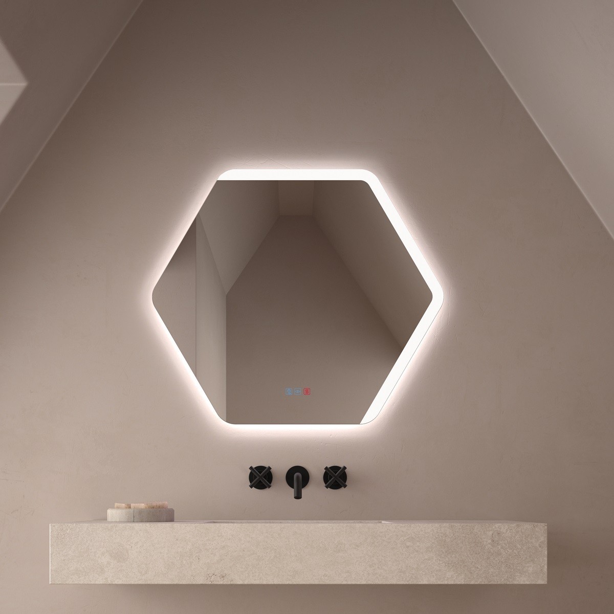 Questo specchio esagonale retroilluminato LED è un complemento di design esclusivo che dona carattere e modernità al bagno. La forma geometrica esagonale, abbinata alla retroilluminazione LED, crea un effetto luminoso suggestivo e funzionale, perfetto per valorizzare lo spazio. Realizzato in cristallo di alta qualità, offre nitidezza e resistenza, garantendo praticità e lunga durata. Lo specchio bagno moderno con illuminazione integrata si adatta ad ambienti minimal, contemporanei o di design, trasformando la zona lavabo in un punto focale elegante e originale.