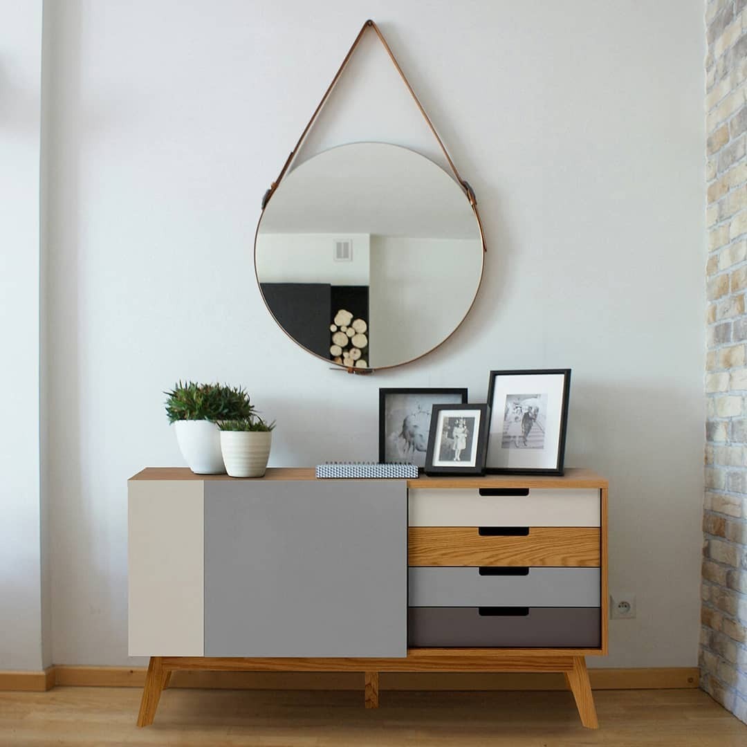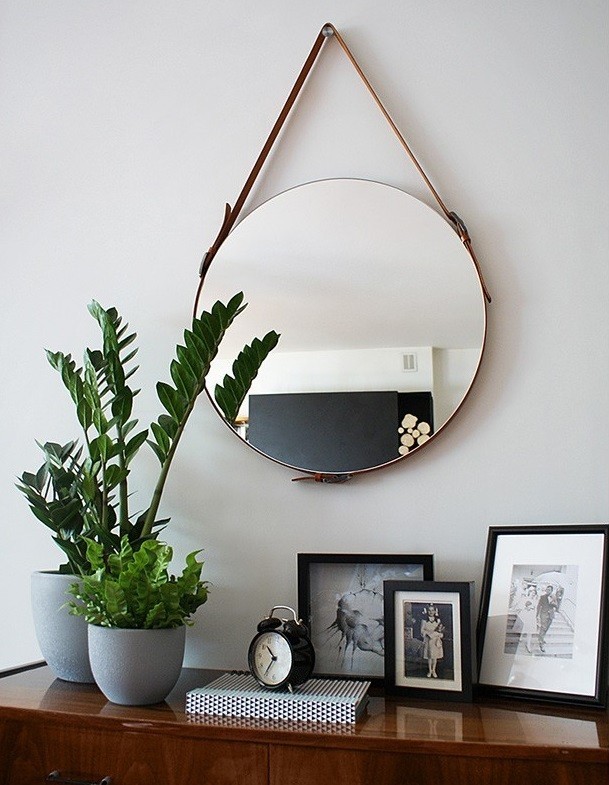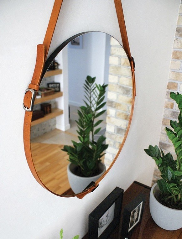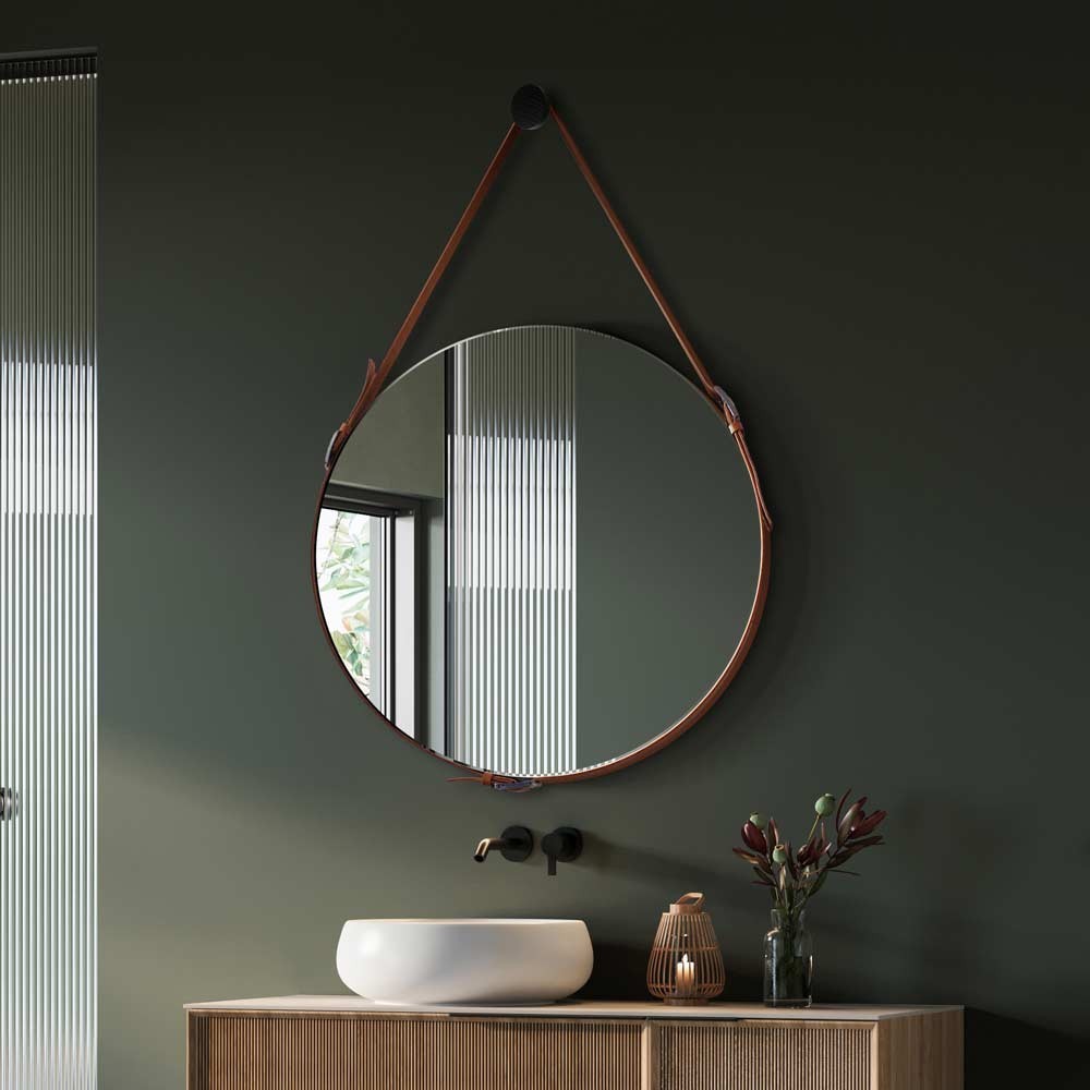 Specchio rotondo stile scandinavo con cinghia in pelle con cerniere. Il suo design contribuisce notevolmente a dare un'impressione di equilibrio e buon gusto decorativo. Lo specchio Eclecti è un'autentica tendenza, ideale per aggiungere un tocco accogliente al tuo soggiorno, sala da pranzo, camera da letto o ingresso.