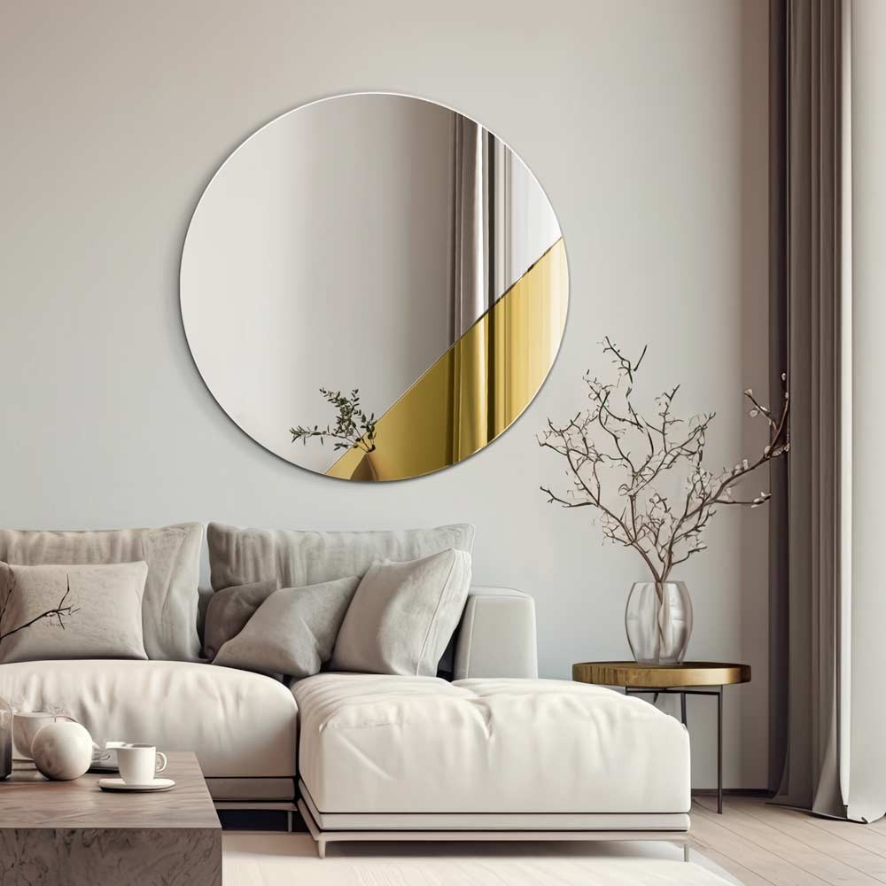 Specchio rotondo con inserto dorato, dal design geometrico e contemporaneo. Perfetto per arredare soggiorni moderni, camere da letto o ingressi con un tocco sofisticato. L’elemento dorato a contrasto crea un gioco visivo elegante e originale, riflettendo la luce e aggiungendo calore all’ambiente. Questo specchio decorativo unisce estetica e funzionalità, ideale per spazi in stile minimal, moderno o glamour. Un complemento raffinato che dona profondità e stile alla parete con una presenza scenica unica.