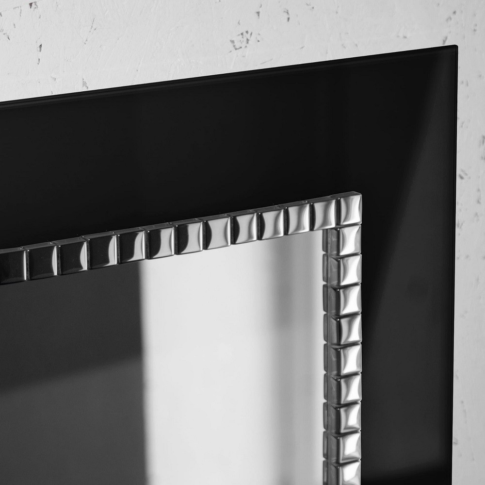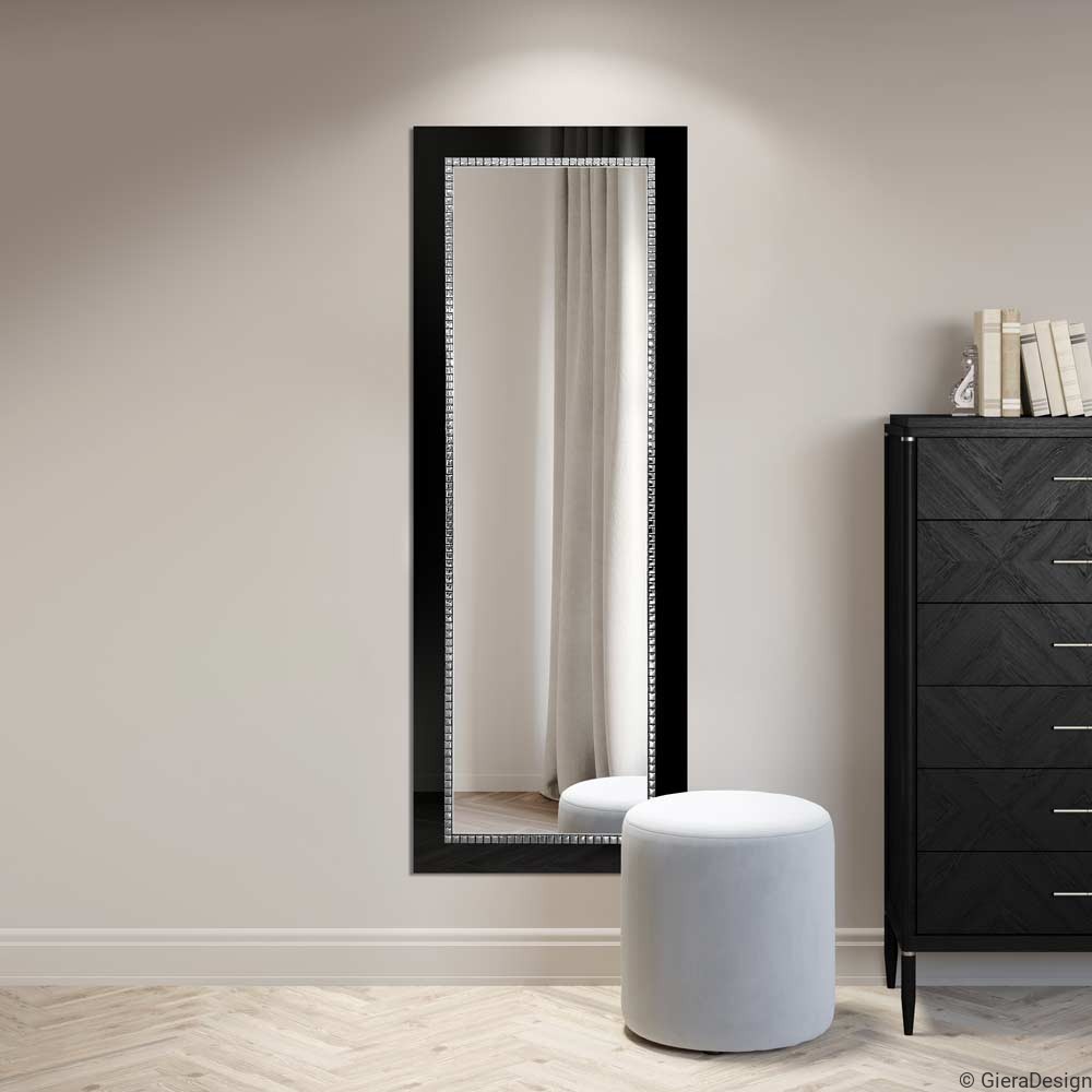 Elegante specchio per cabina armadio retroilluminato con cornice in vetro lacobel di colore nero decorato con mosaico di vetro argentato. Un pezzo di alto valore decorativo che si combina perfettamente con interni arredati con glamour o stile classico. Senza dubbio diventerà un elemento indispensabile nella tua vita quotidiana.