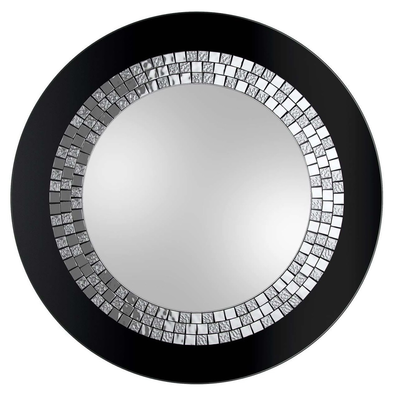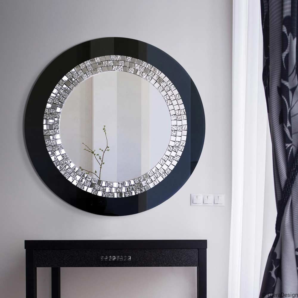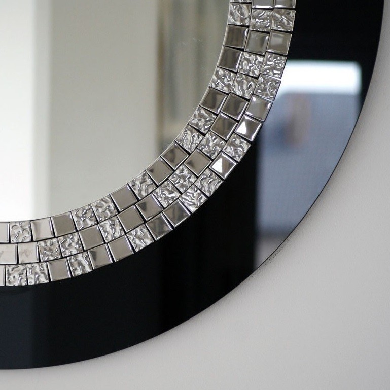 Specchio rotondo decorativo con cornice in cristallo Lacobel nero, decorata con mosaici quadrati argentati. Un pezzo eccezionale di alto valore decorativo che si combina perfettamente con interni decorati in stile glamour, dove si cerca un complemento elegante e raffinato. Perfetto per abbellire la parete di un soggiorno, ingresso, atrio o camera da letto.