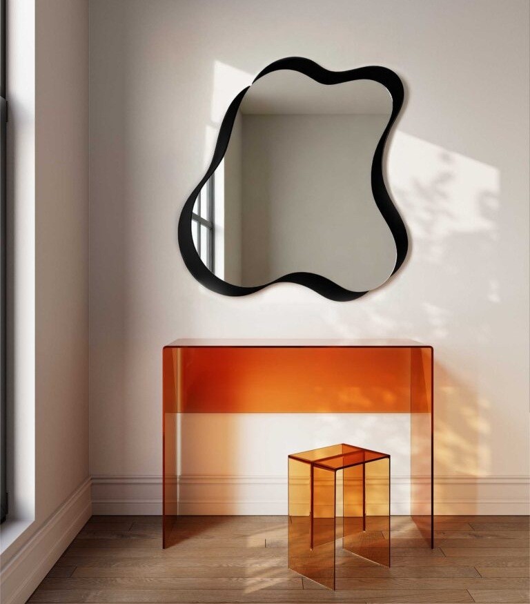 Perfetto come specchio moderno per bagno, si abbina magnificamente a rubinetterie nere, rivestimenti verticali e ambienti minimal o di design. La cornice sagomata nera valorizza la silhouette irregolare, trasformando lo specchio in un vero elemento decorativo.
