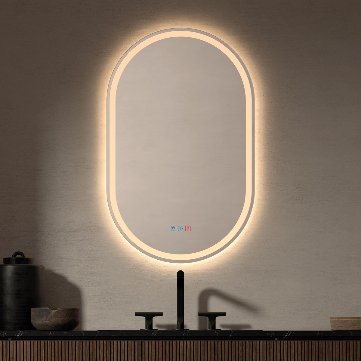 Specchio ovale retroilluminato con luce LED bianca naturale, ideale per bagni moderni e raffinati. Il suo design pulito con contorno interno luminoso offre una perfetta combinazione di eleganza e funzionalità. Dotato di interruttore touch, funzione antiappannamento e sistema a basso consumo energetico, garantisce comfort e praticità ogni giorno. La forma ovale allungata crea un effetto visivo armonioso che valorizza qualsiasi spazio.