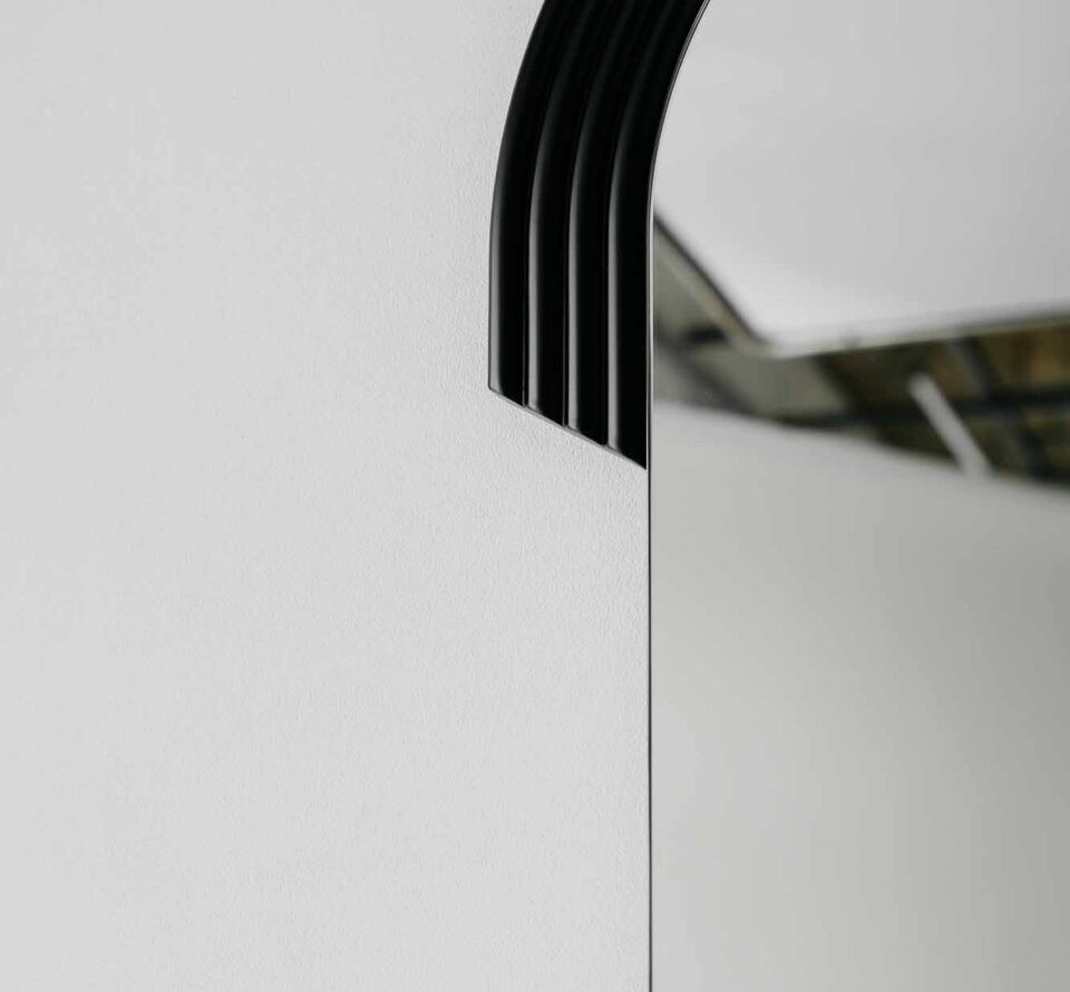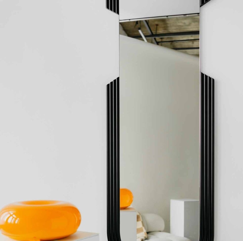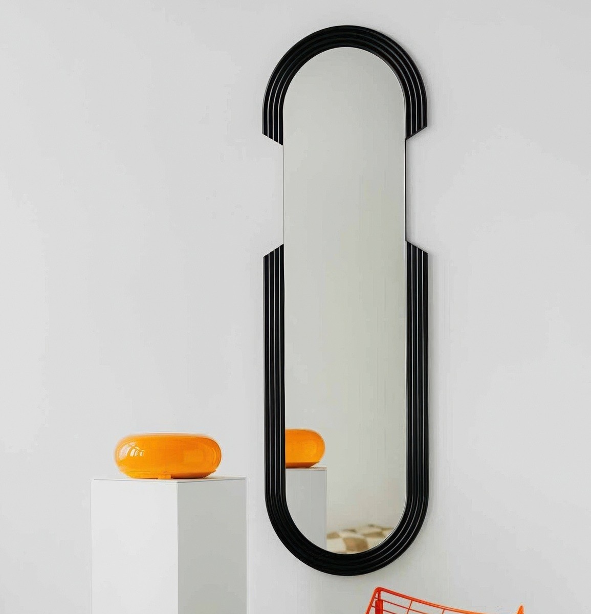 Specchio da camera da letto con cornice nera in stile art déco. Il modello “Decò Curve” combina eleganza retrò e linee moderne, ideale per arredare con personalità la zona notte. La cornice nera con scanalature dona profondità visiva e un tocco grafico deciso, perfetto per interni minimal, industrial o contemporanei. Questo specchio ovale allungato da parete unisce funzionalità e design, valorizzando ogni angolo della camera da letto con carattere e raffinatezza.