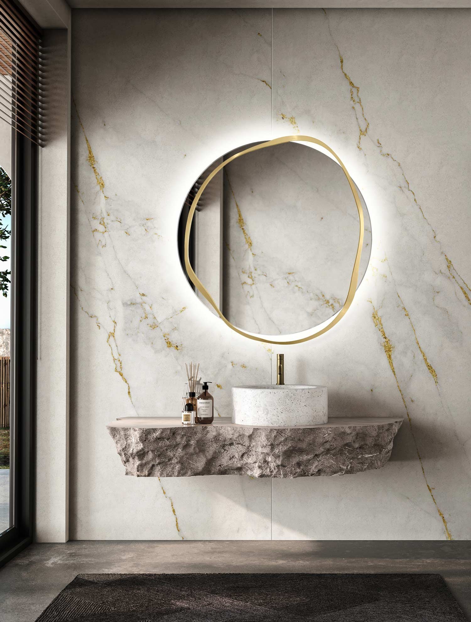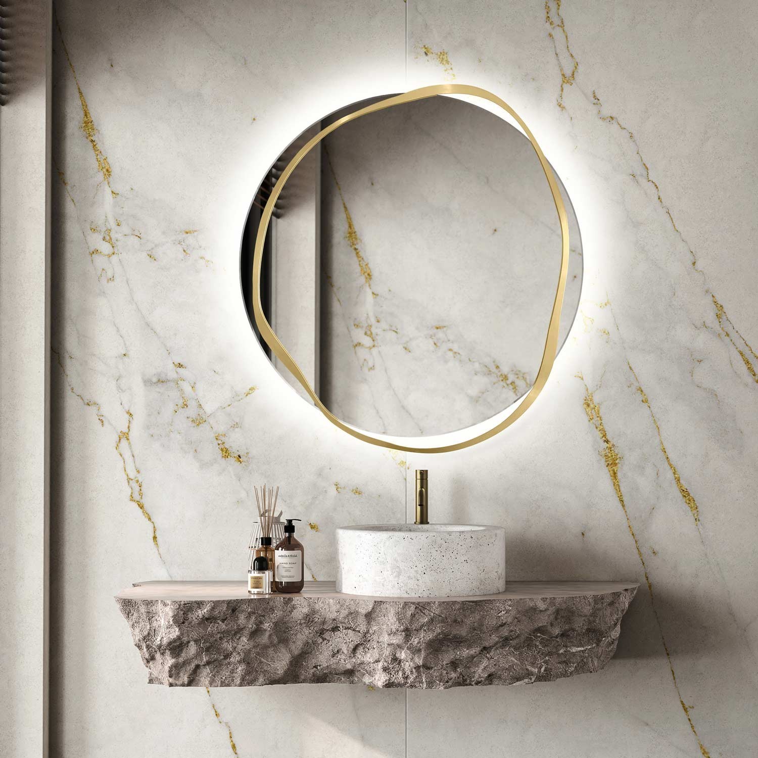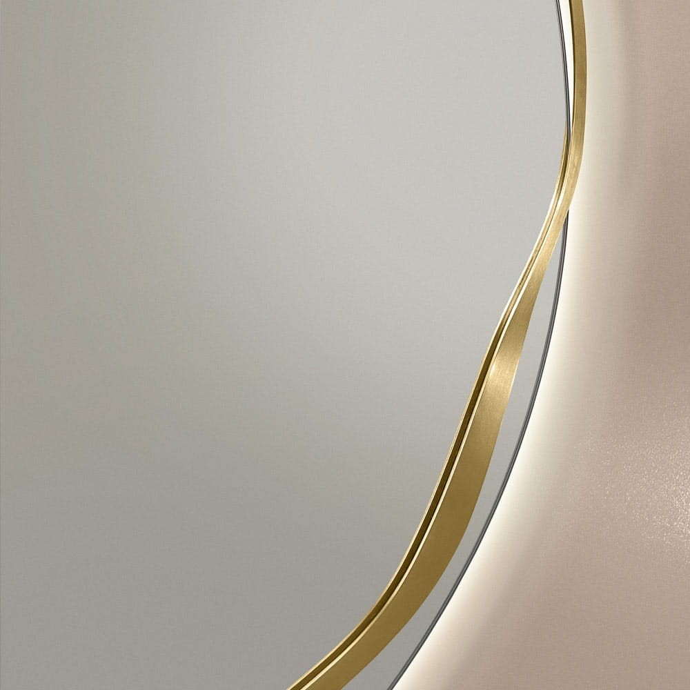 Un ulteriore valore aggiunto è l'illuminazione della superficie dello specchio, che fa sembrare la banda ondulata di ottone sospesa nello spazio. La luce soffusa evidenzia la texture irregolare e la lucentezza naturale dell'ottone, creando un effetto visivo unico. Questo specchio non ha solo un valore pratico, ma grazie al suo design non convenzionale, diventa il punto focale decorativo della stanza. È ideale come decorazione originale per il soggiorno, la camera da letto o l'ingresso, ed è adatto anche per il bagno, poiché tutti gli elementi dello specchio sono protetti contro l'umidità e la corrosione.